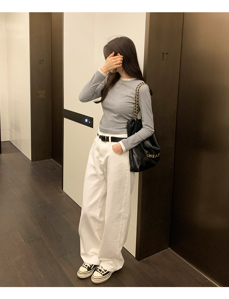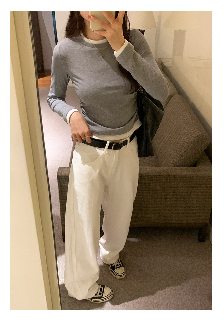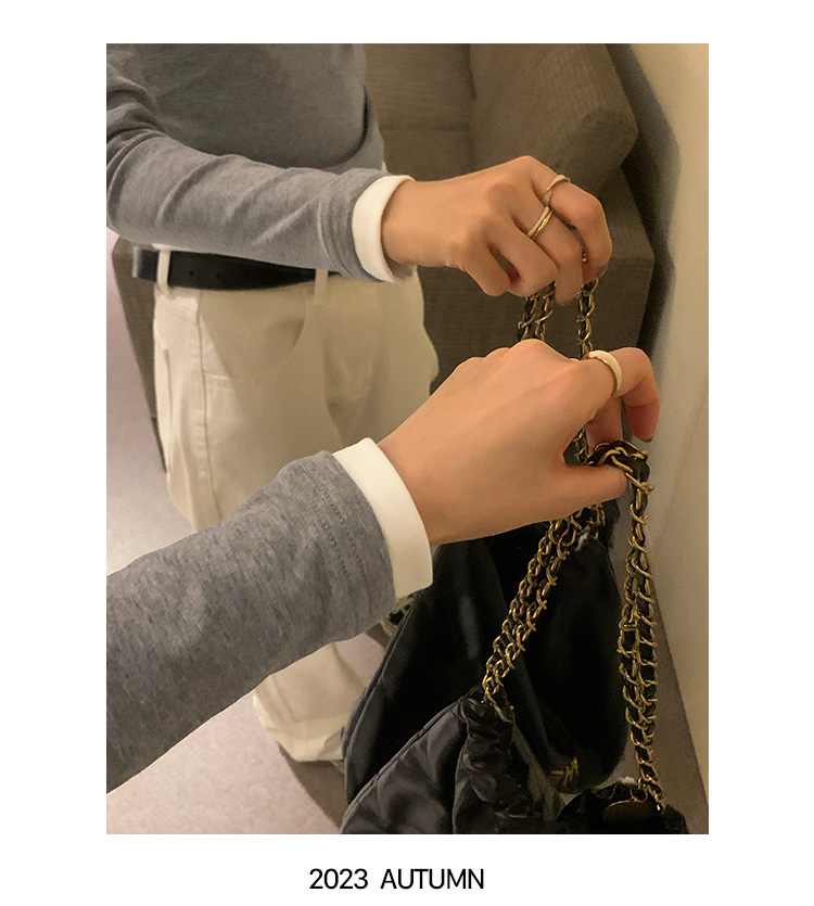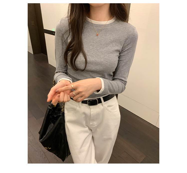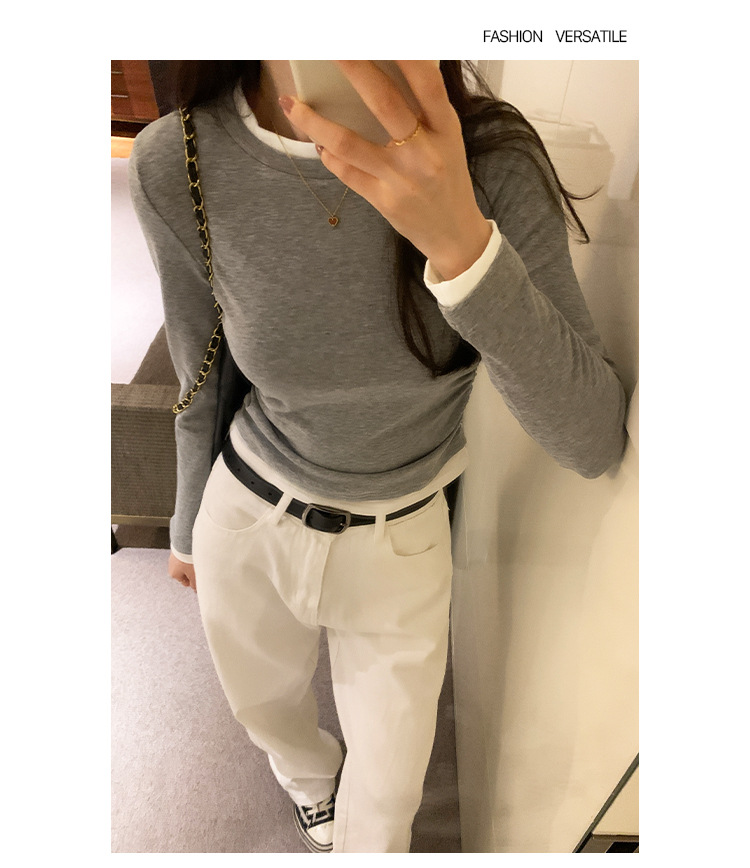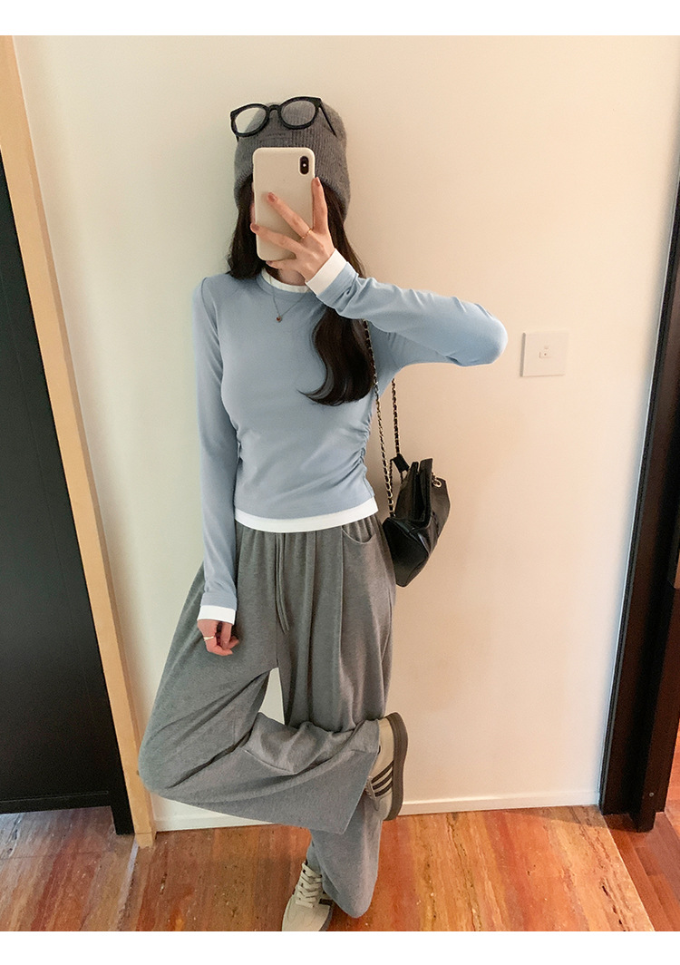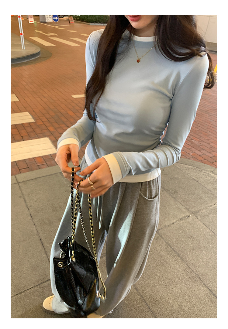 JMA-765 圆领休闲撞色假两件上衣女冬新款褶皱短款百搭长袖T恤