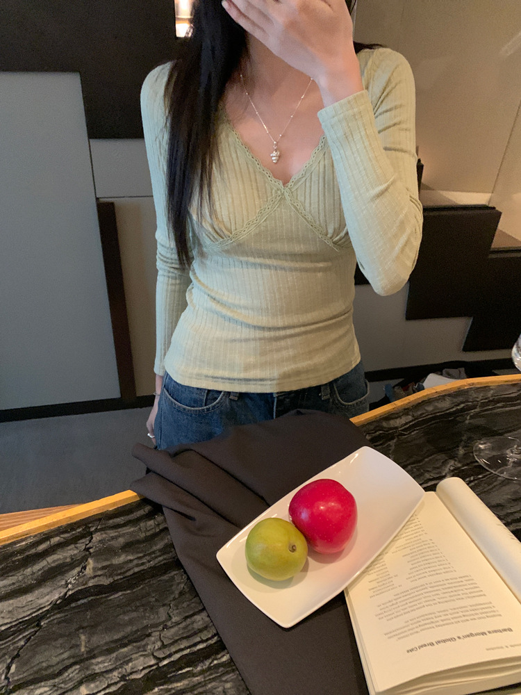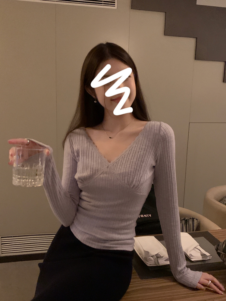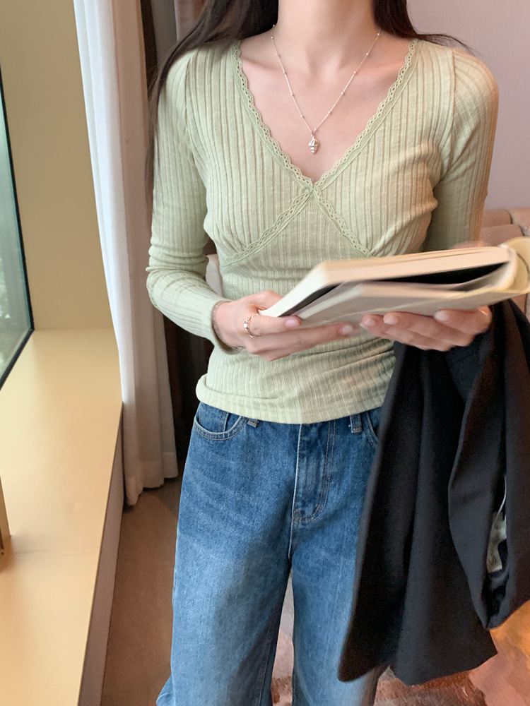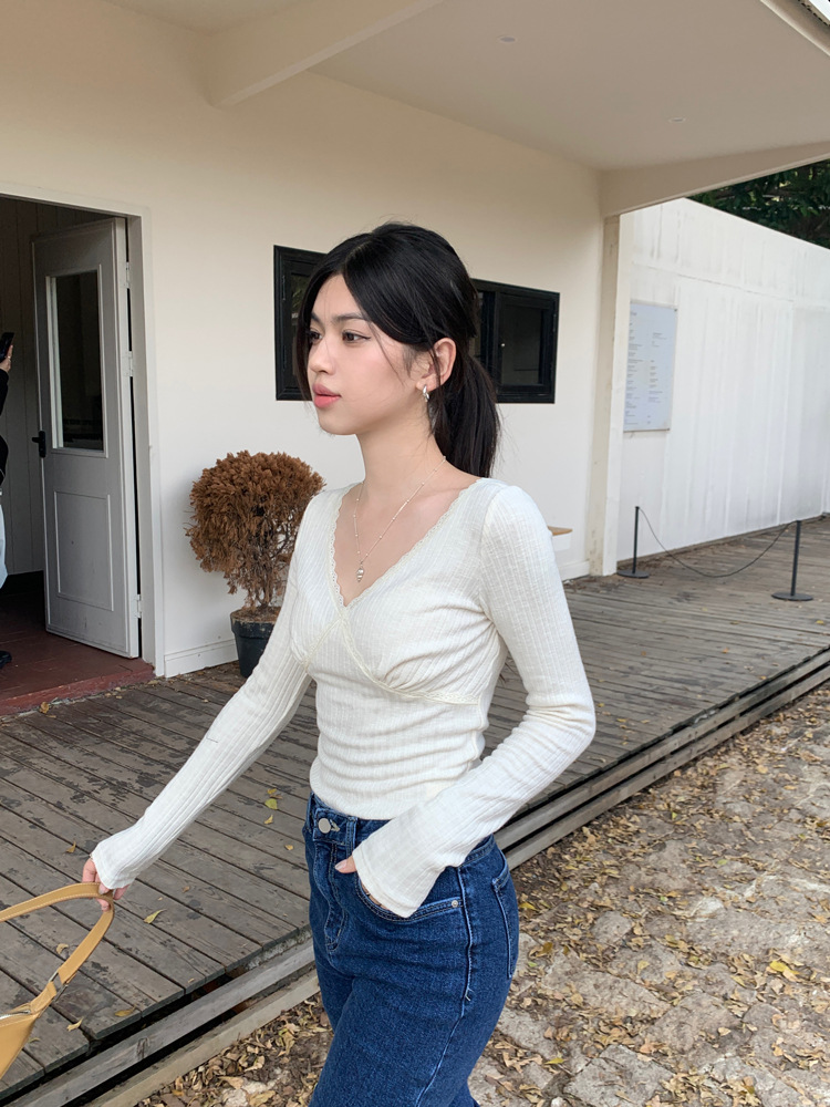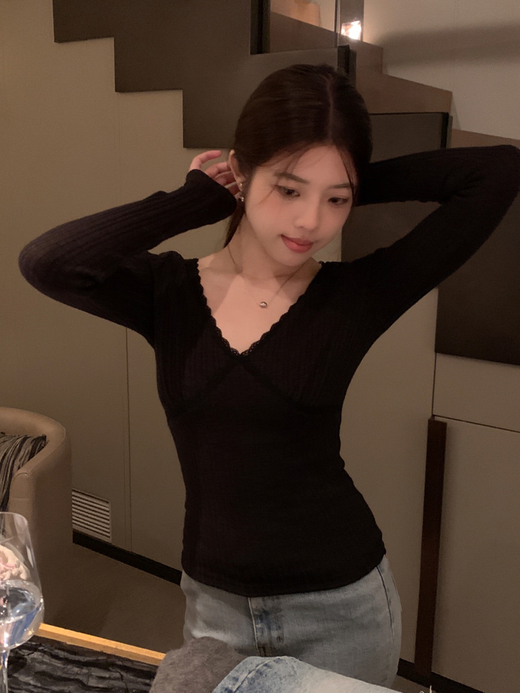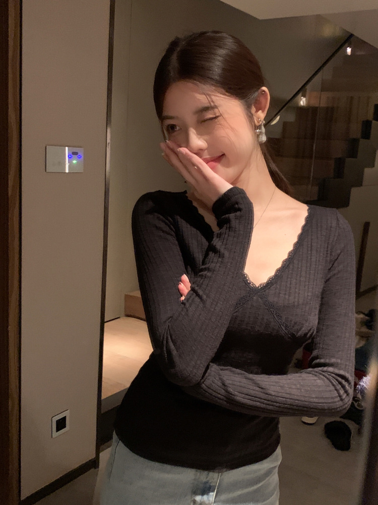 JMA-768 法式内搭蕾丝花边长袖T恤女早春新款显瘦v领修身打底衫