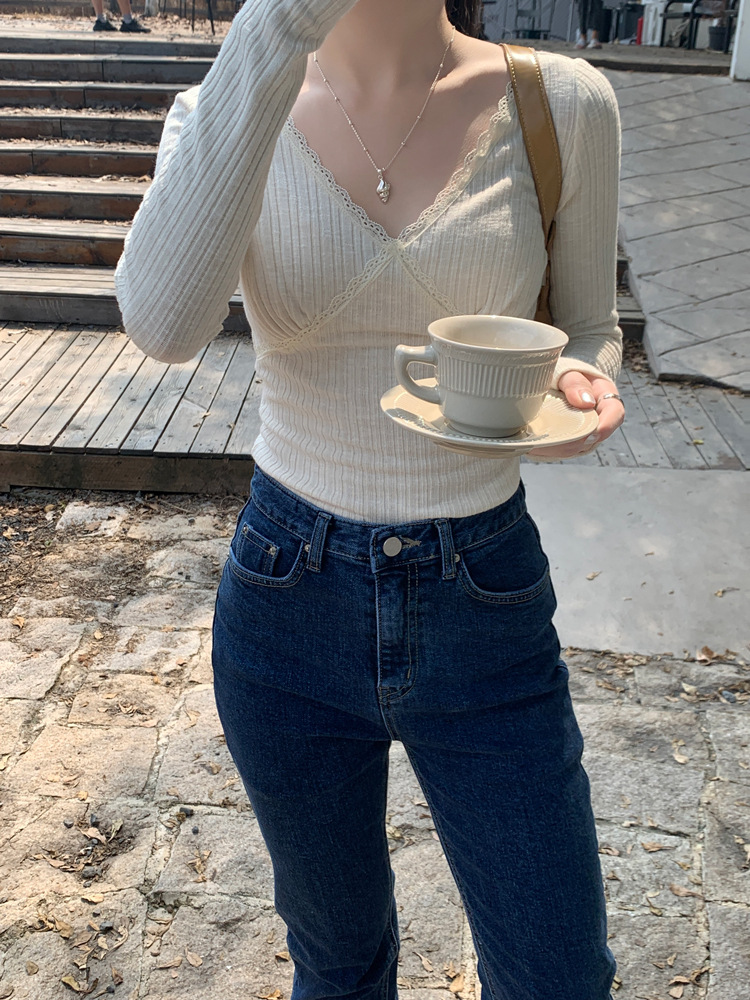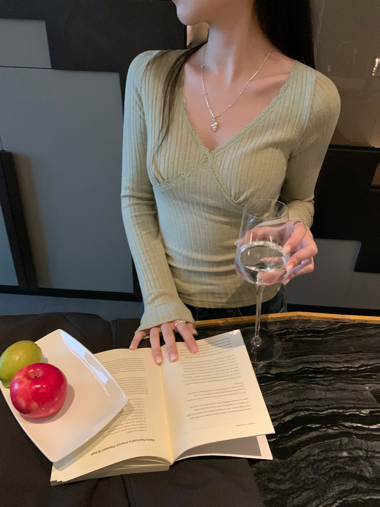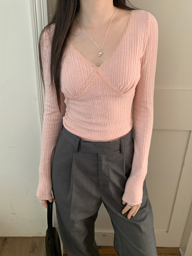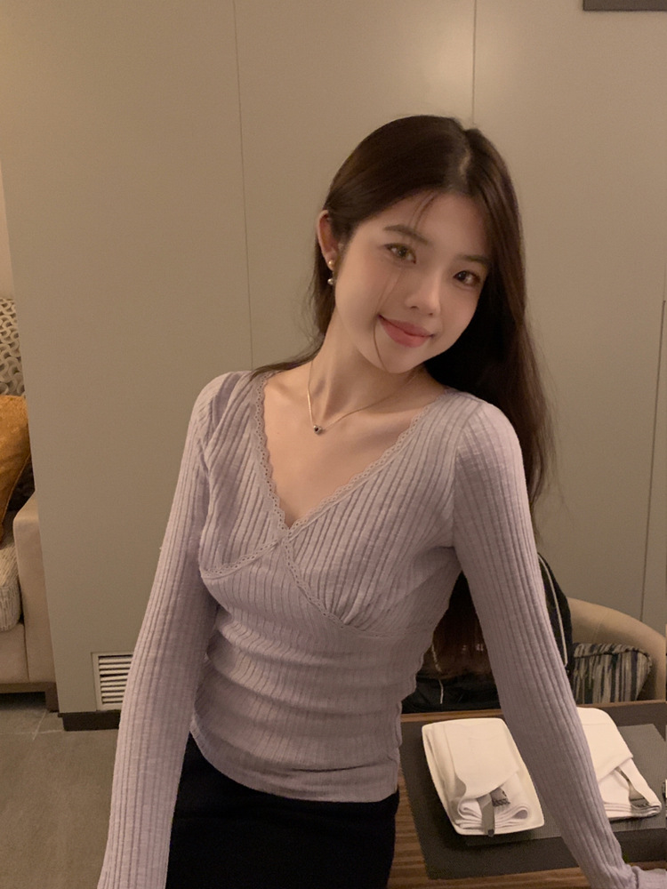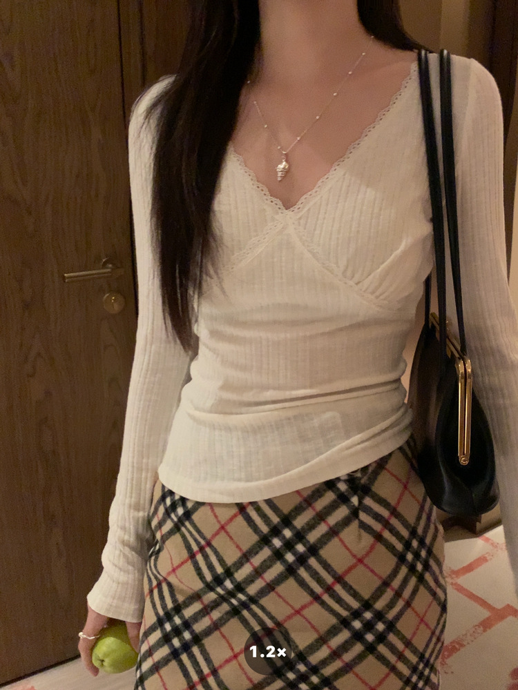 JMA-768 法式内搭蕾丝花边长袖T恤女早春新款显瘦v领修身打底衫