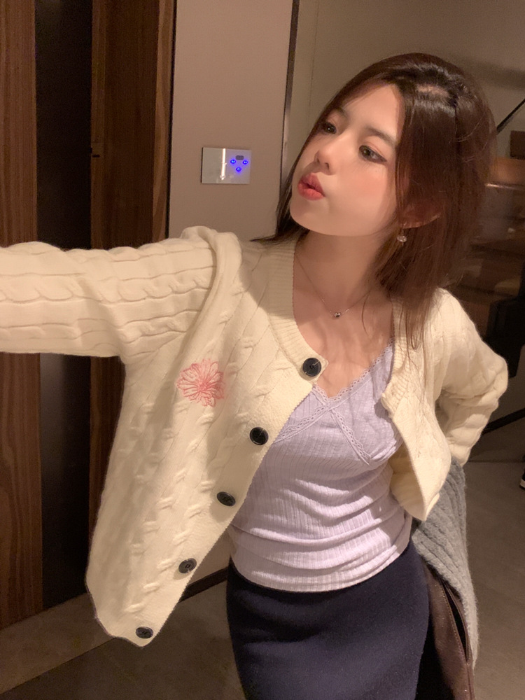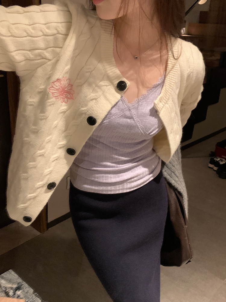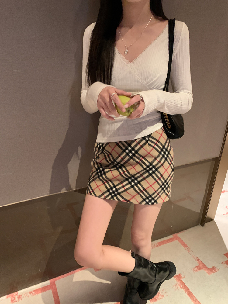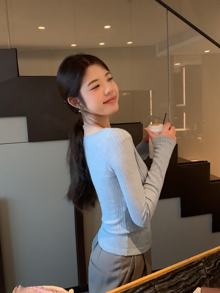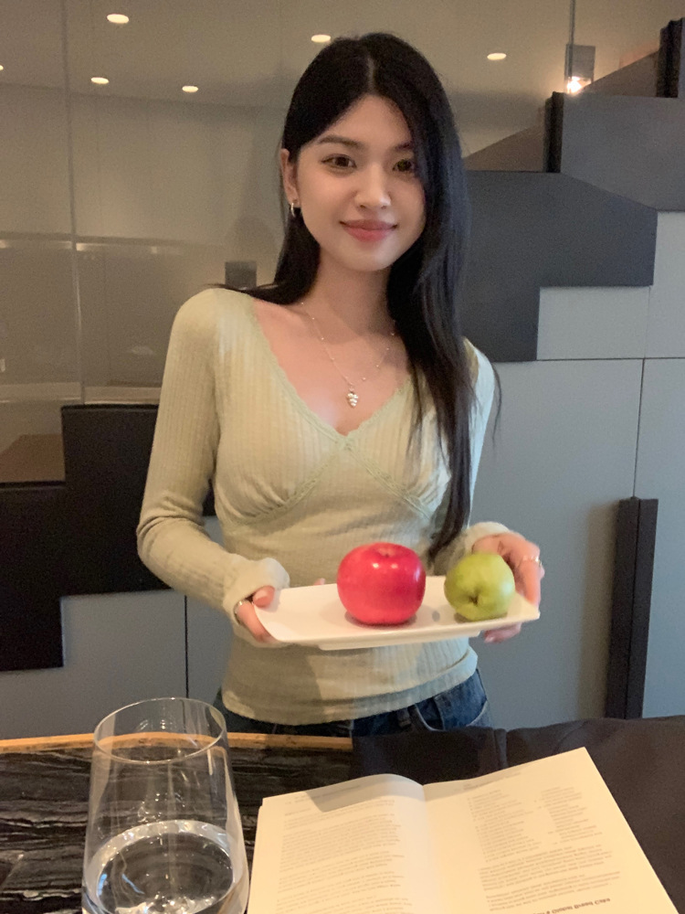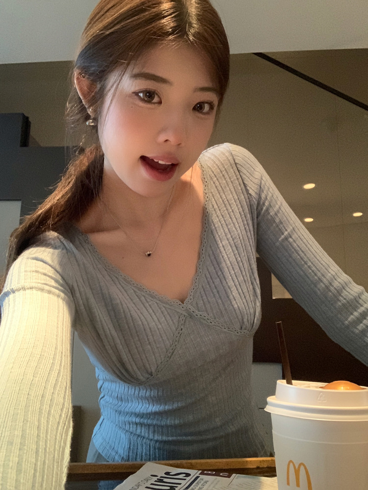 JMA-768 法式内搭蕾丝花边长袖T恤女早春新款显瘦v领修身打底衫