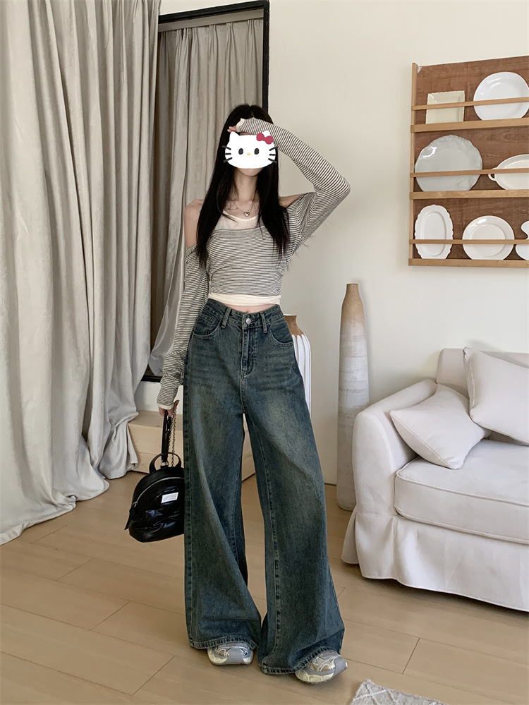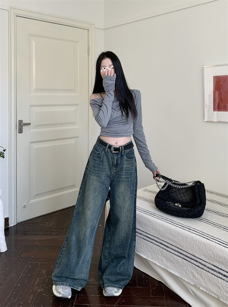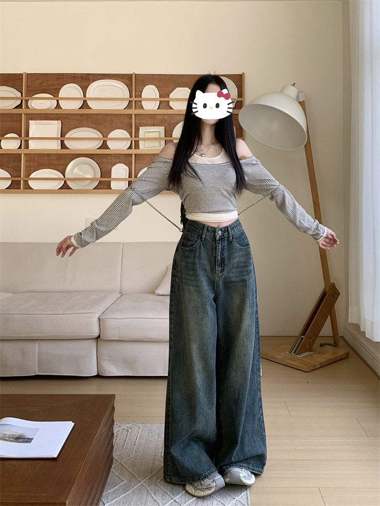 JMA-776 美式复古牛仔裤女高腰宽松阔腿直筒垂感拖地长裤