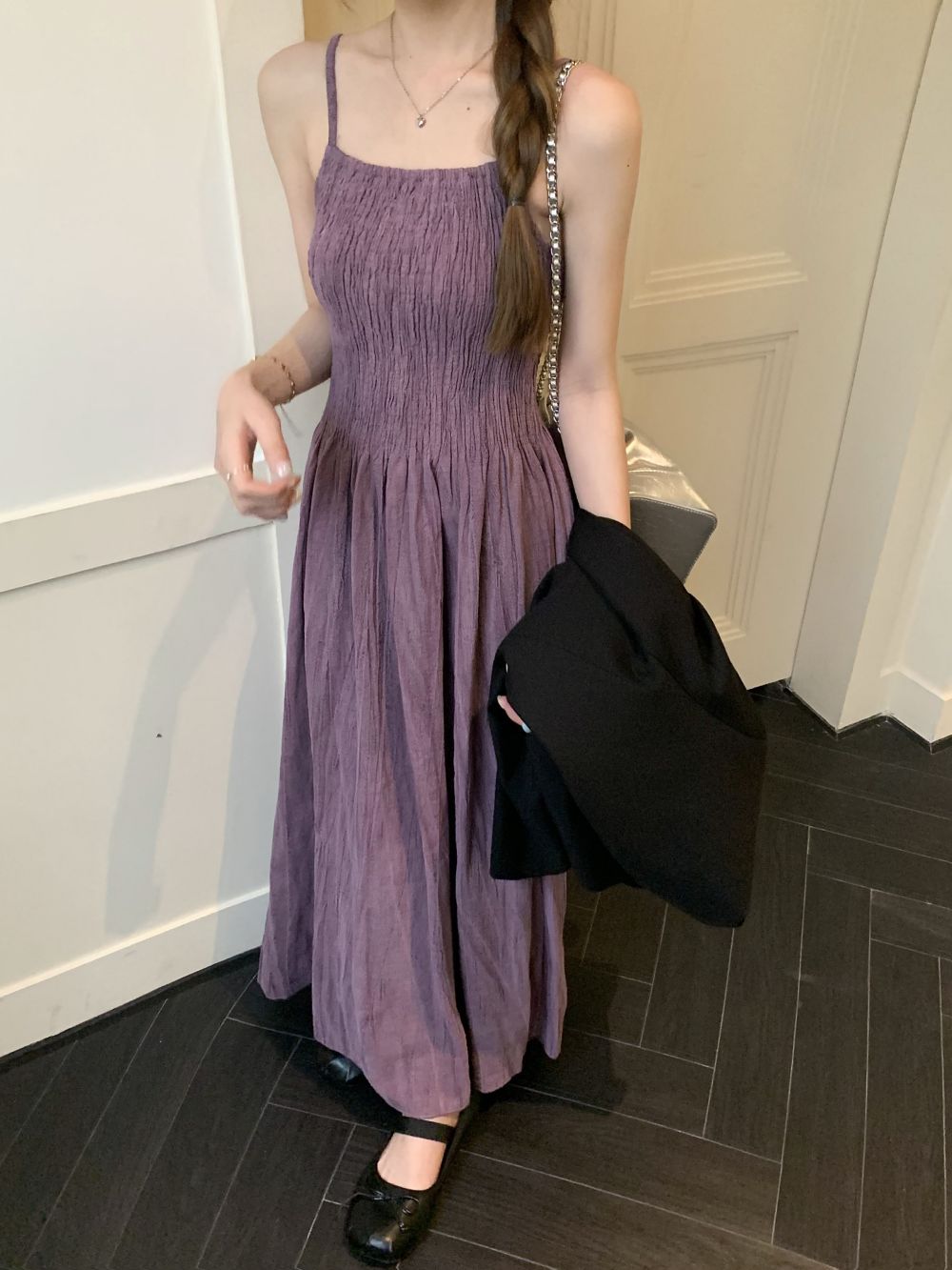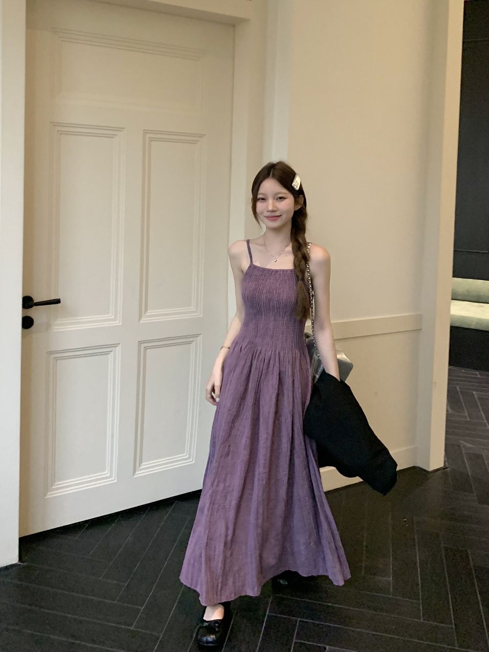 JMA-801 紫色吊带连衣裙女新款韩版度假风收腰气质A字裙长裙