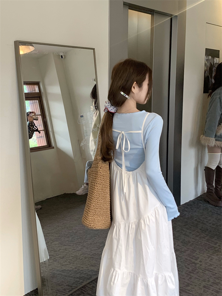 JMA-804 实拍!不规则拼接吊带连衣裙+波浪边甜美长袖t恤打底上衣套装