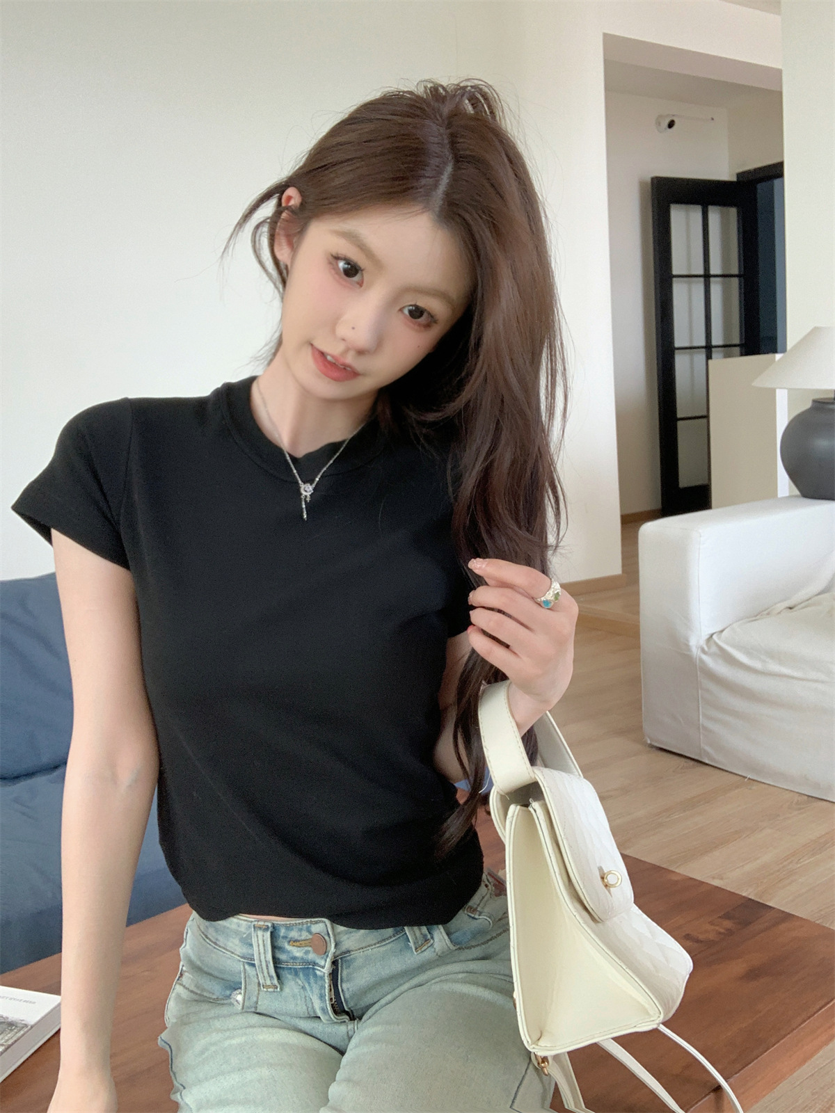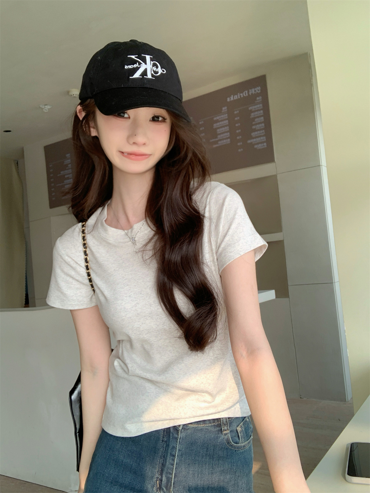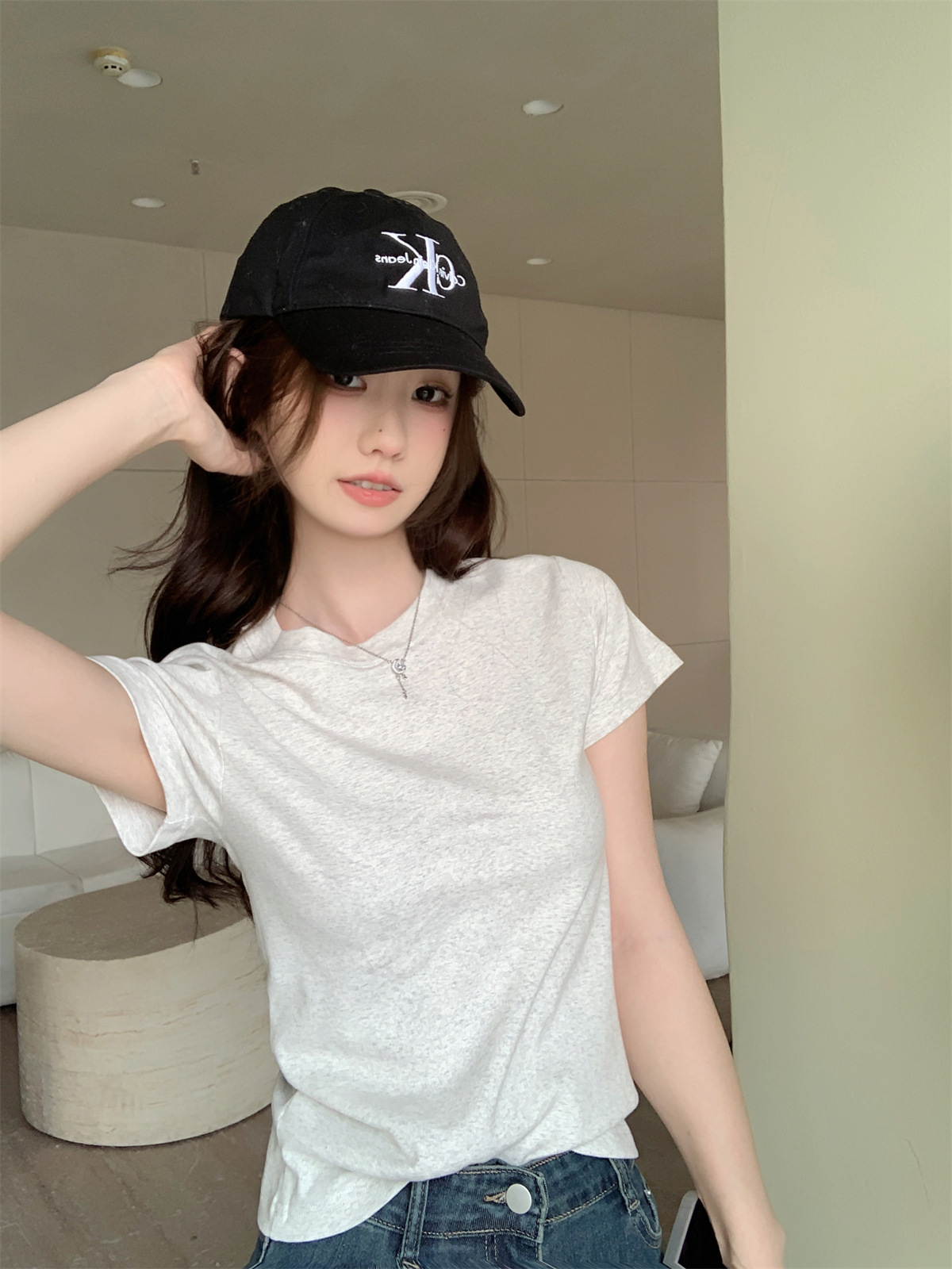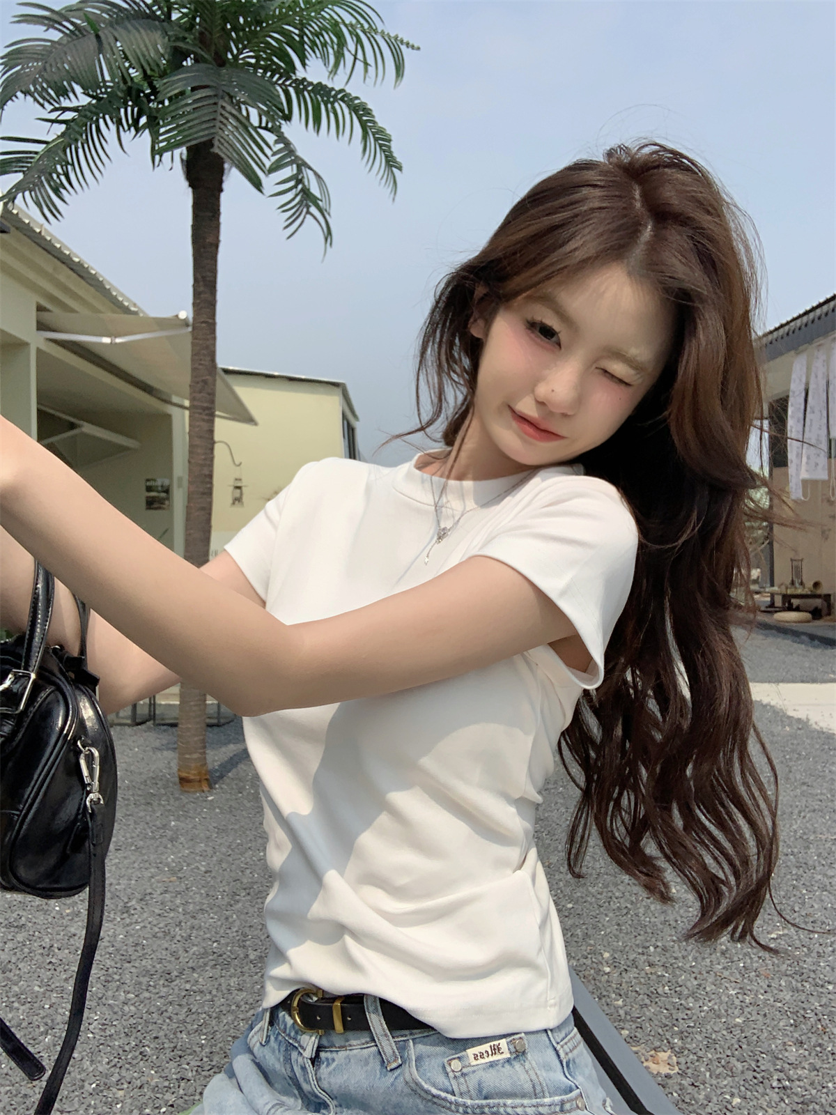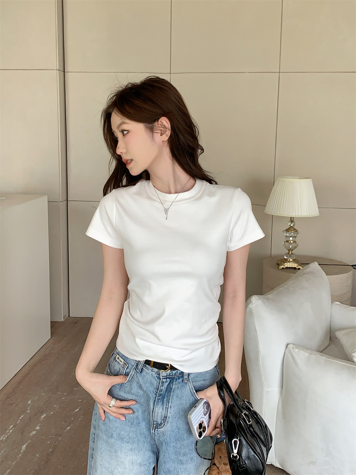 JMA-805 实拍 美式辣妹修身正肩圆领短袖T恤2024夏季白色纯棉简约百搭上衣
