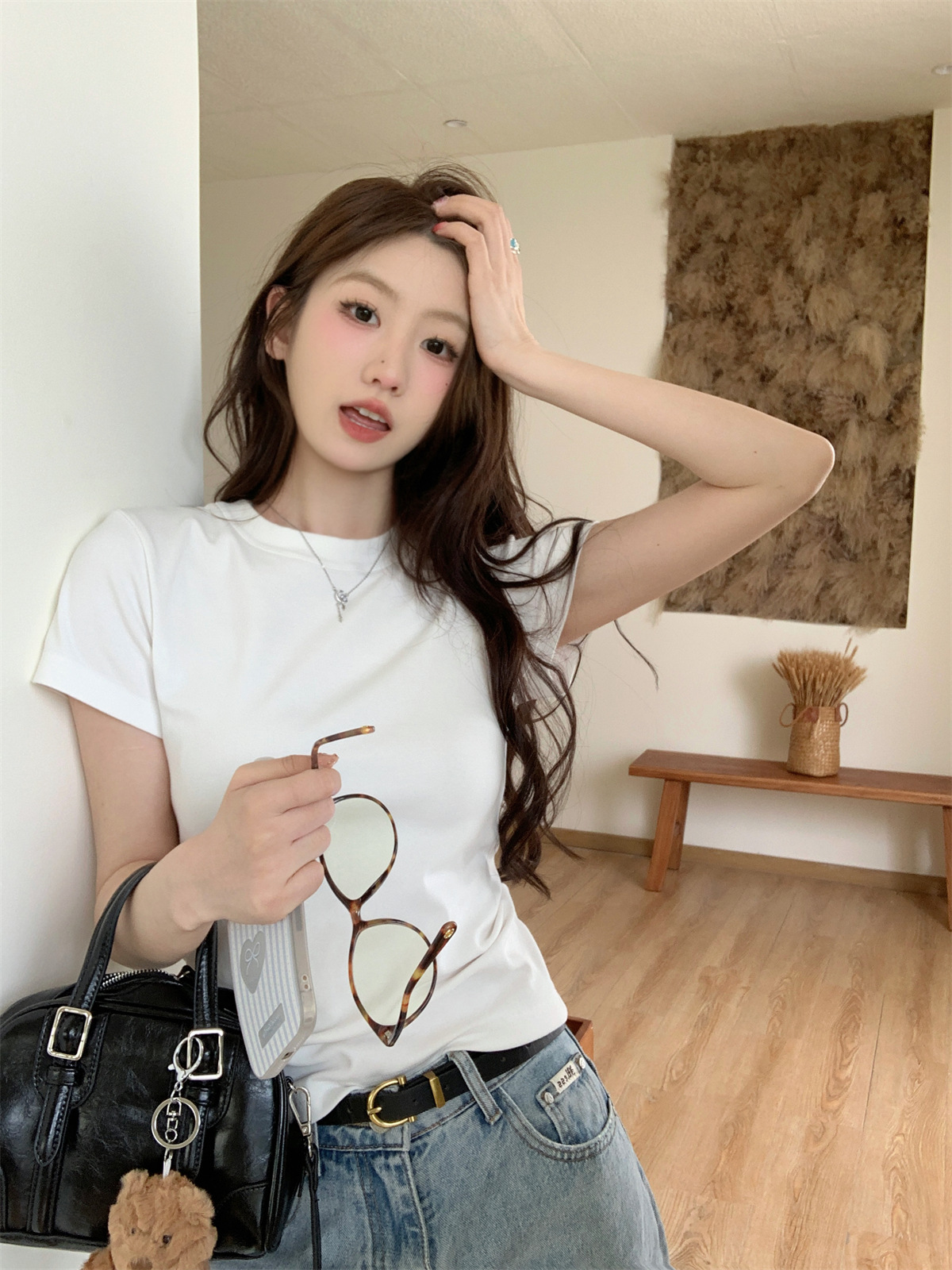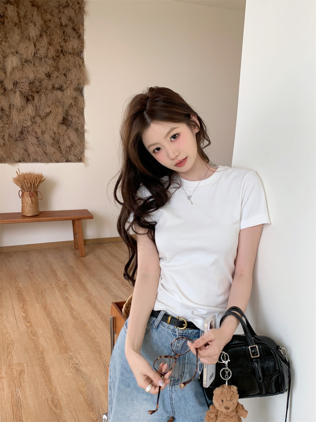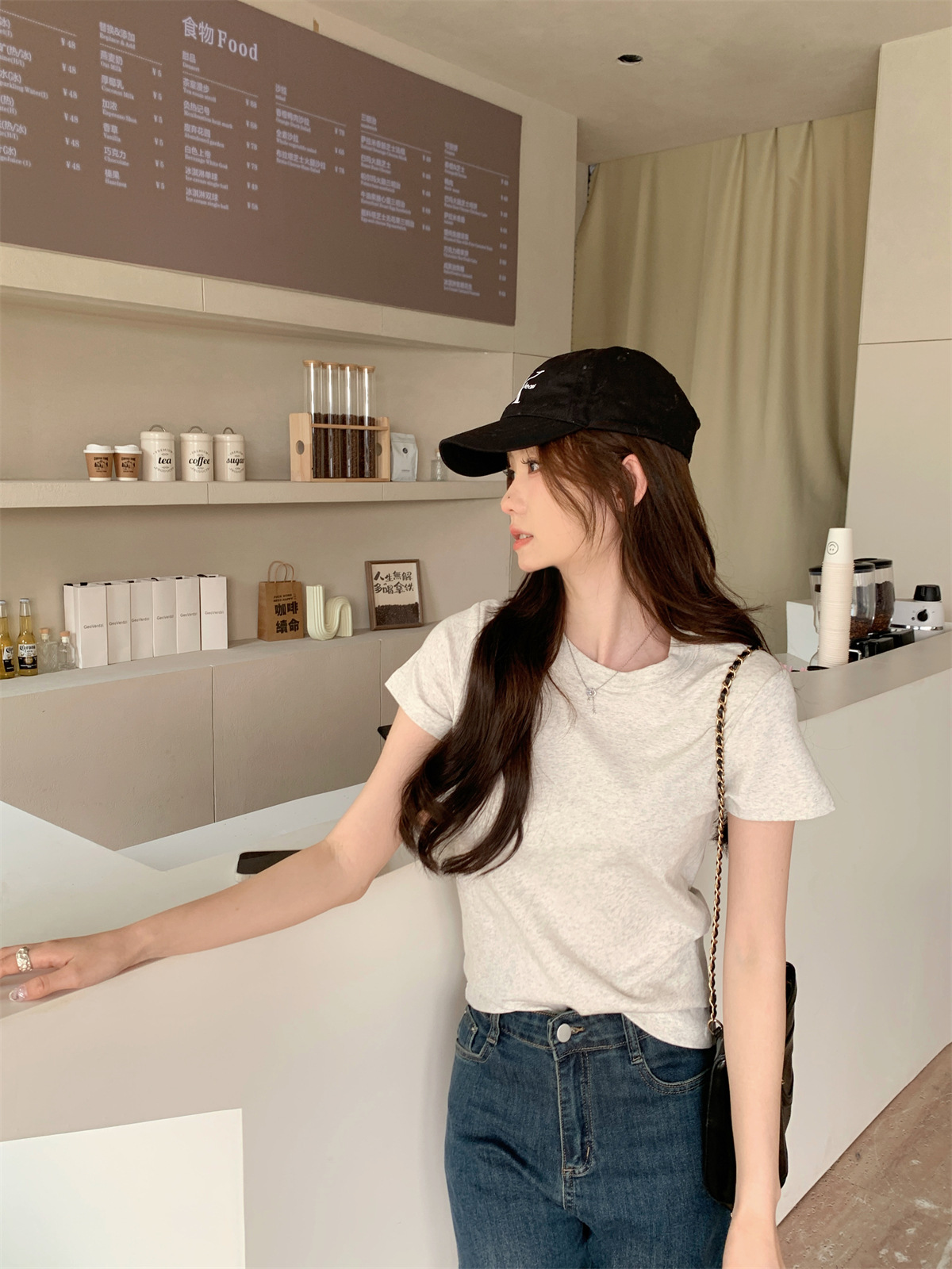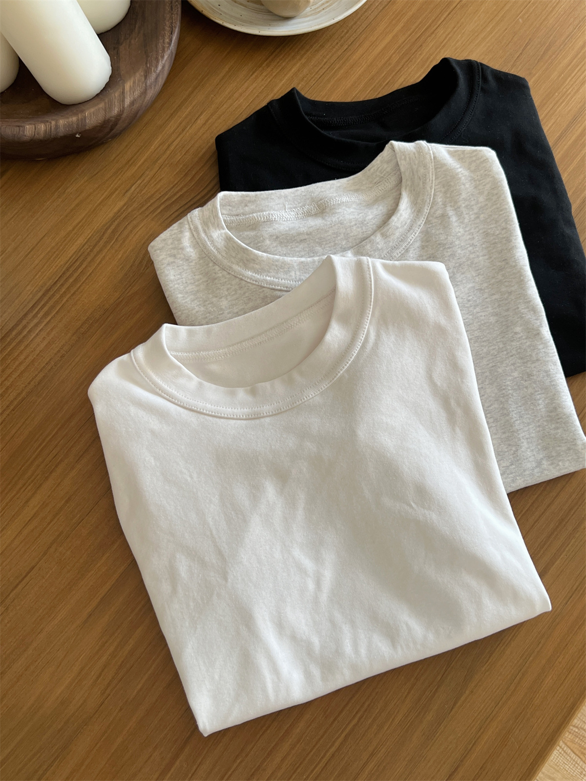 JMA-805 实拍 美式辣妹修身正肩圆领短袖T恤2024夏季白色纯棉简约百搭上衣