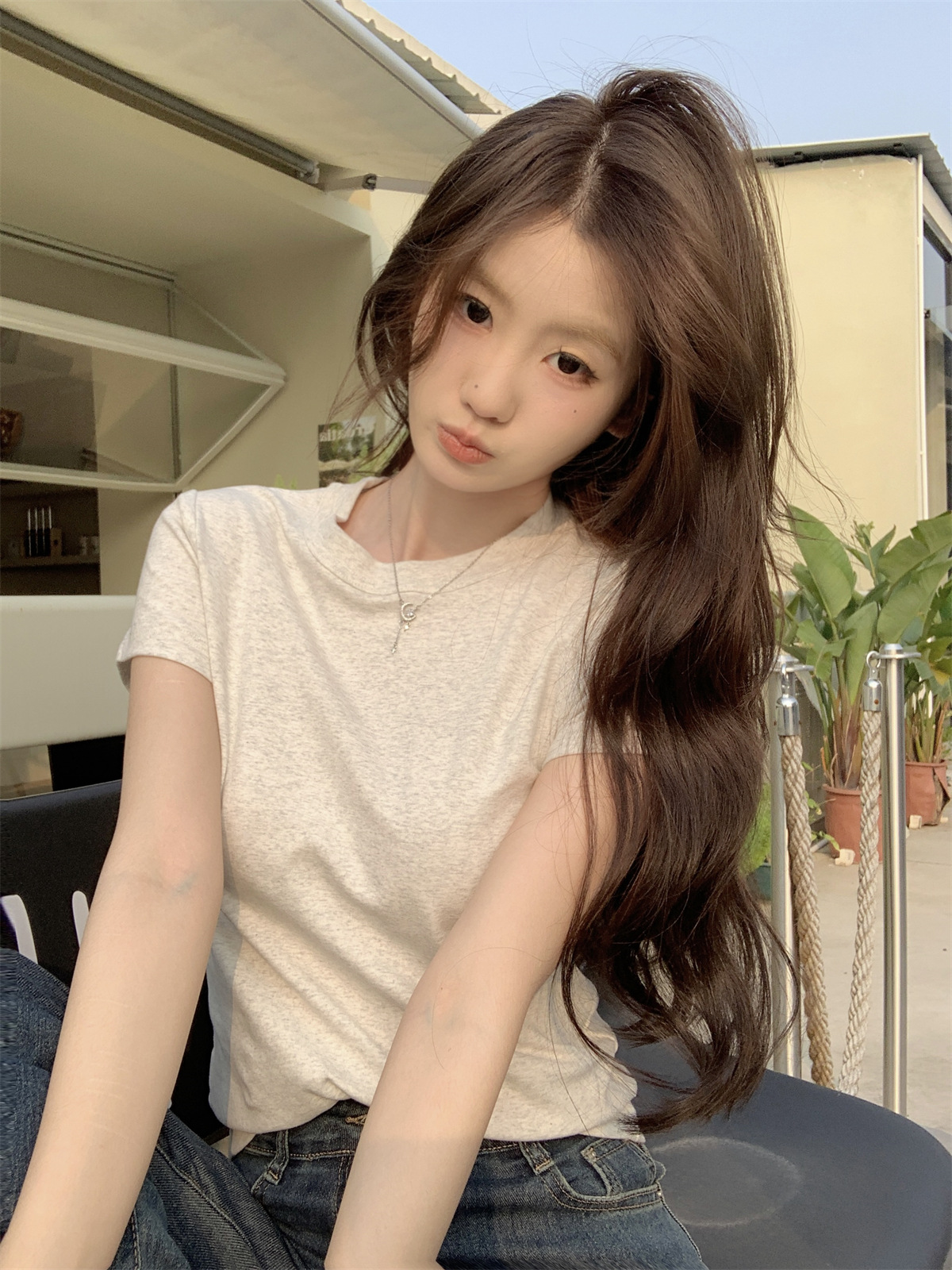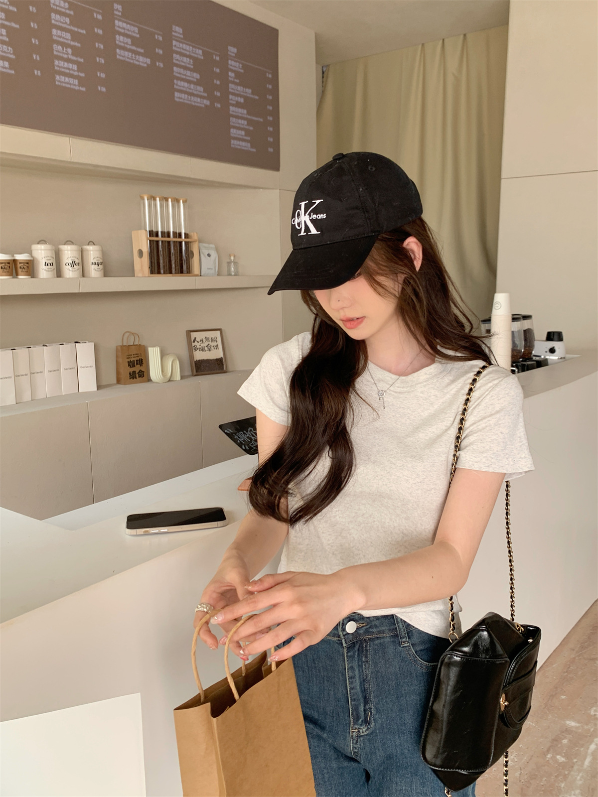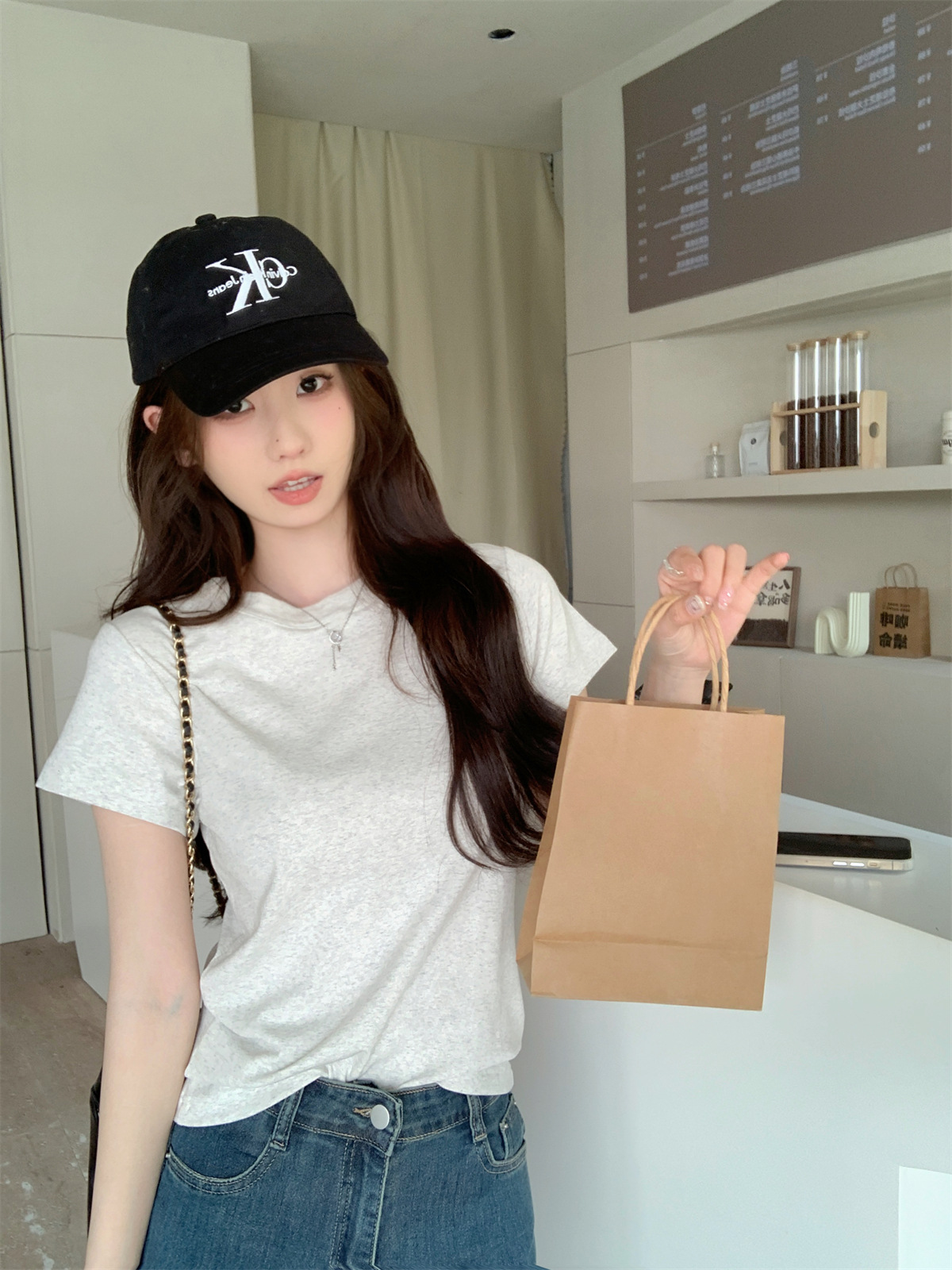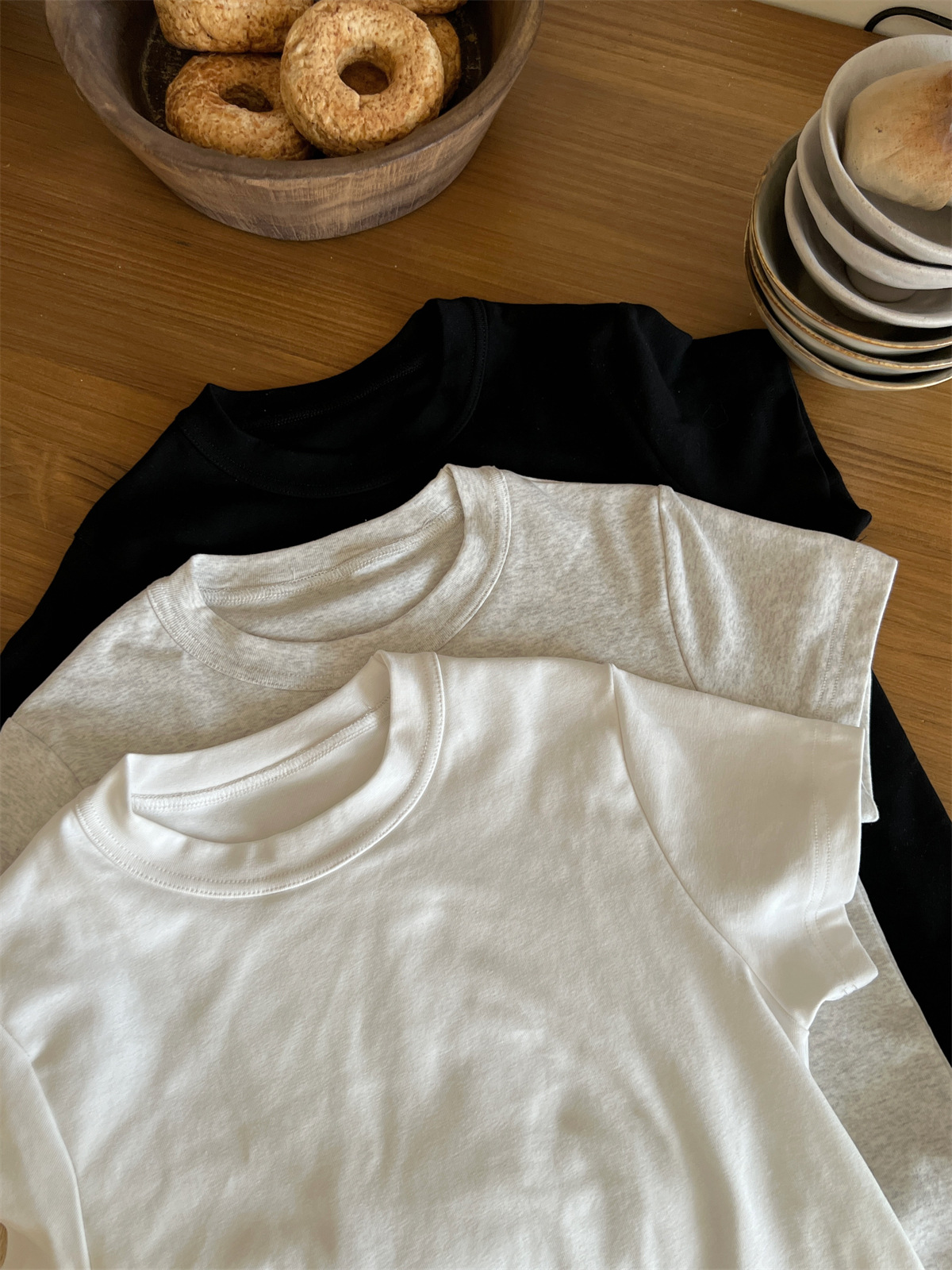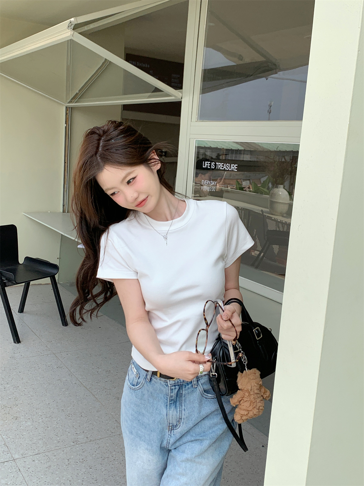 JMA-805 实拍 美式辣妹修身正肩圆领短袖T恤2024夏季白色纯棉简约百搭上衣