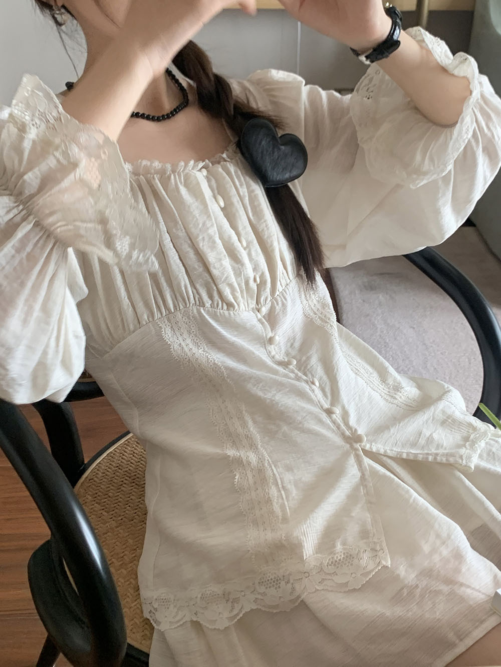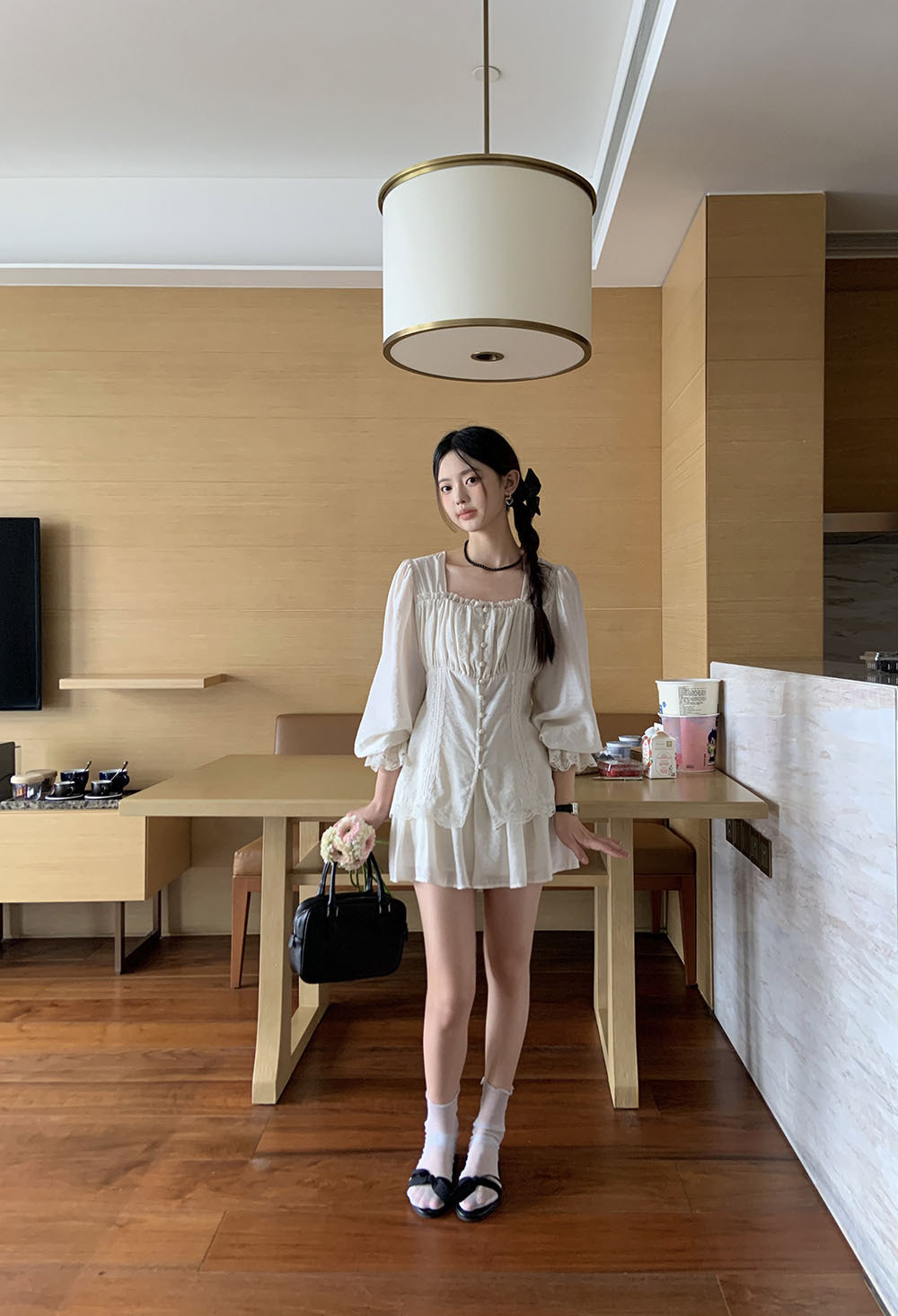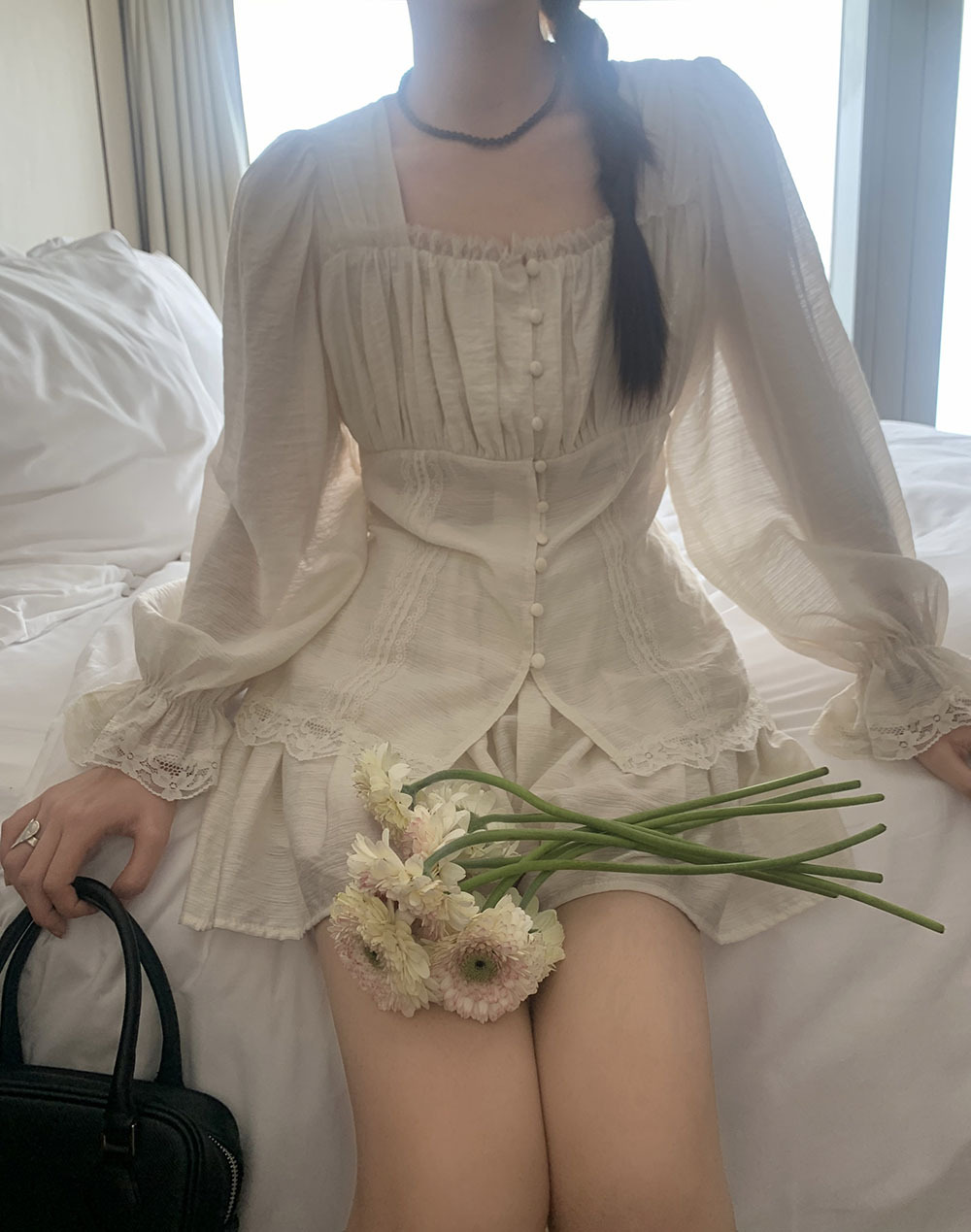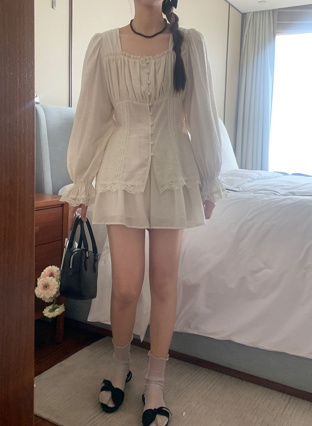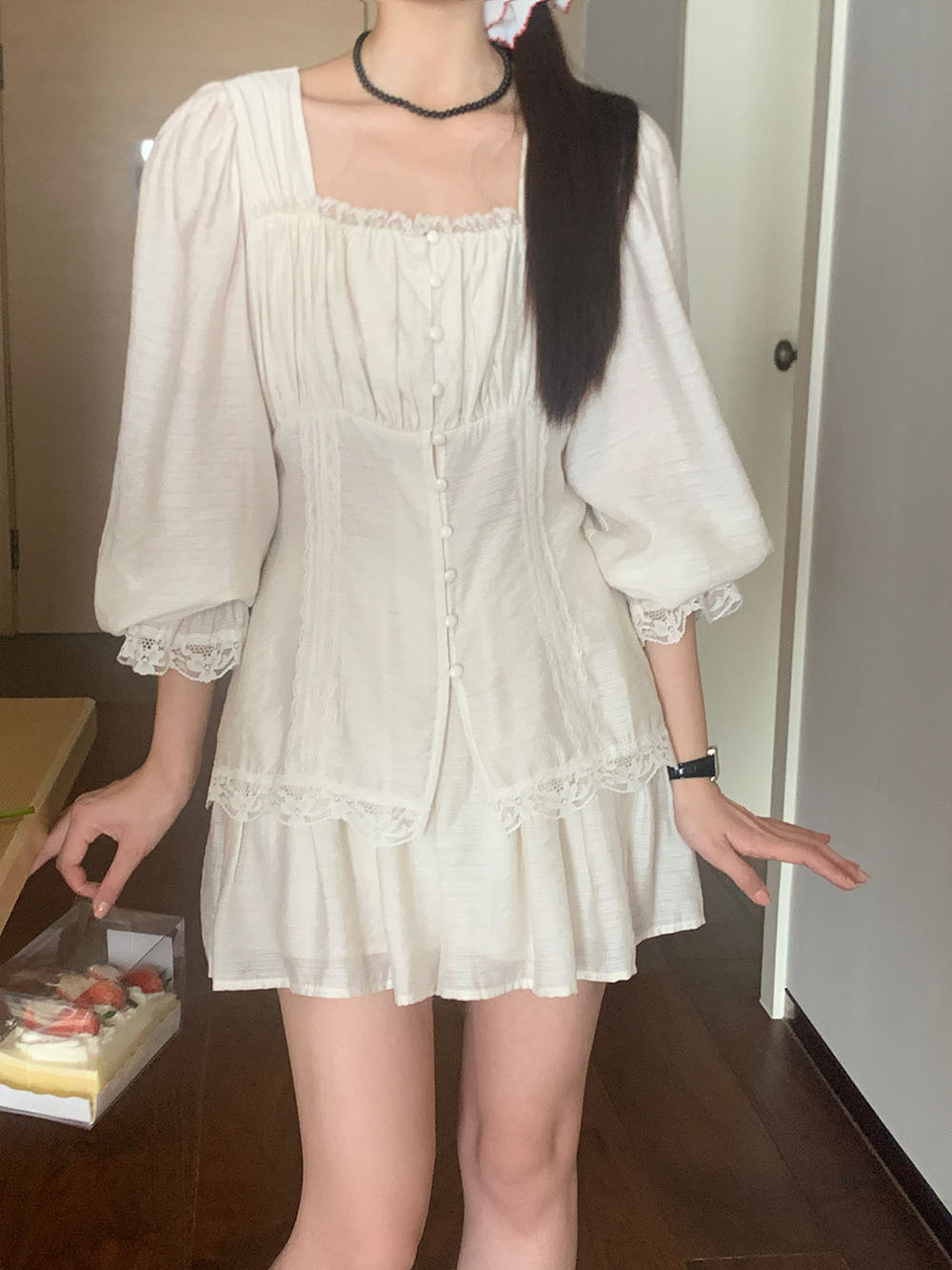 JMA-809 法式复古小众甜美蕾丝方领收腰衬衫+纯色显瘦休闲短裤套装