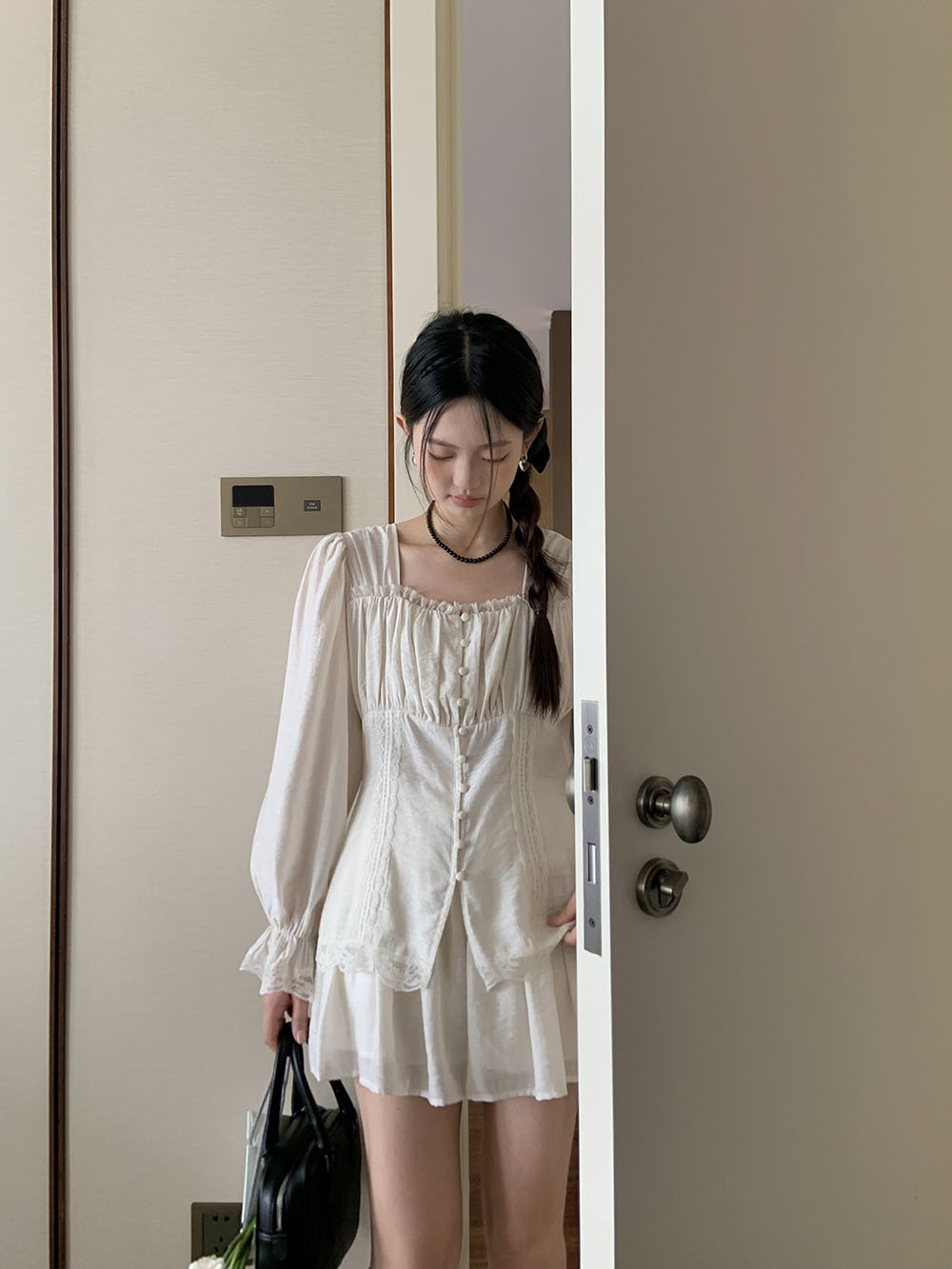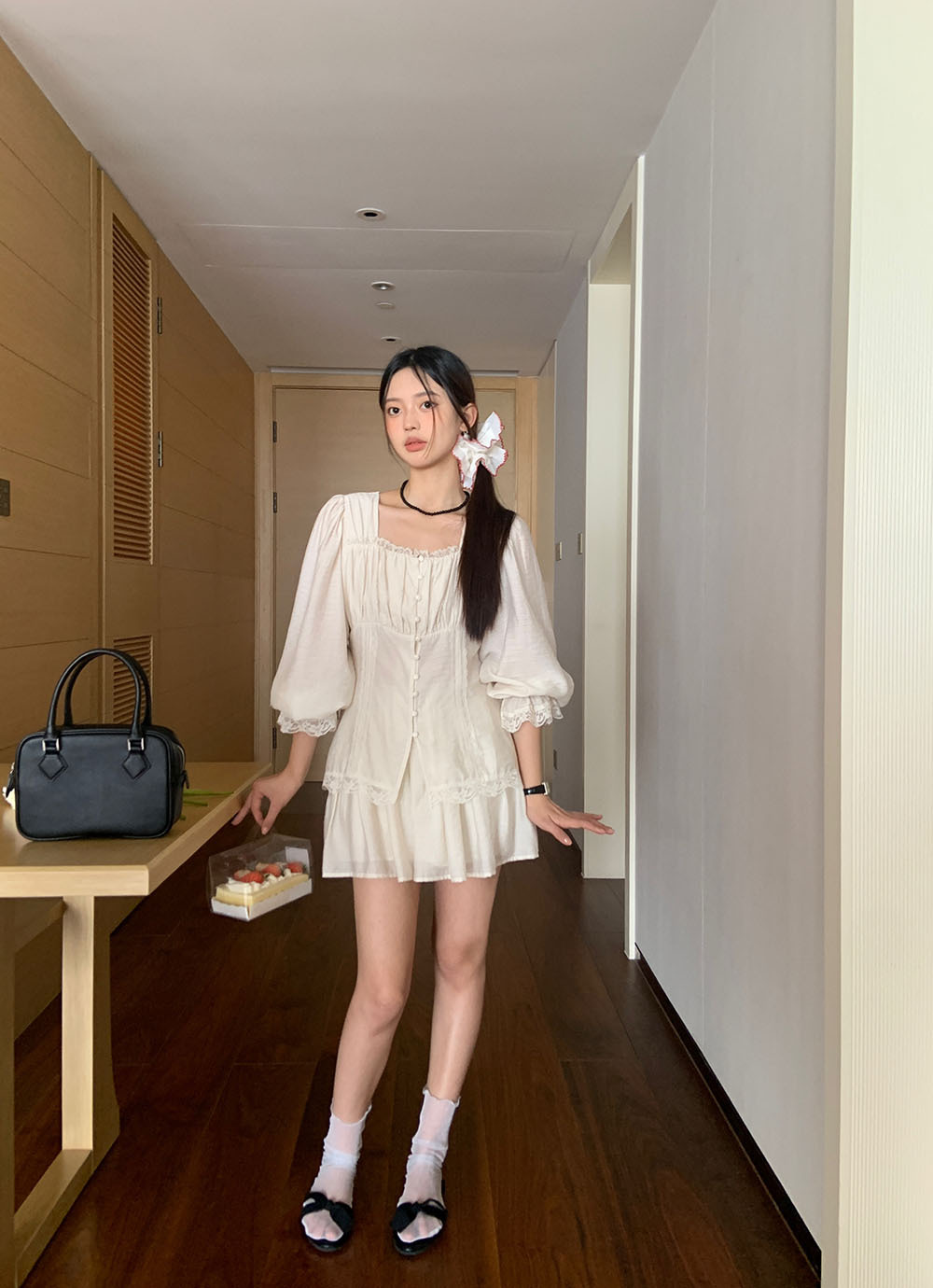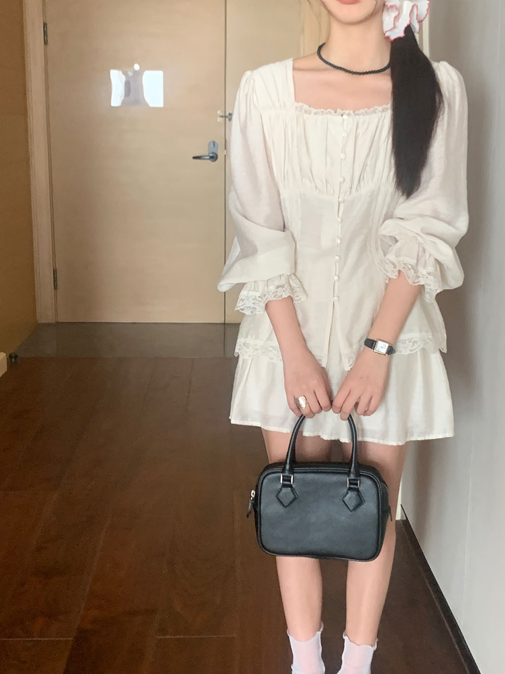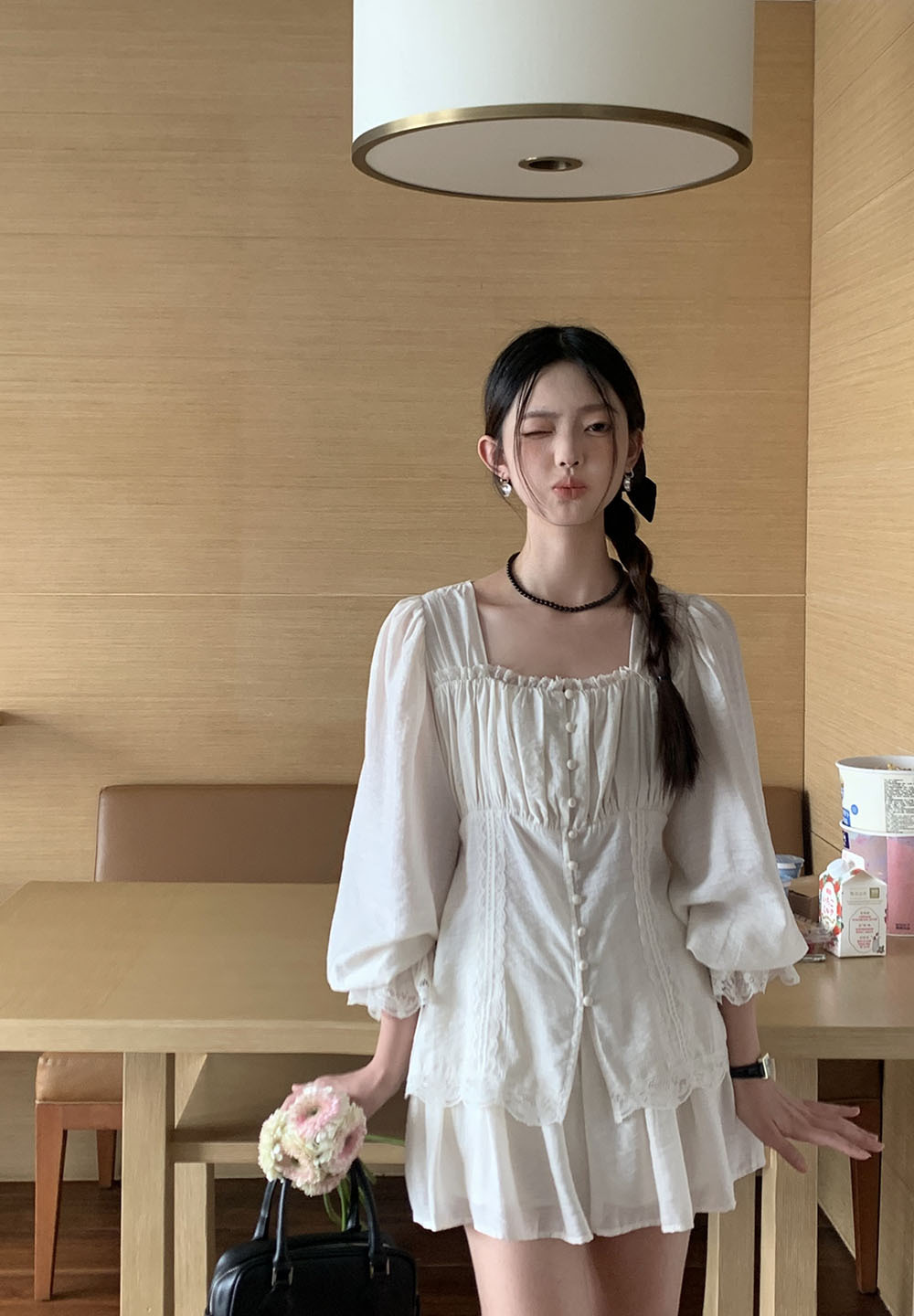 JMA-809 法式复古小众甜美蕾丝方领收腰衬衫+纯色显瘦休闲短裤套装