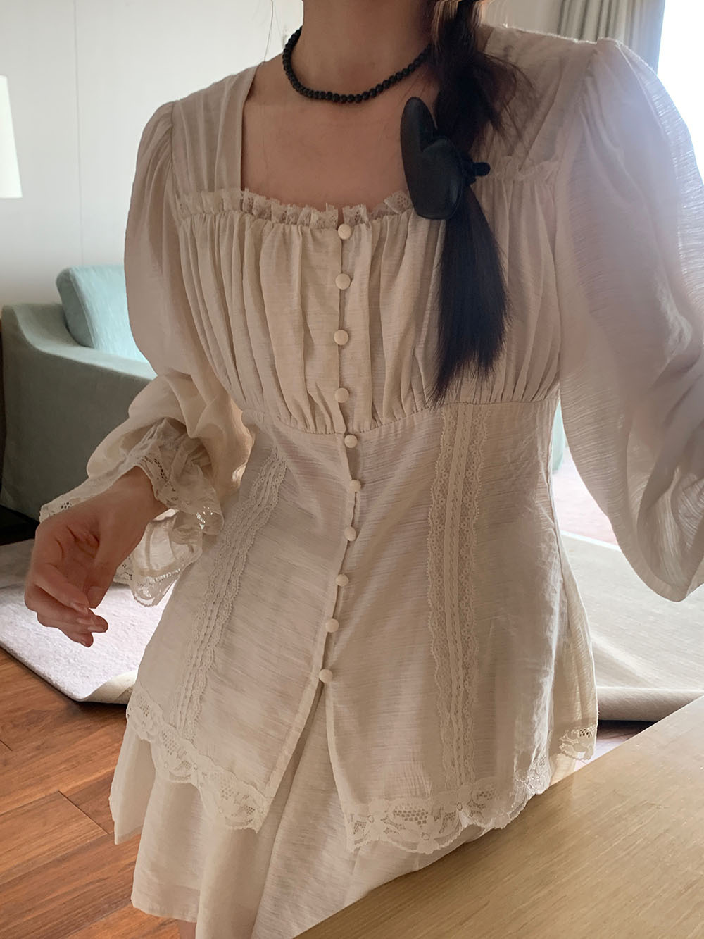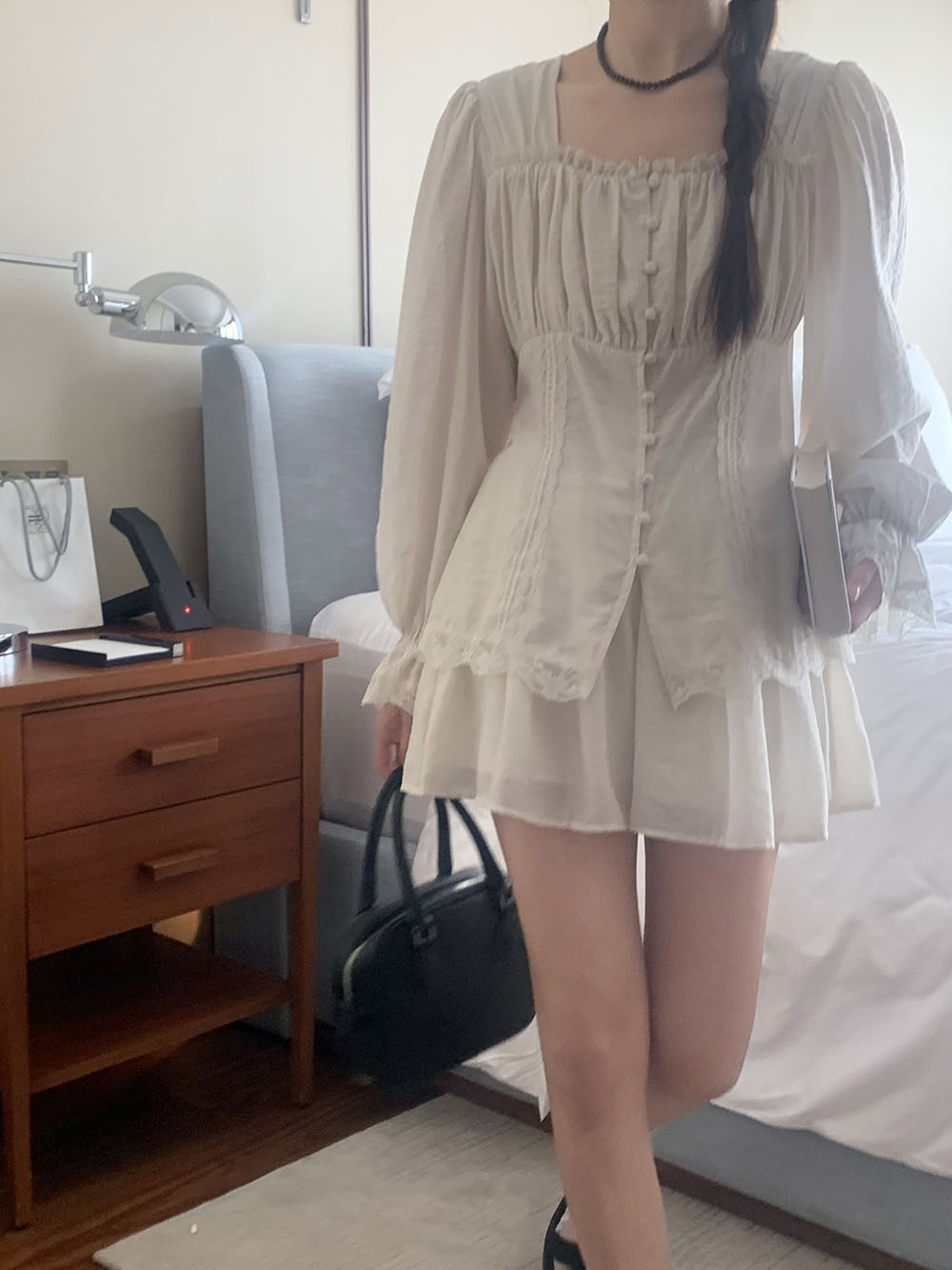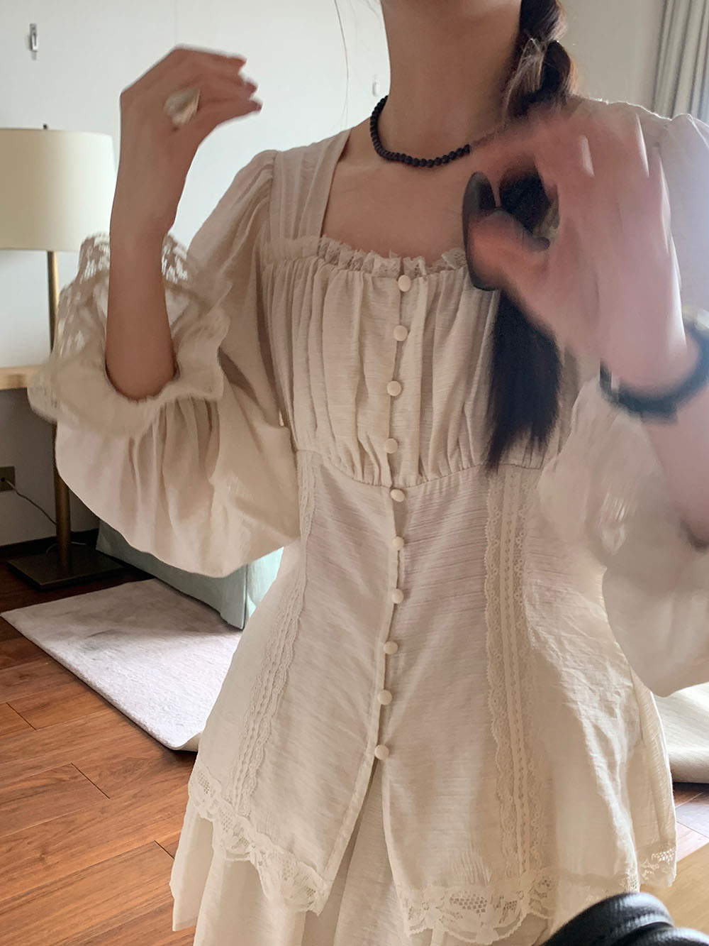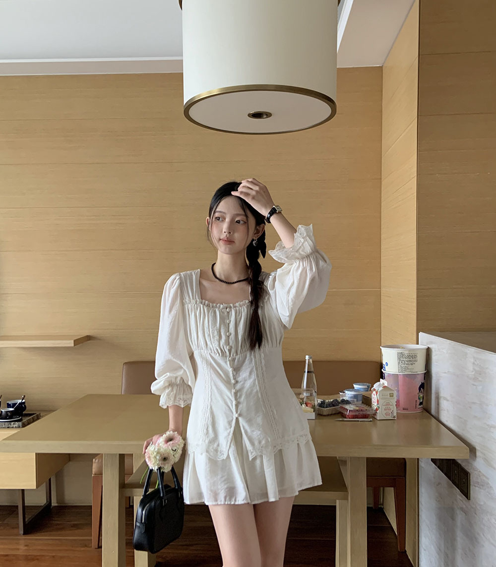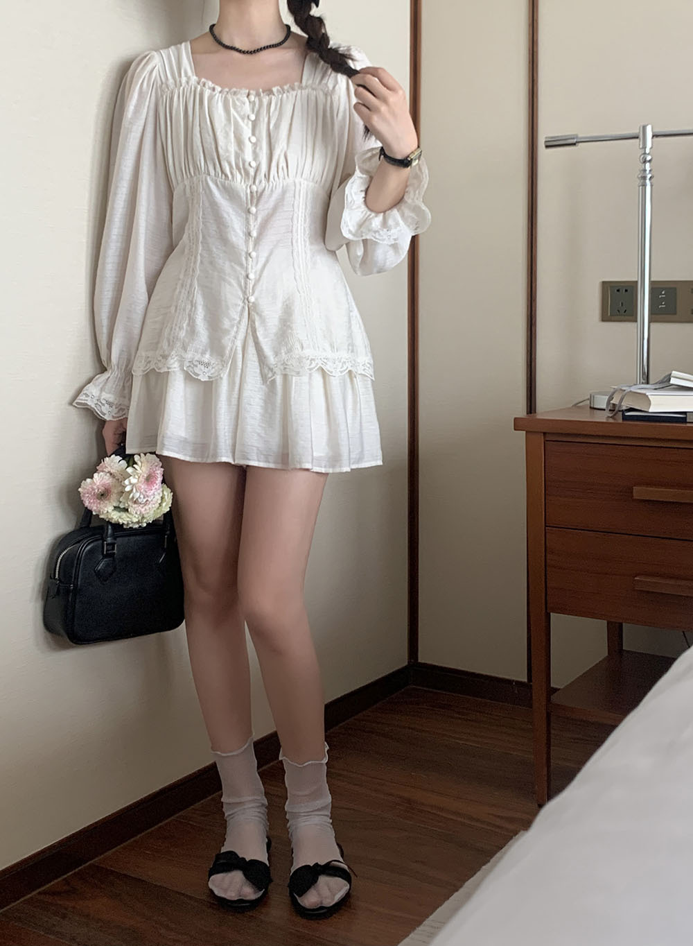 JMA-809 法式复古小众甜美蕾丝方领收腰衬衫+纯色显瘦休闲短裤套装