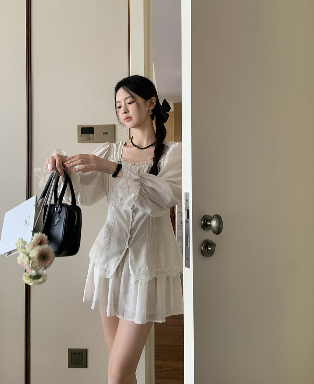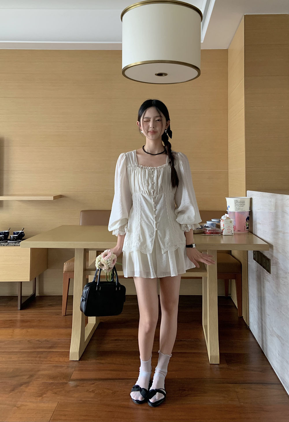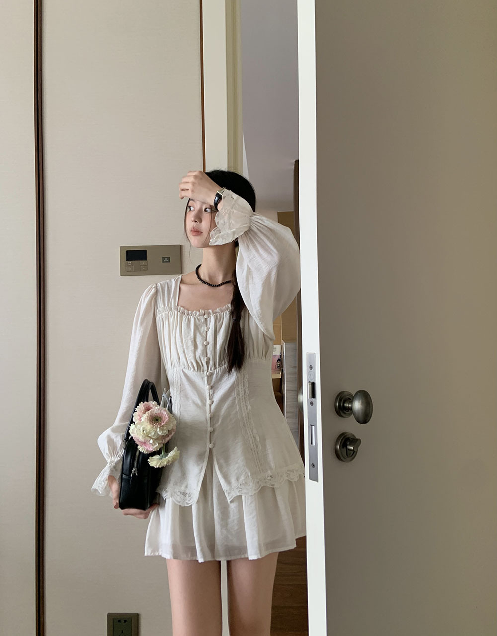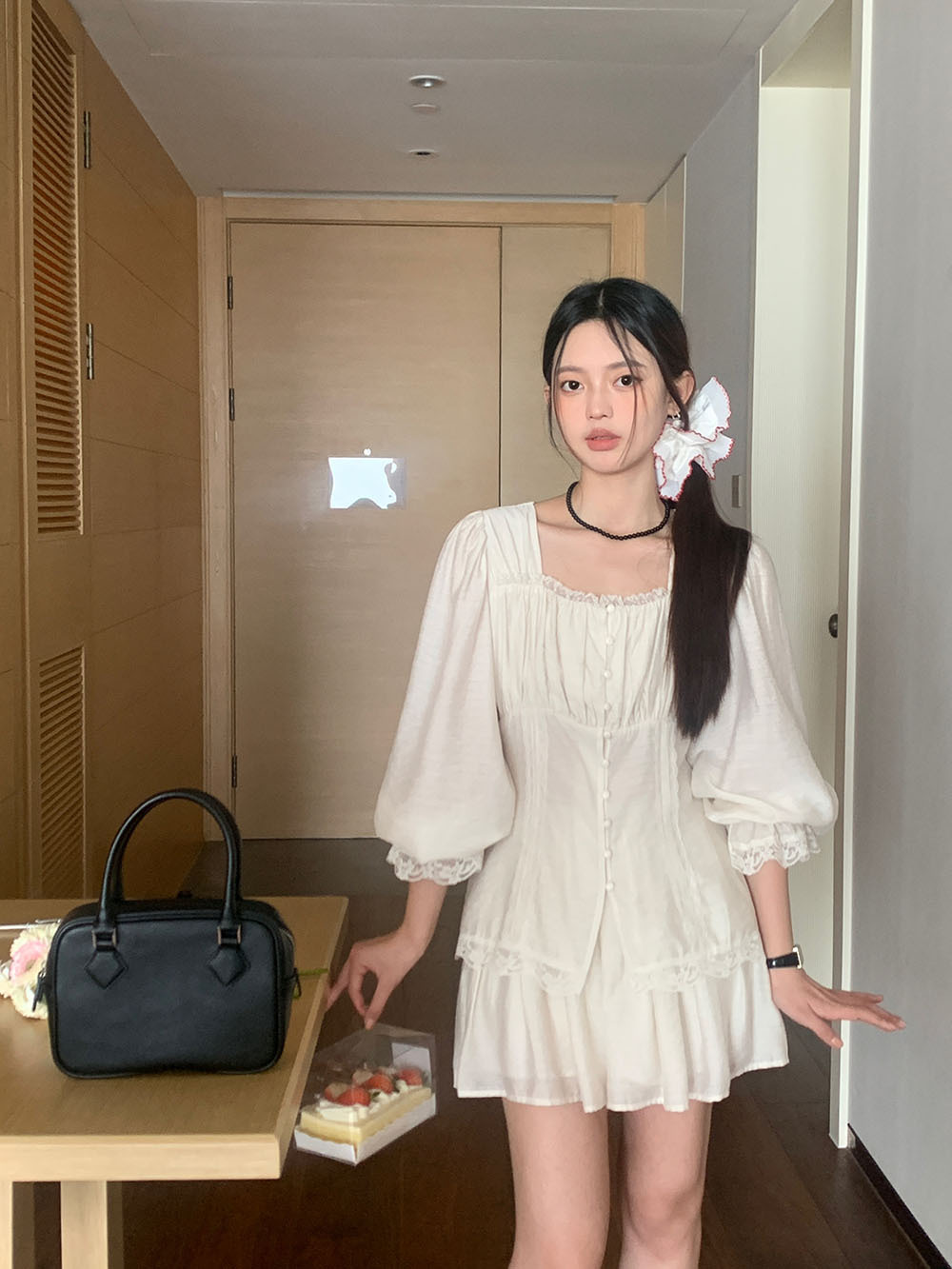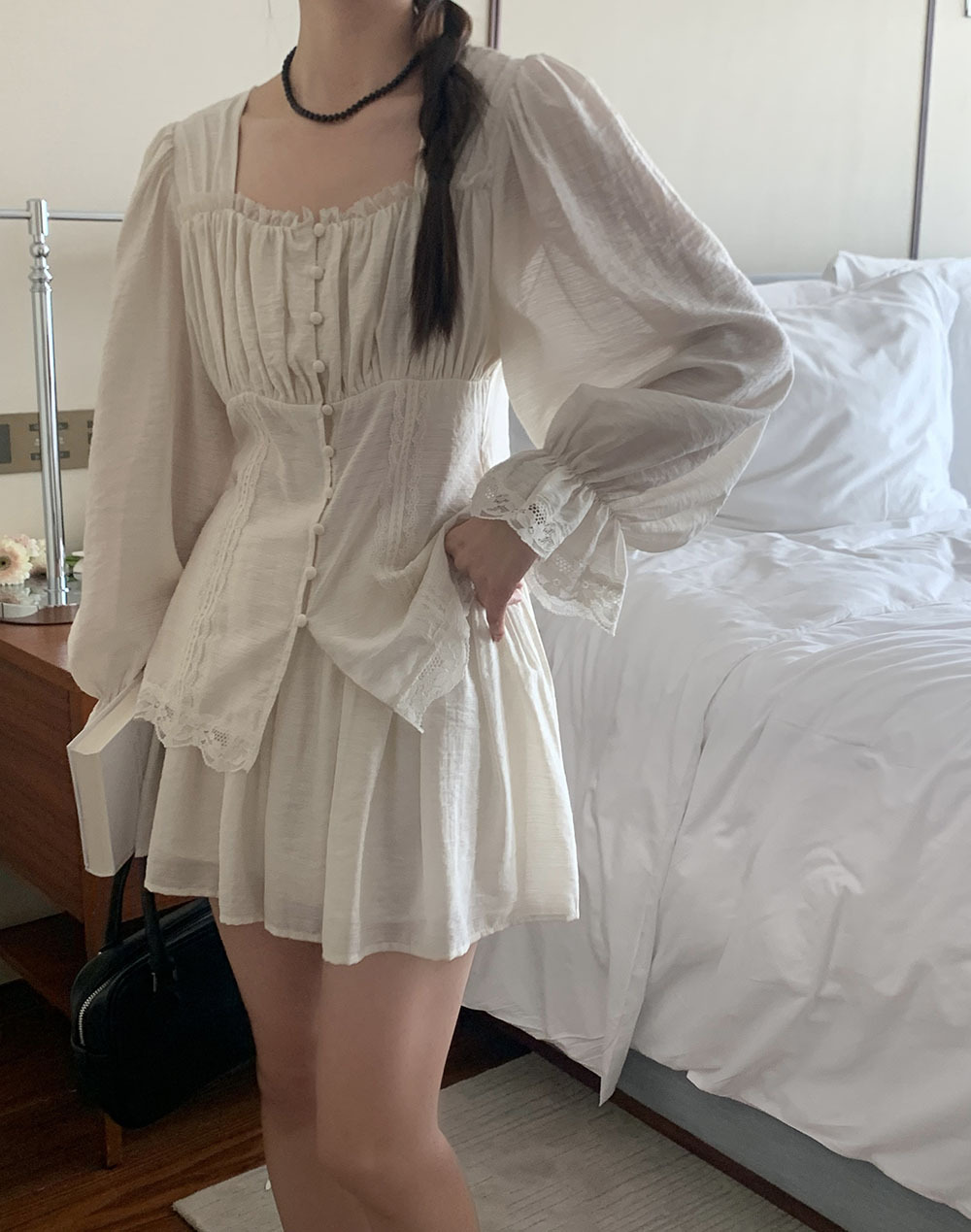 JMA-809 法式复古小众甜美蕾丝方领收腰衬衫+纯色显瘦休闲短裤套装