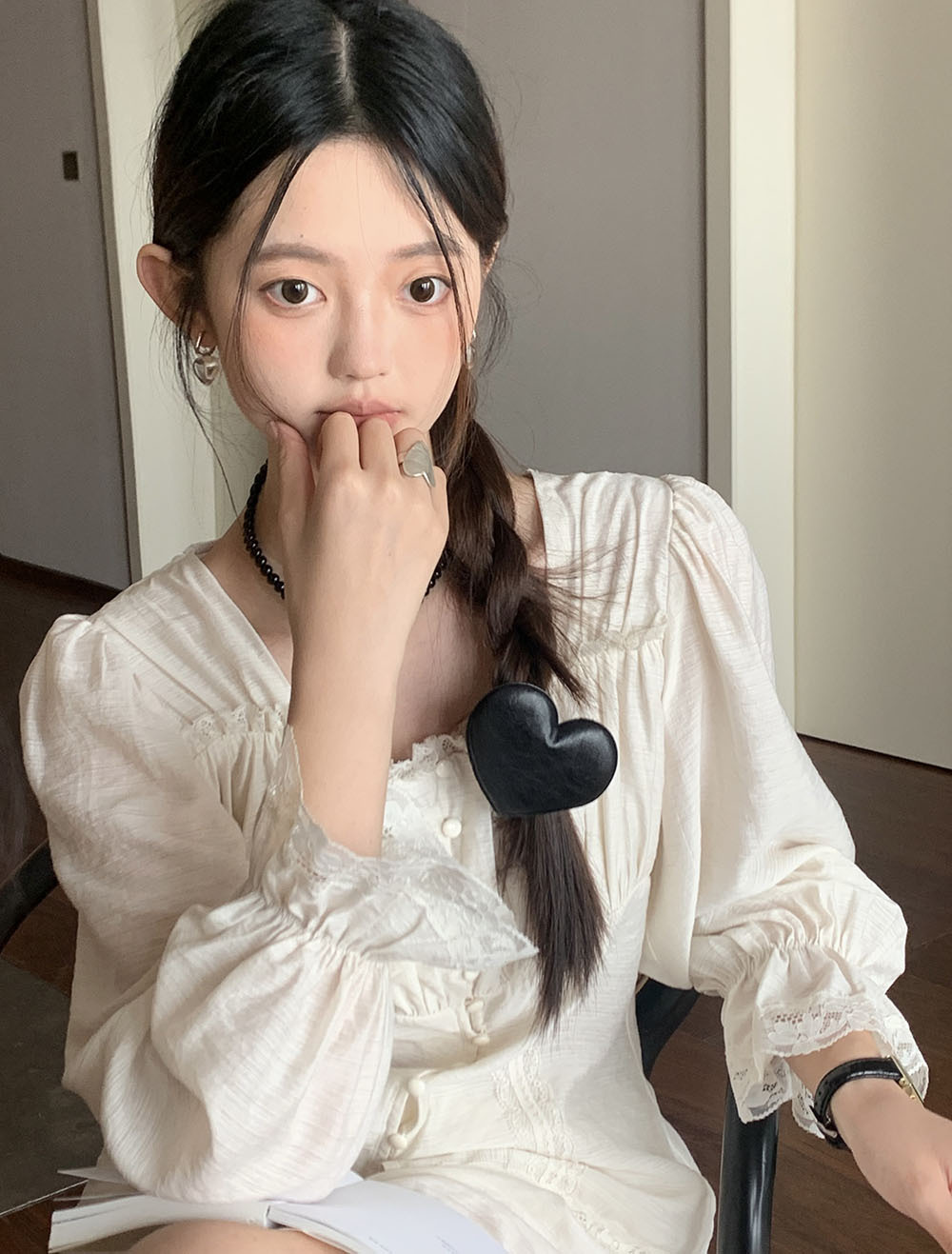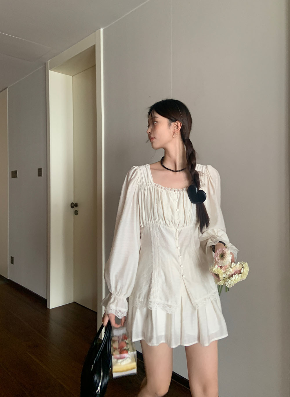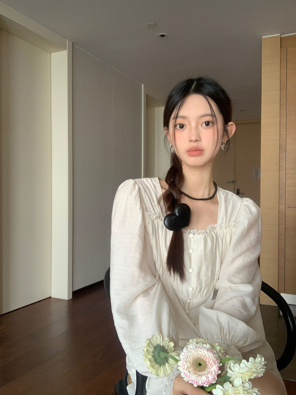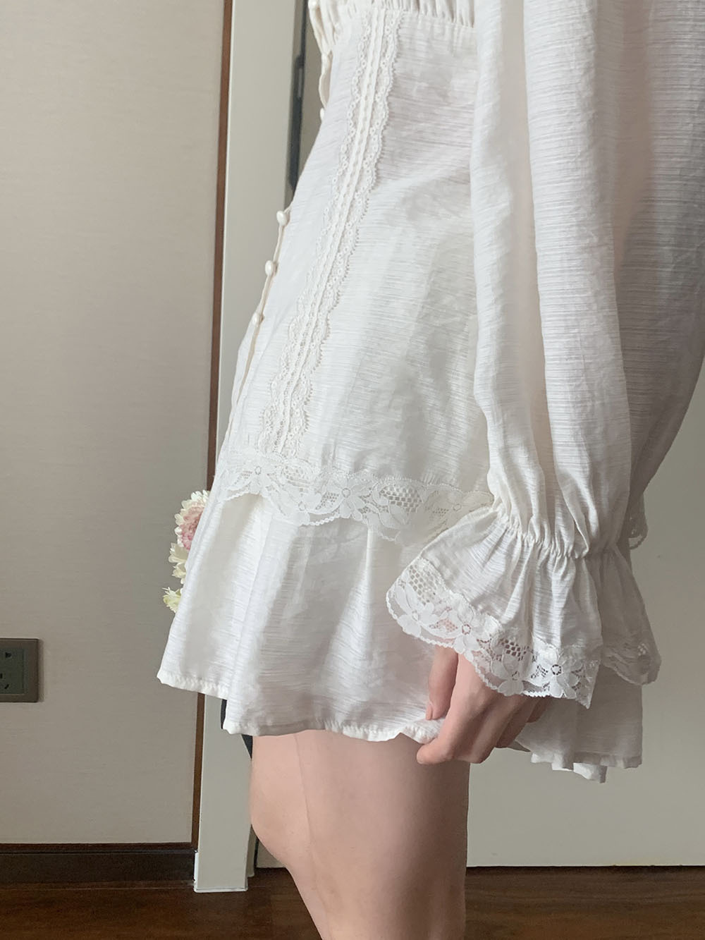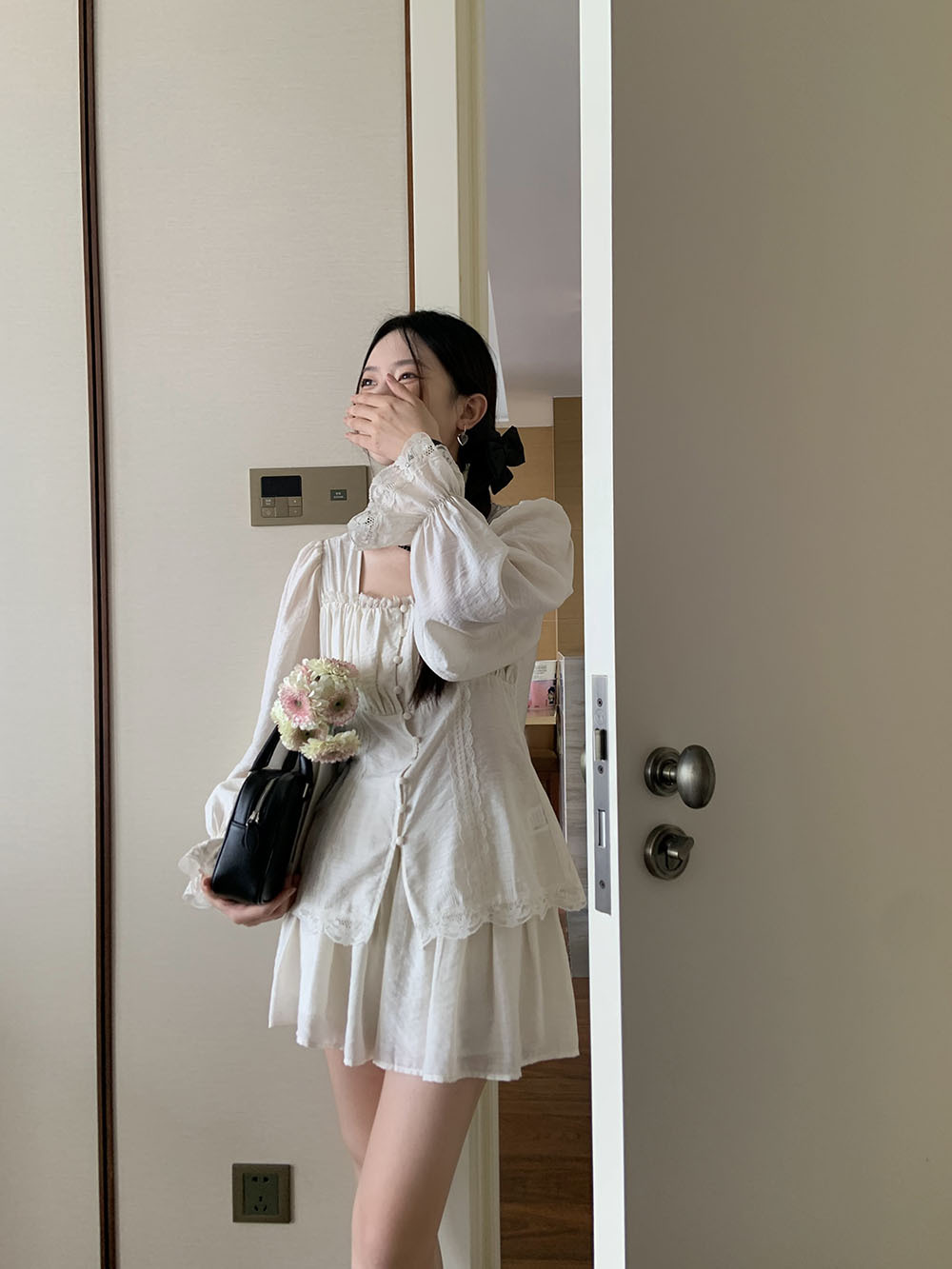 JMA-809 法式复古小众甜美蕾丝方领收腰衬衫+纯色显瘦休闲短裤套装