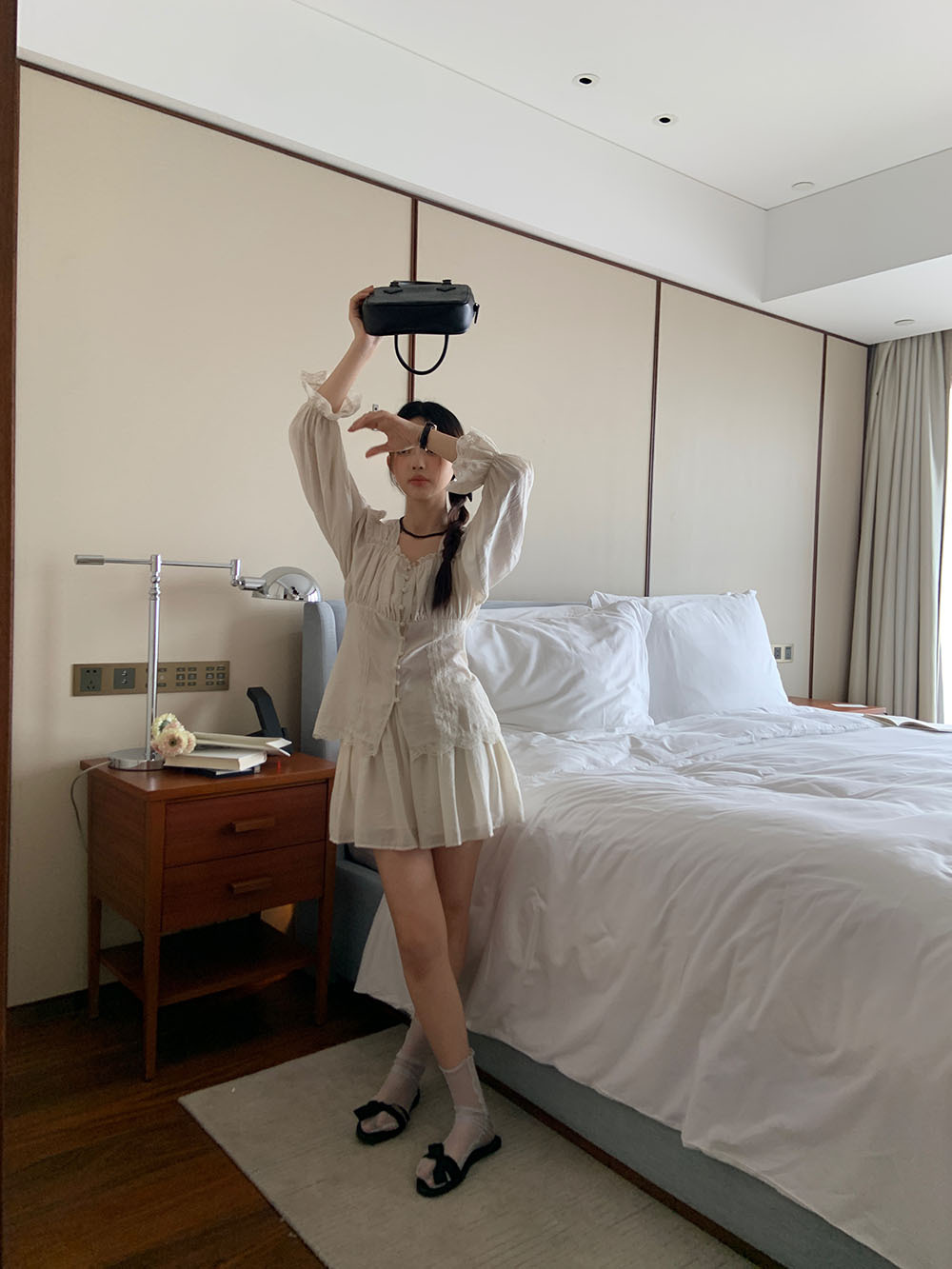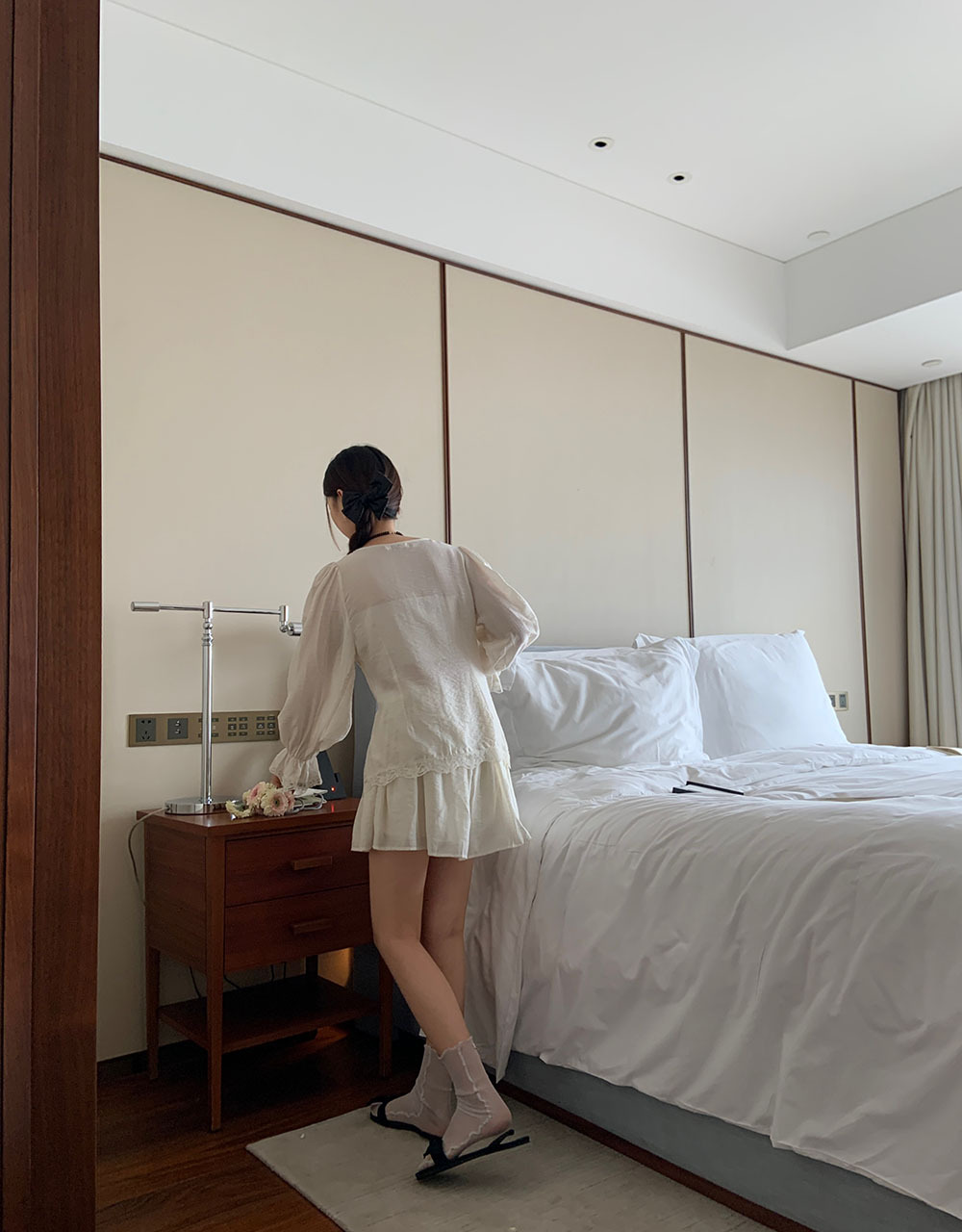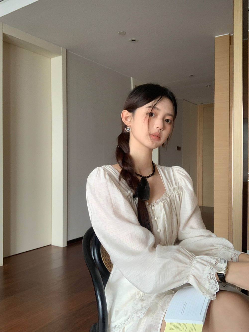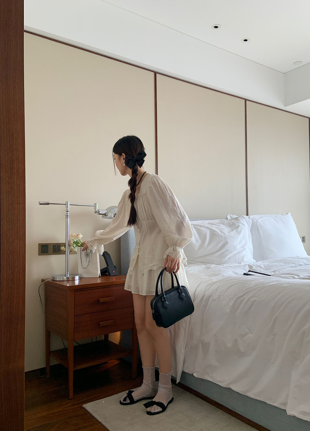 JMA-809 法式复古小众甜美蕾丝方领收腰衬衫+纯色显瘦休闲短裤套装