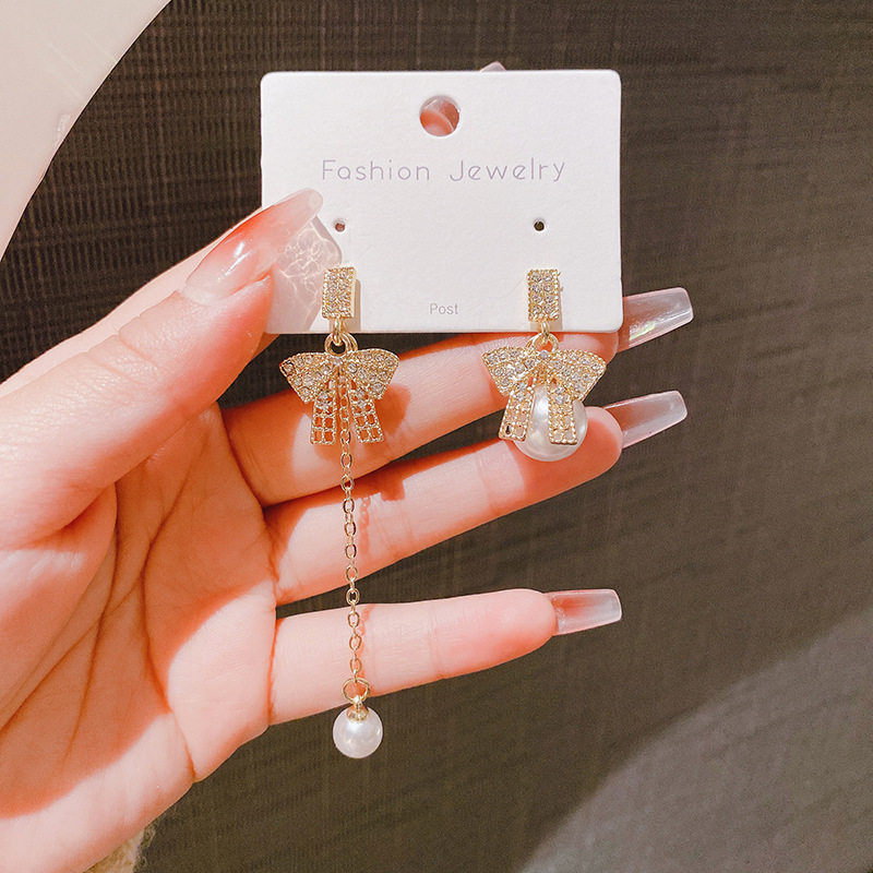 JME-784 925银针韩国东大门珍珠流苏镂空蝴蝶结长款耳坠ins时尚耳环耳钉女