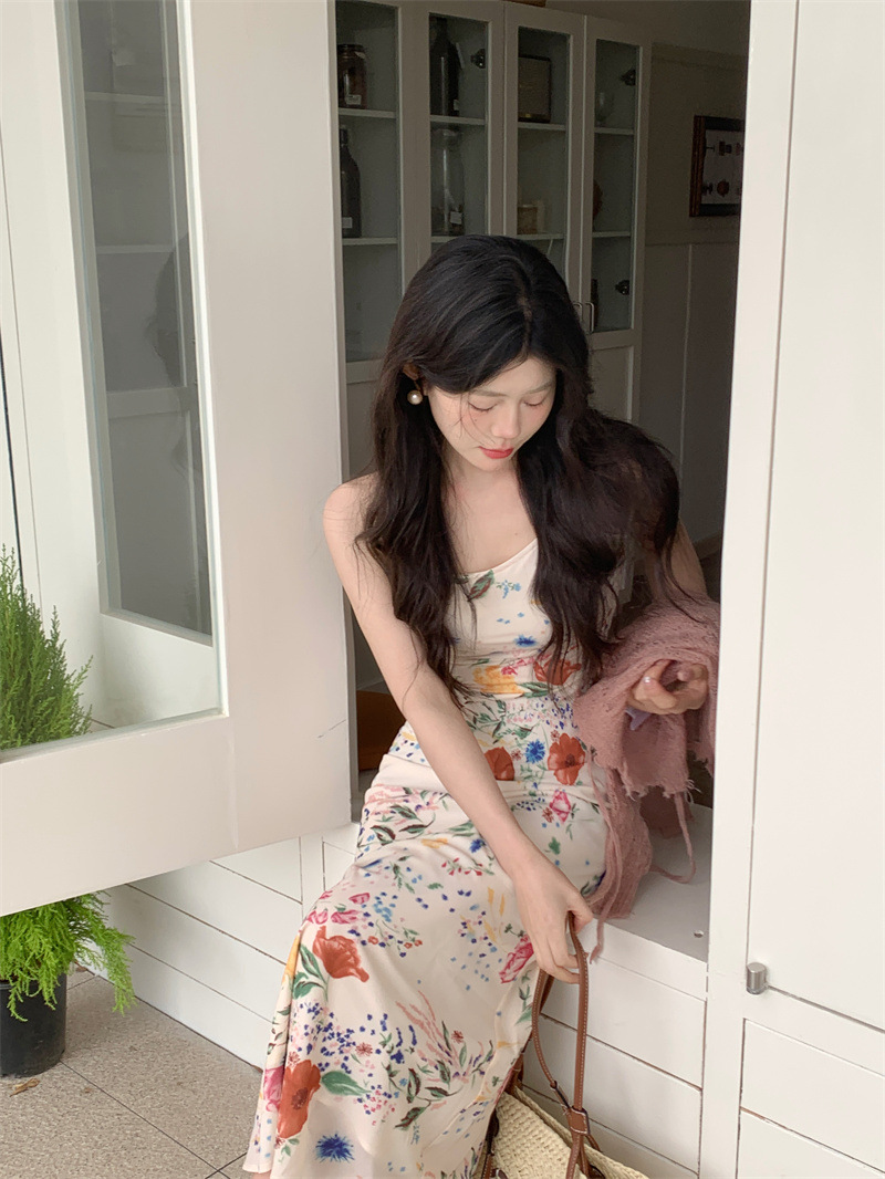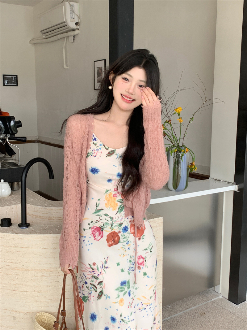 JMA-821 实拍春意盎然V领小碎花高腰显瘦连衣裙长款+温柔粉设计感针织开衫
