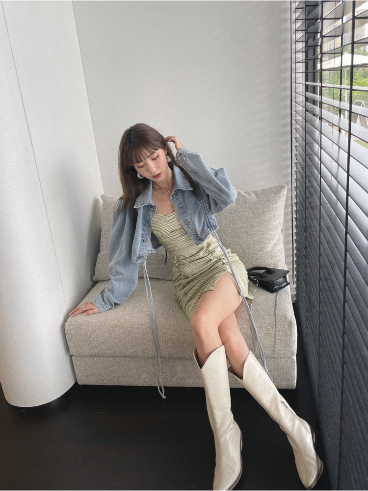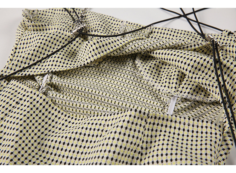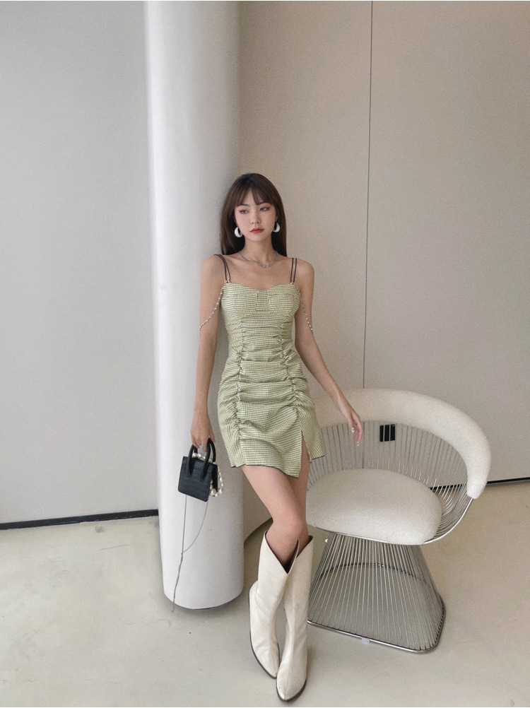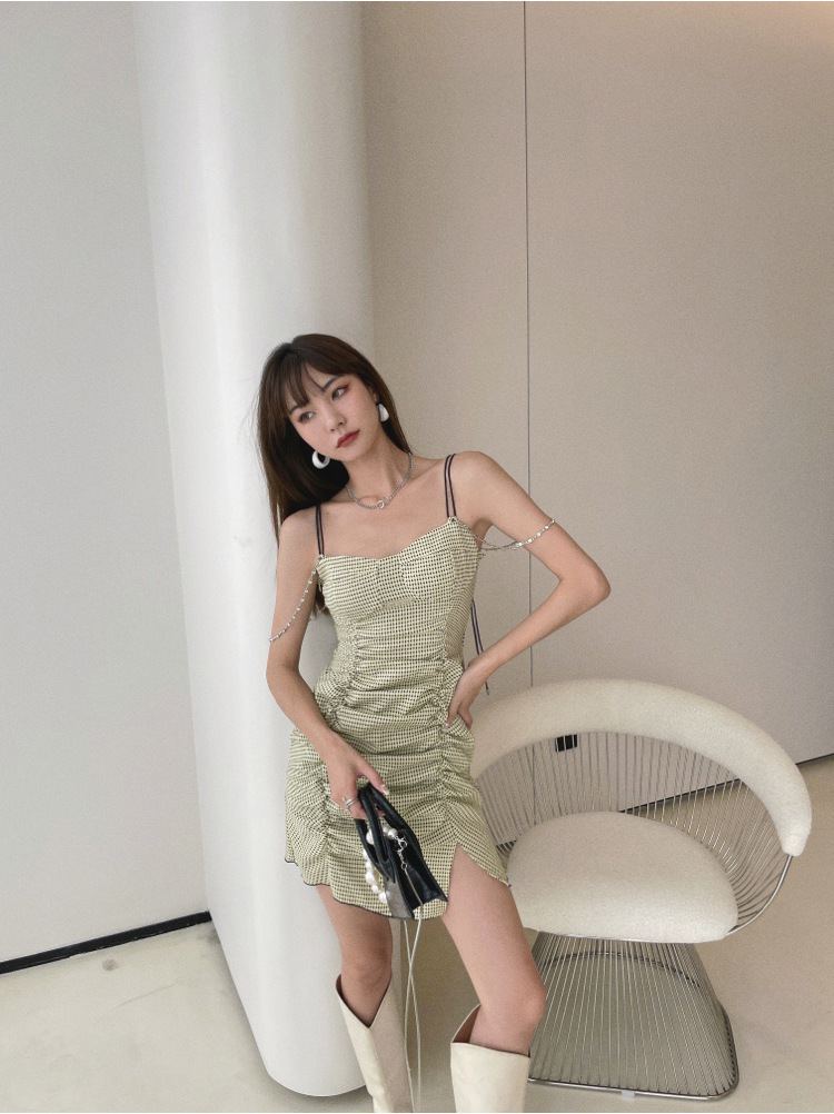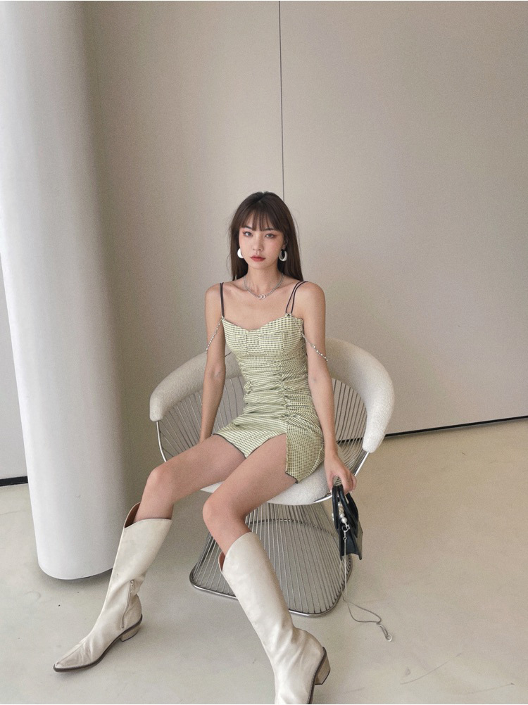 JMA-824 实拍 夏装新款抽褶开叉裙摆露背纯欲风格子显瘦吊带连衣裙女