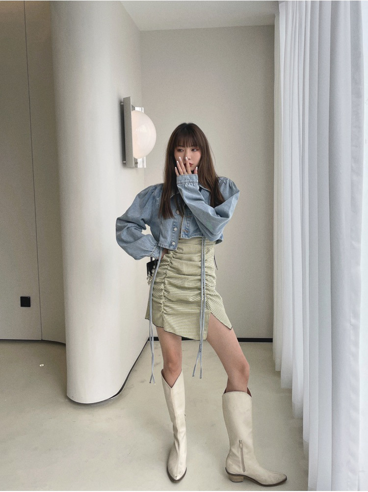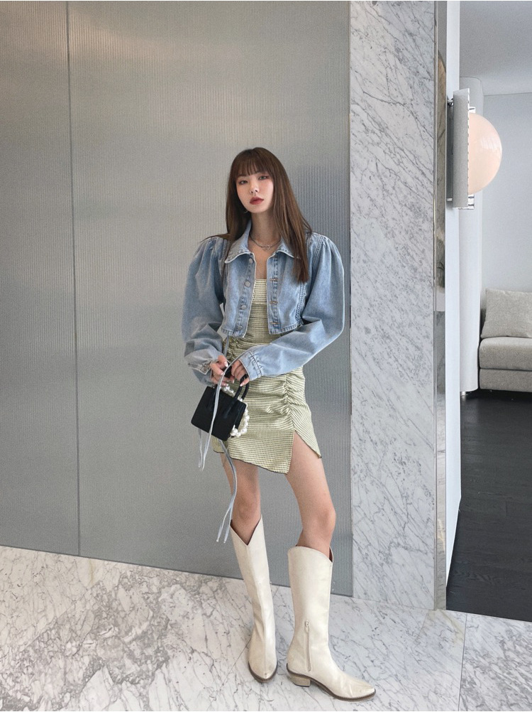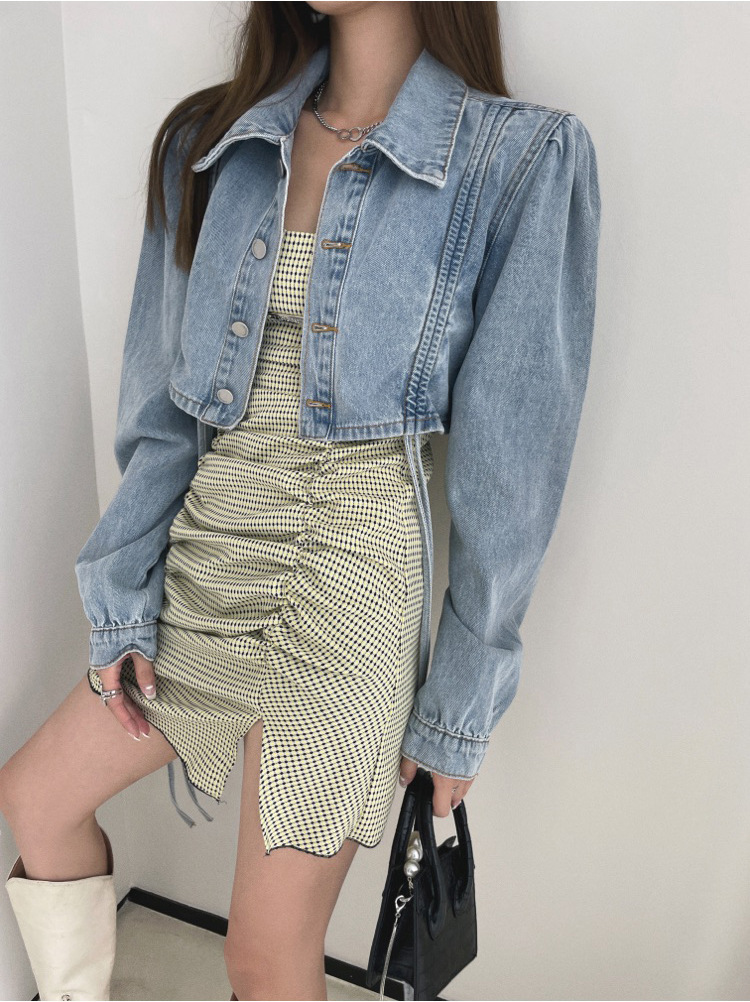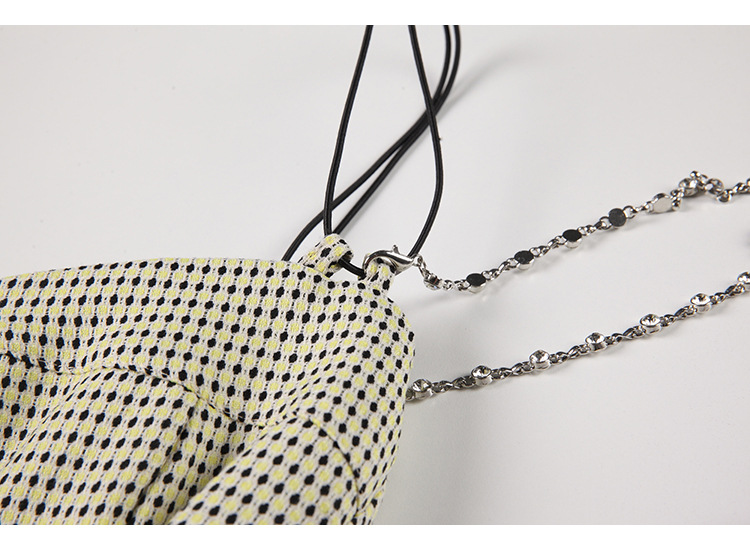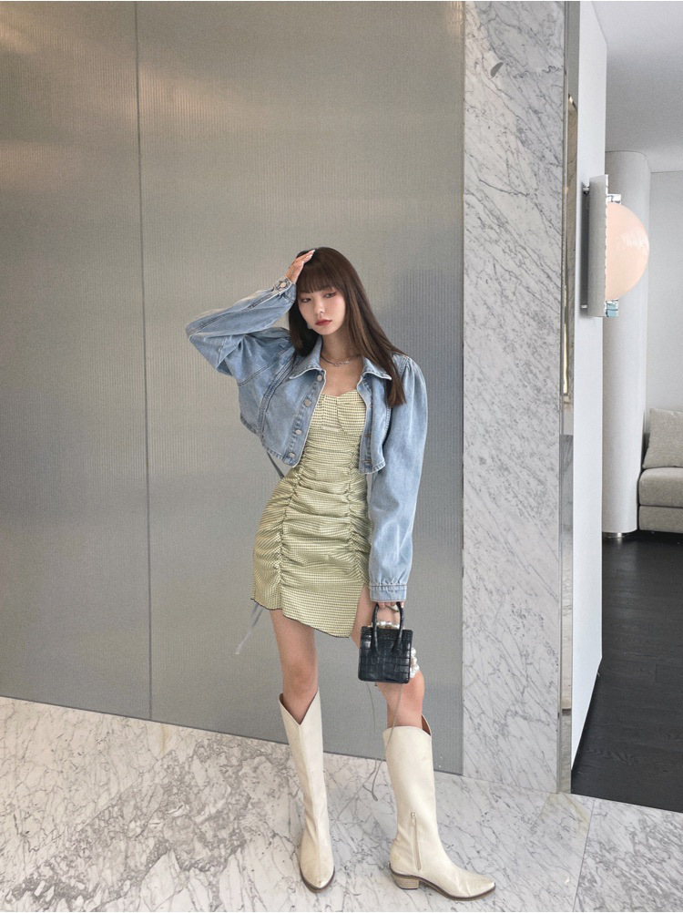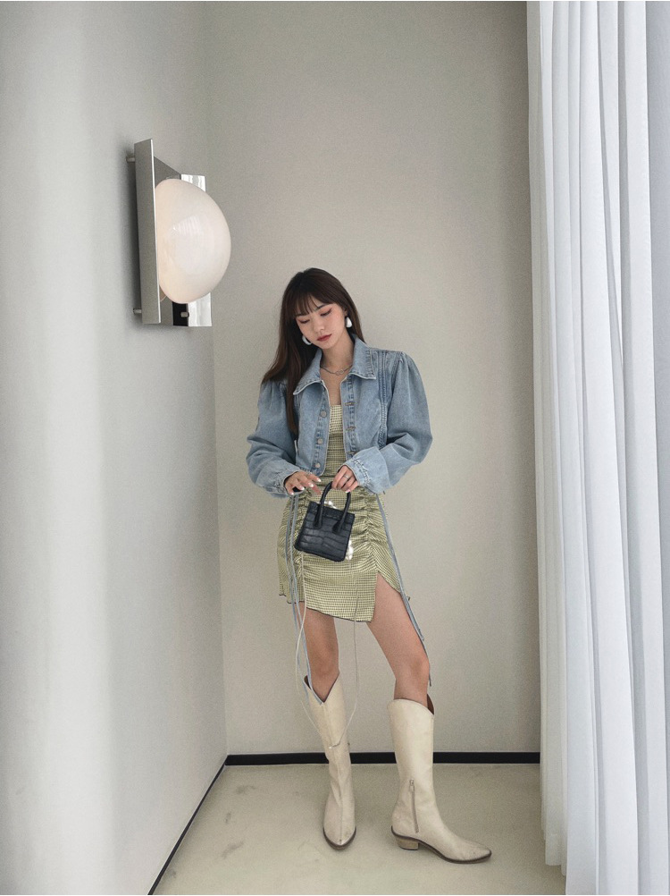 JMA-824 实拍 夏装新款抽褶开叉裙摆露背纯欲风格子显瘦吊带连衣裙女