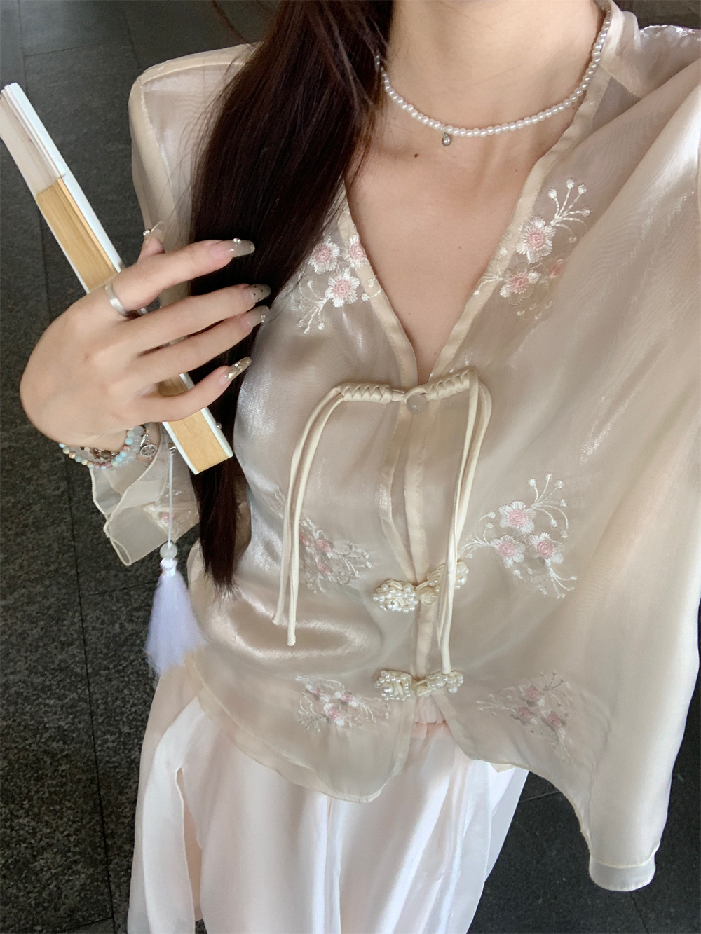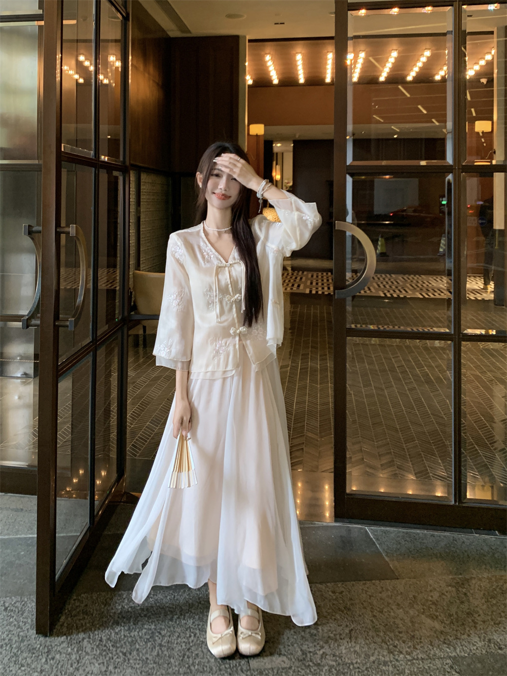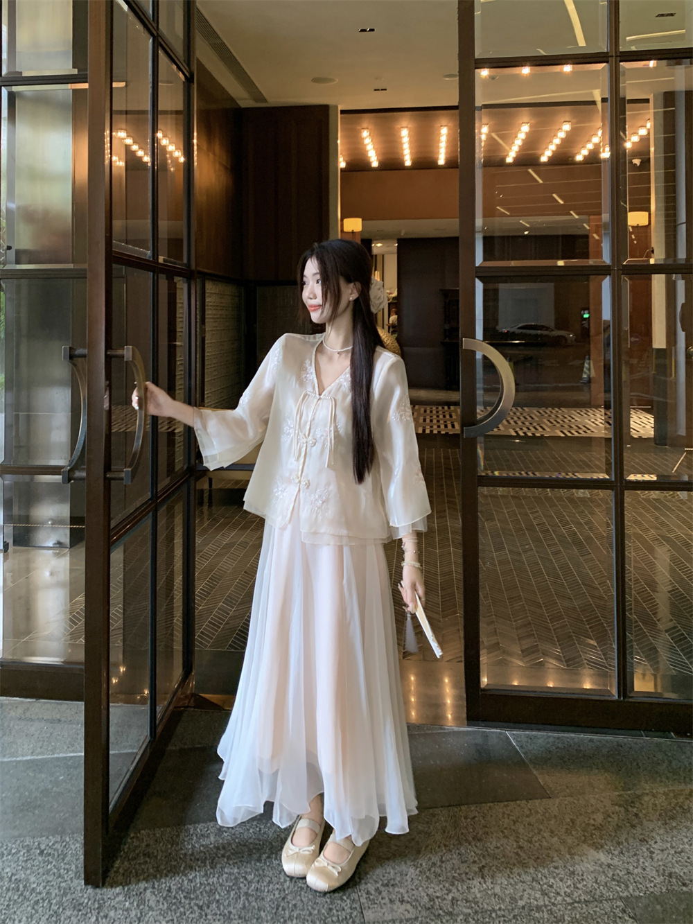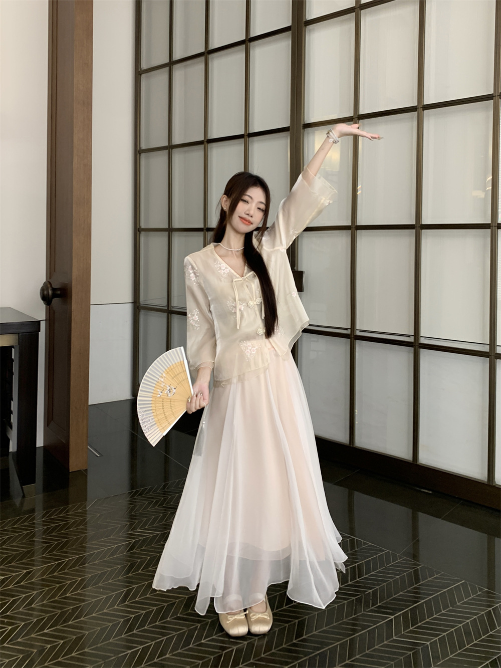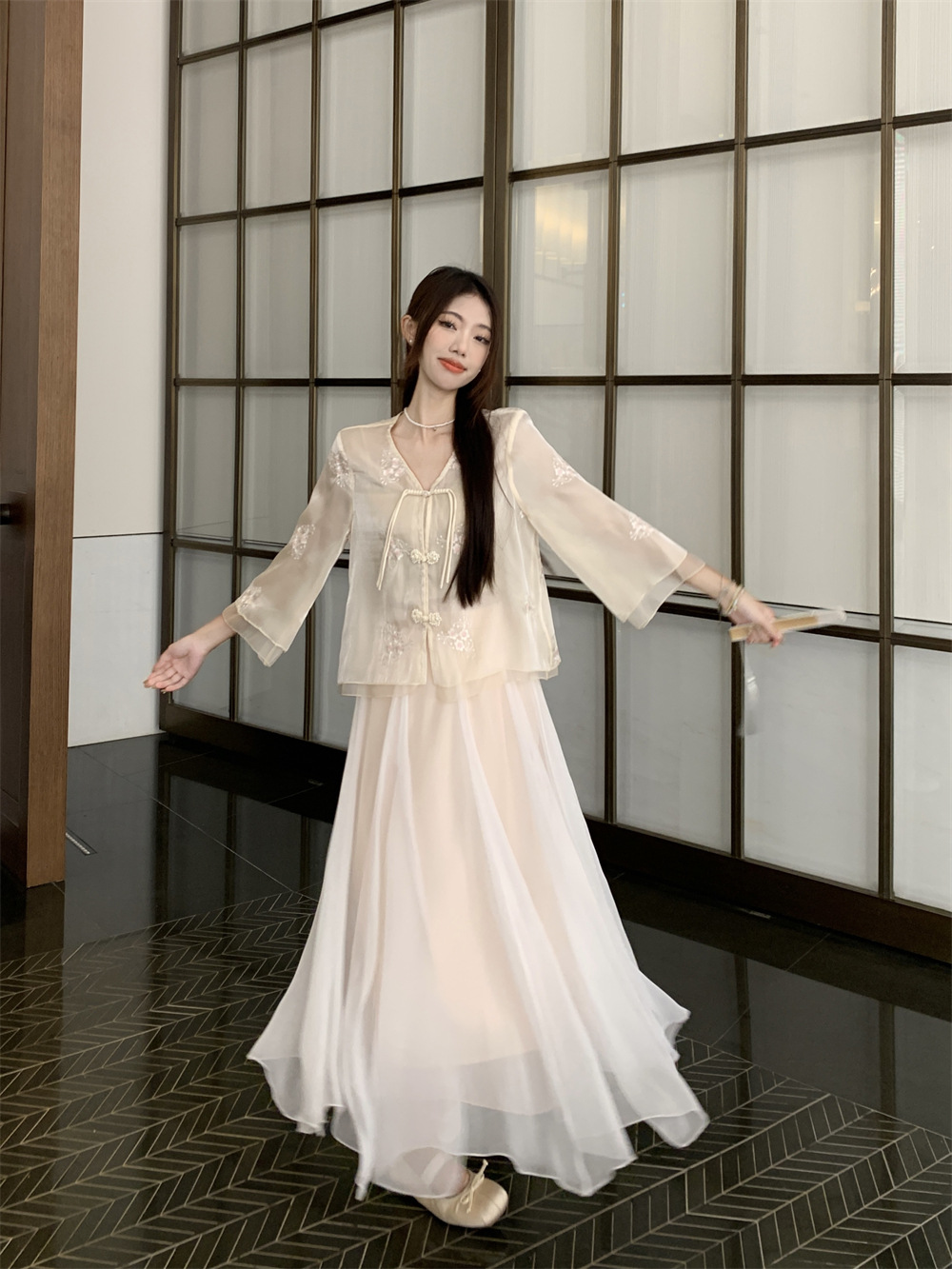JMA-856 实拍 春夏季新中式国风盘扣V领宽松长袖衬衫+高腰显瘦网纱半身裙