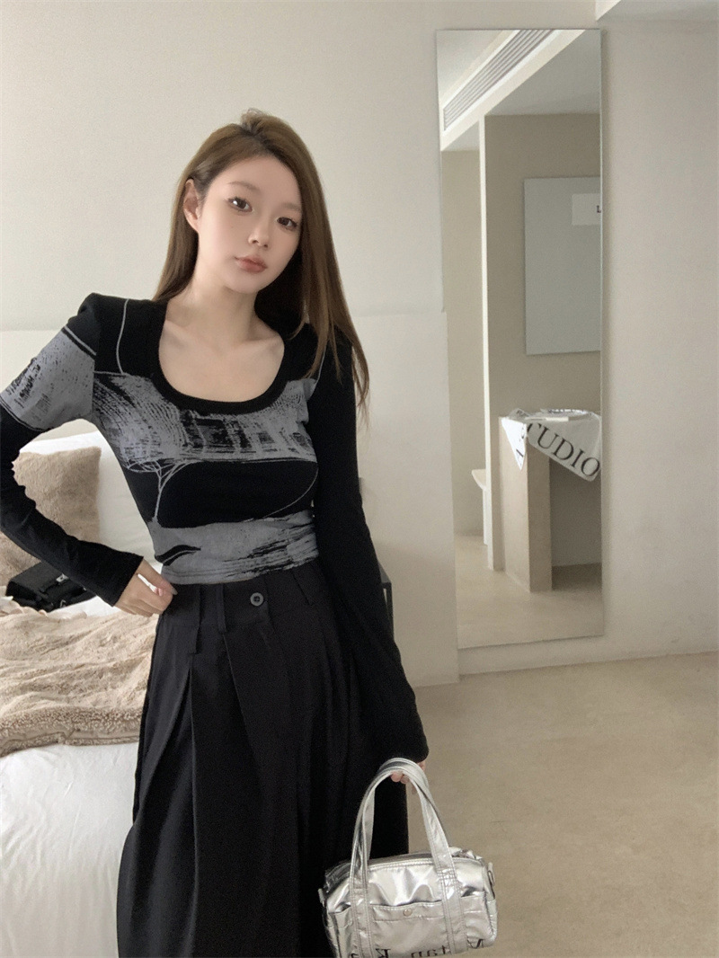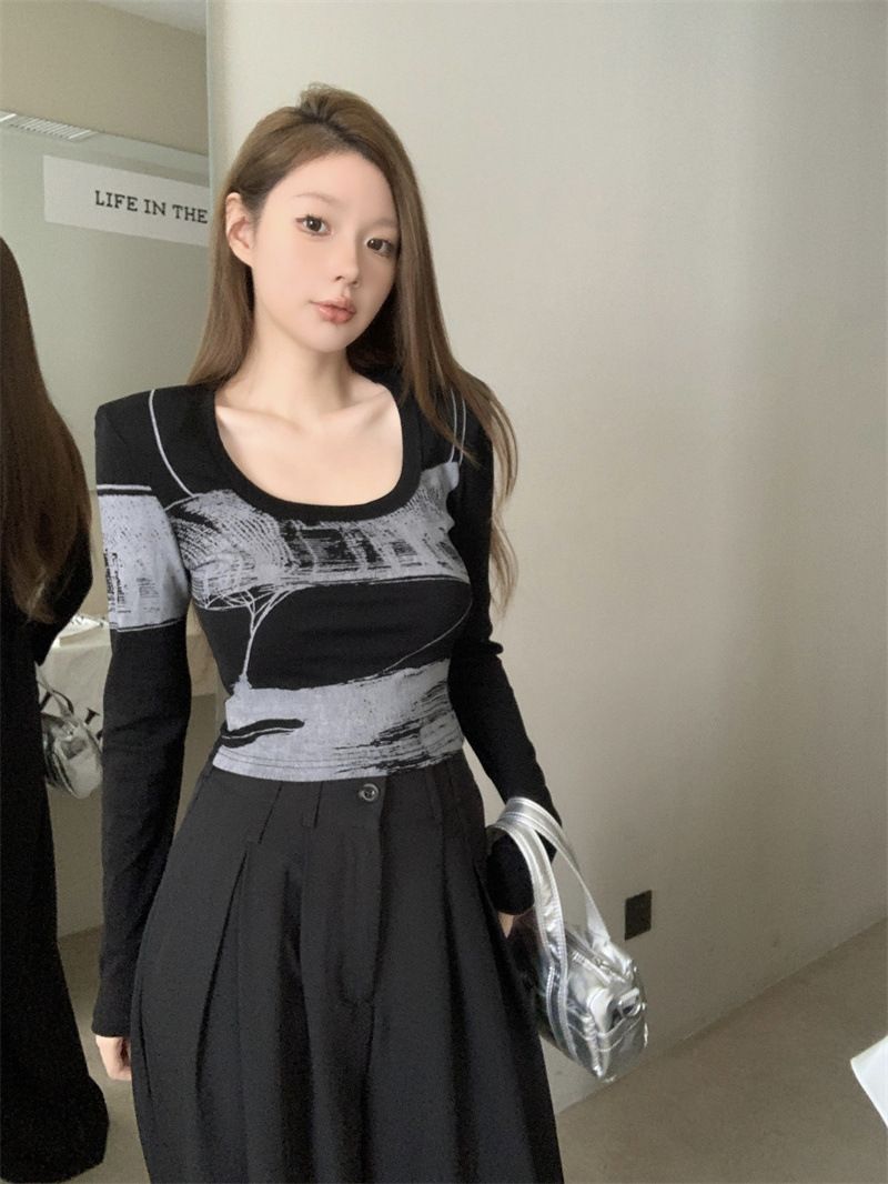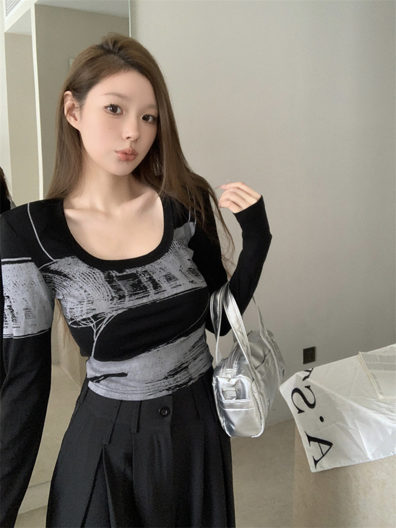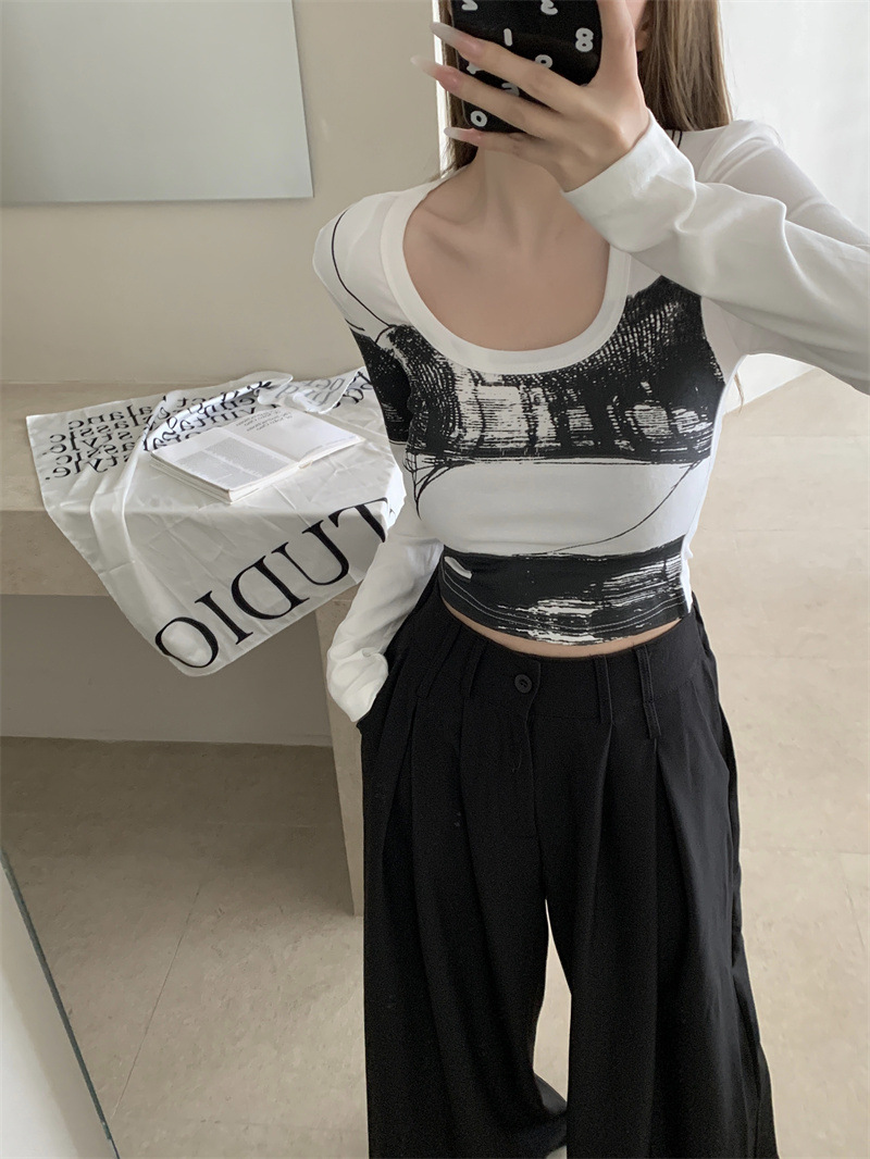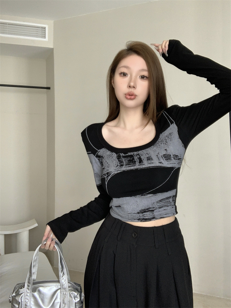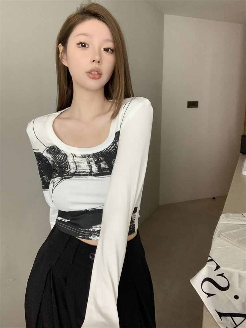 JMA-875 实拍 2024秋季新款小众时髦撞色印花美式辣妹短款修身长袖T恤打底