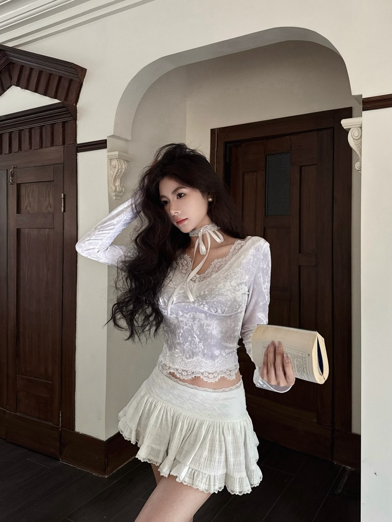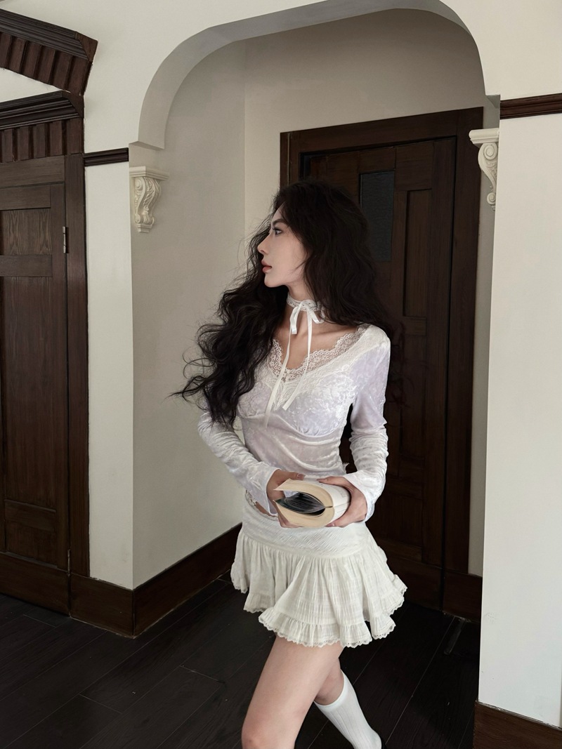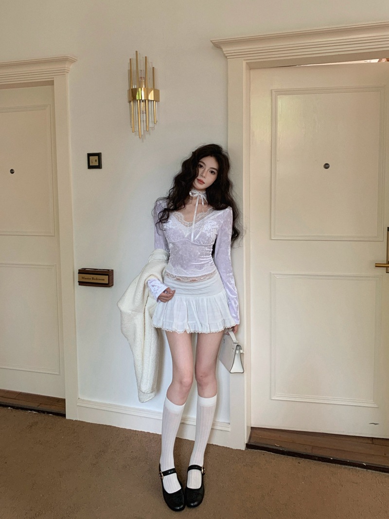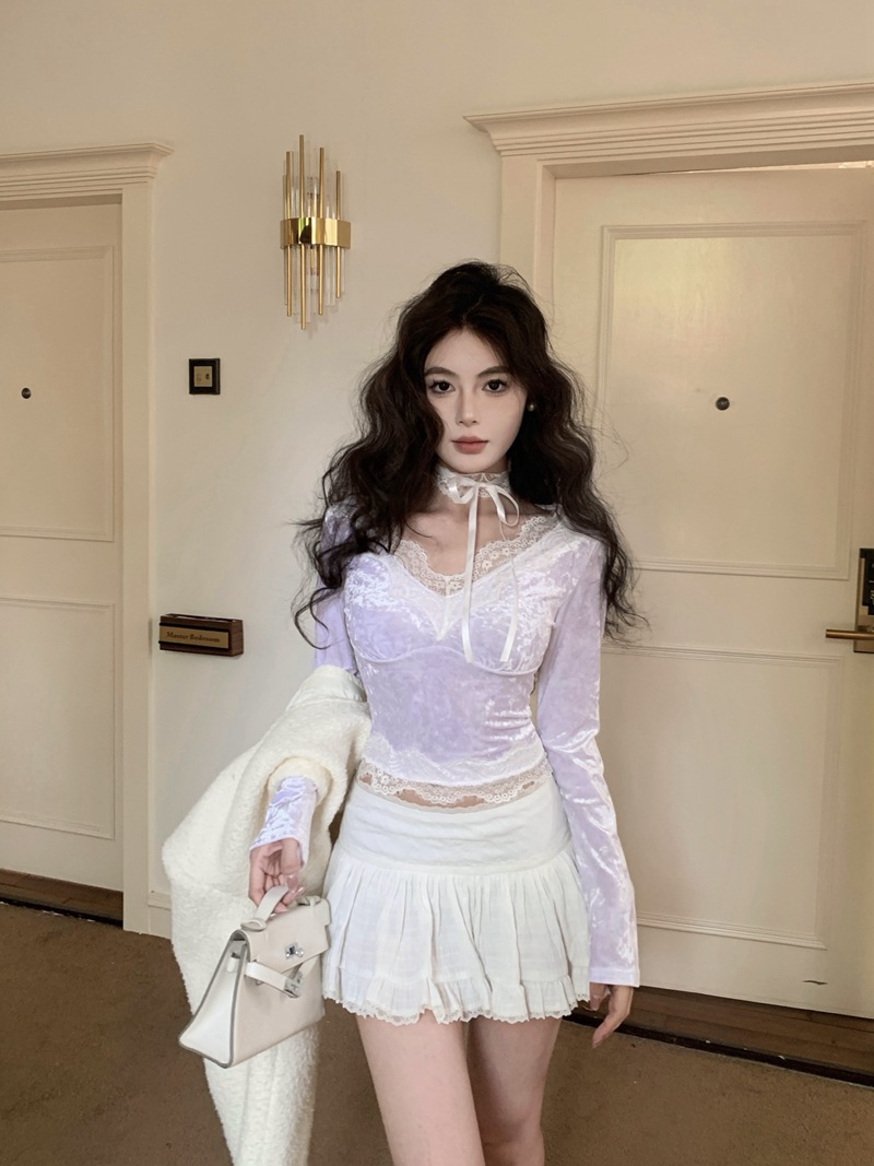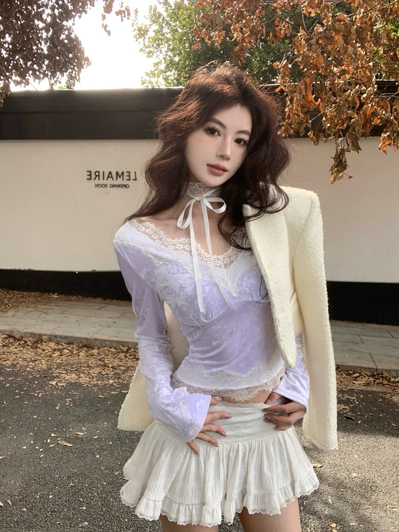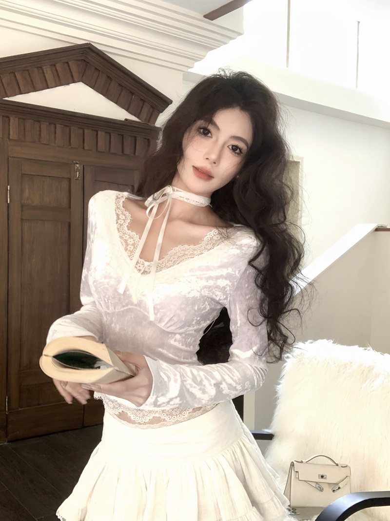 JMA-884 实拍 秋冬法式复古辣妹风V领蕾丝花边拼接丝绒显瘦内搭打底衫上衣
