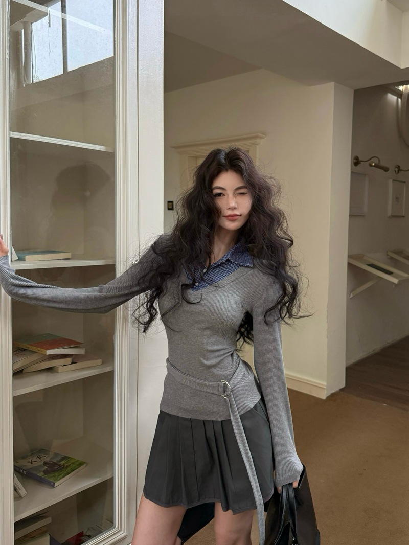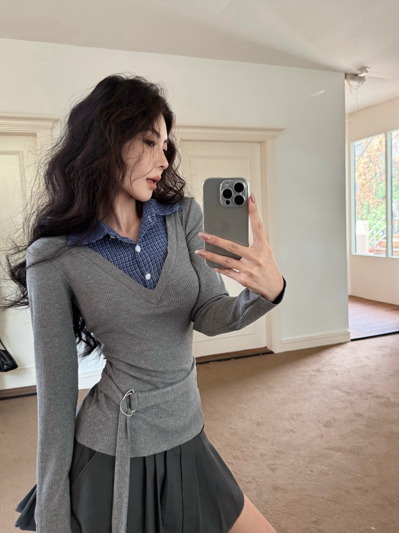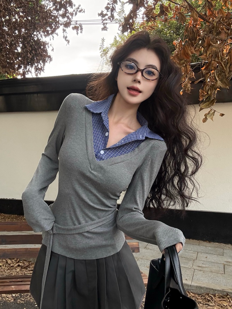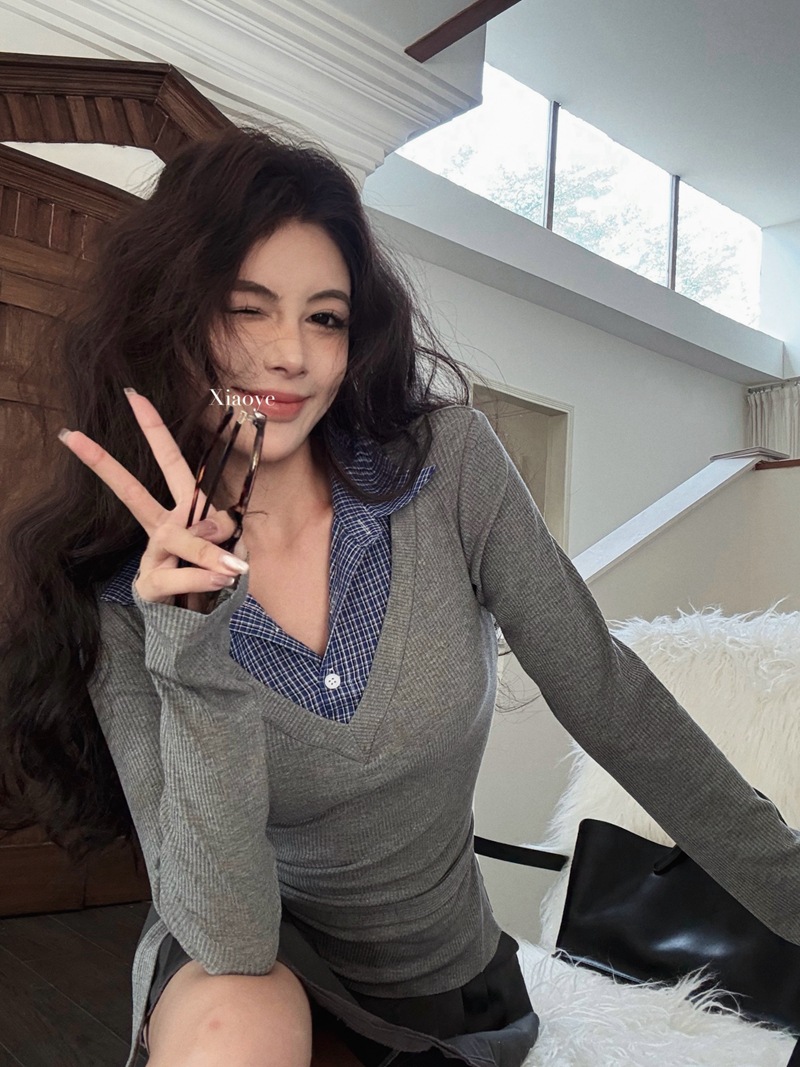JMA-885 实拍 2024秋冬学院风修身V领针织拼接衬衫领假两件内搭打底衫上衣