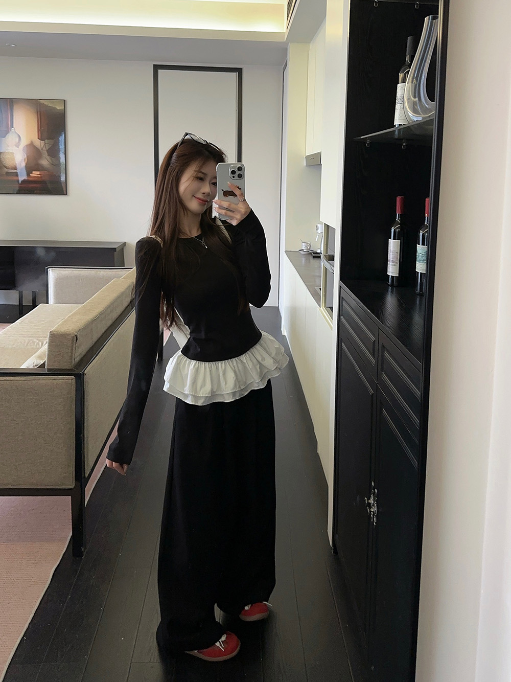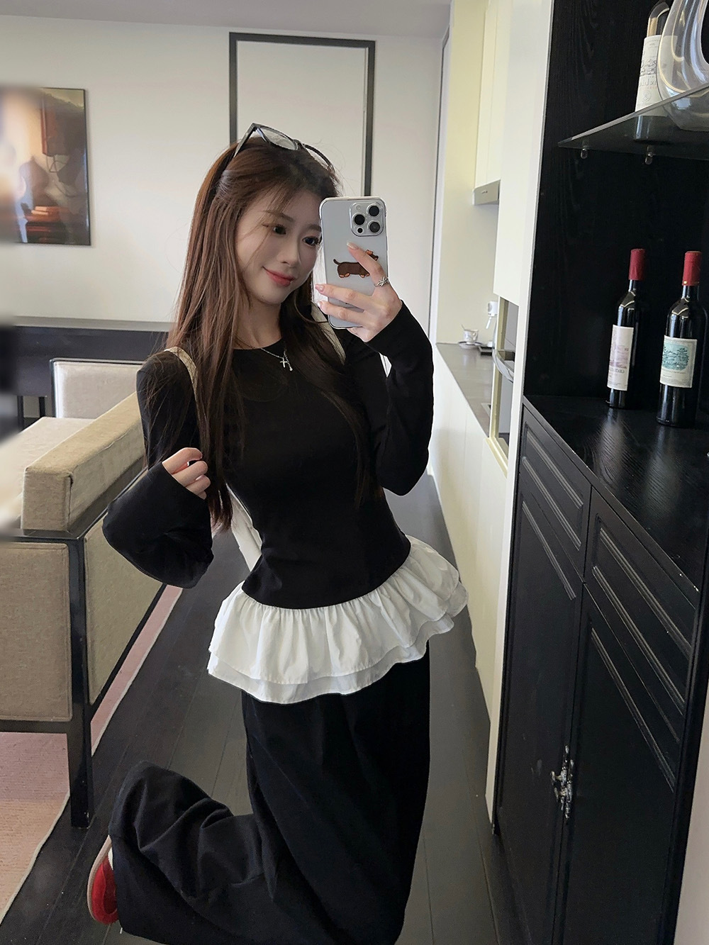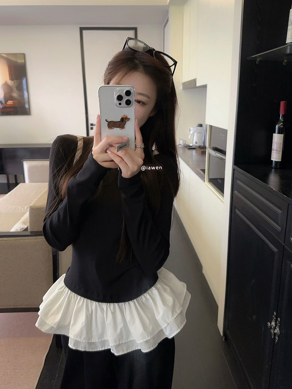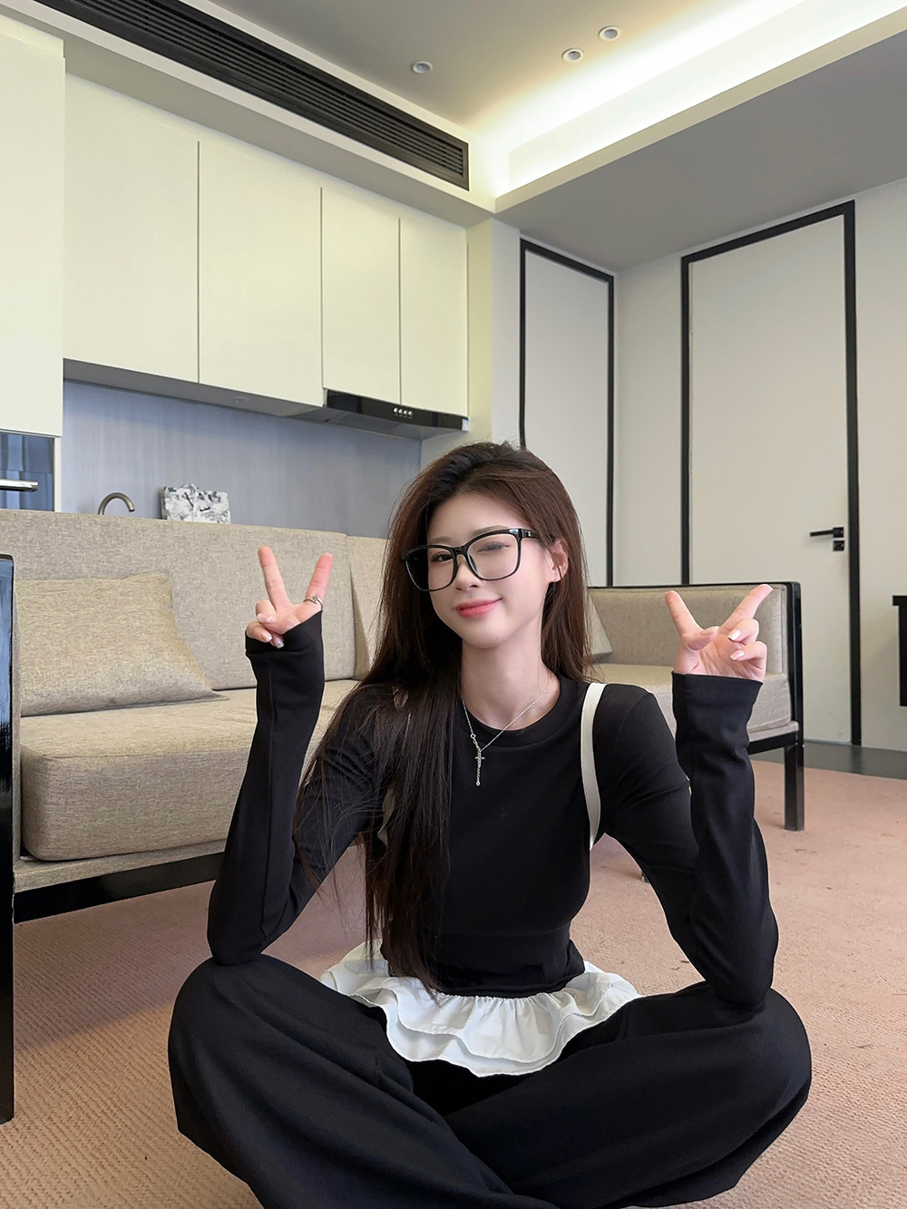 JMA-892 实拍 芭蕾风花边拼接长袖t恤秋季新款修身内搭打底衫上衣潮