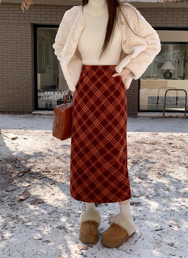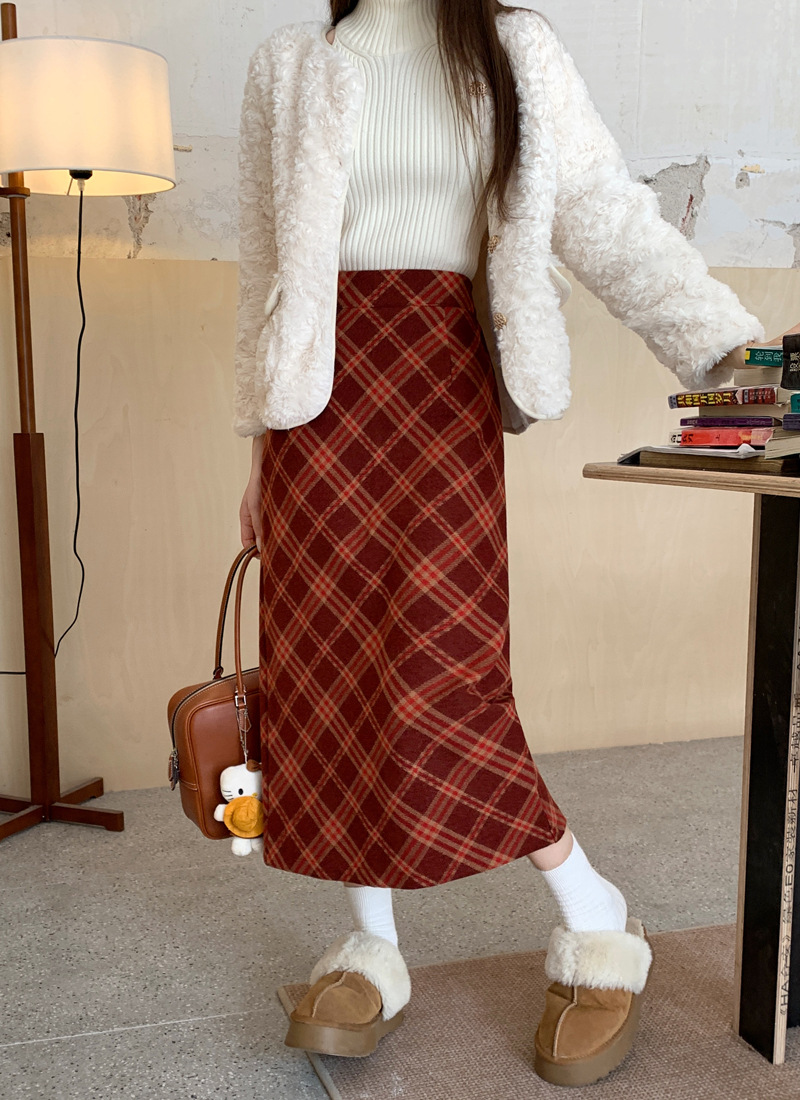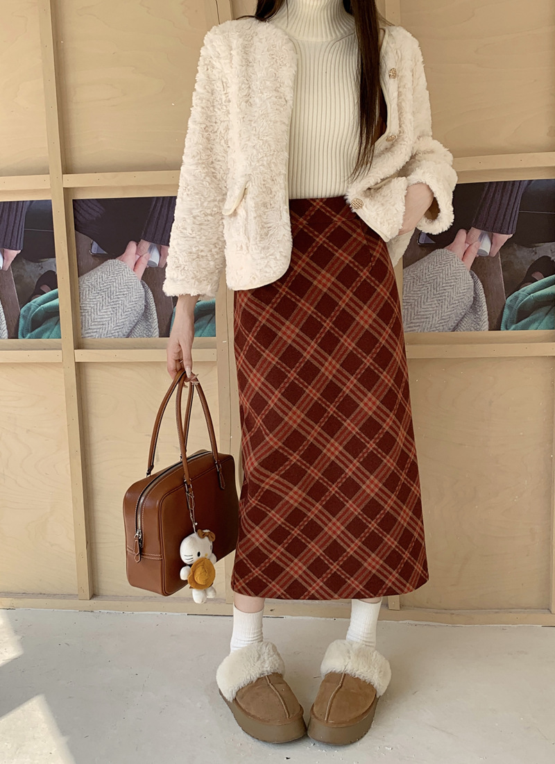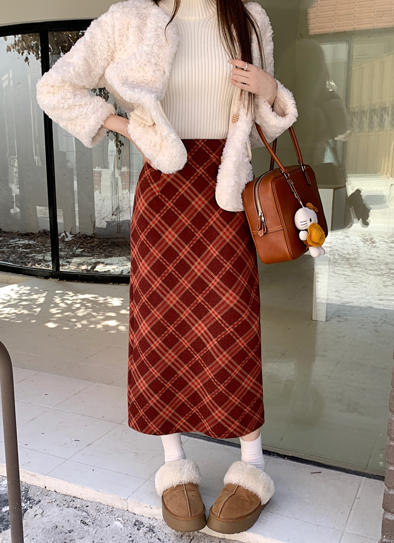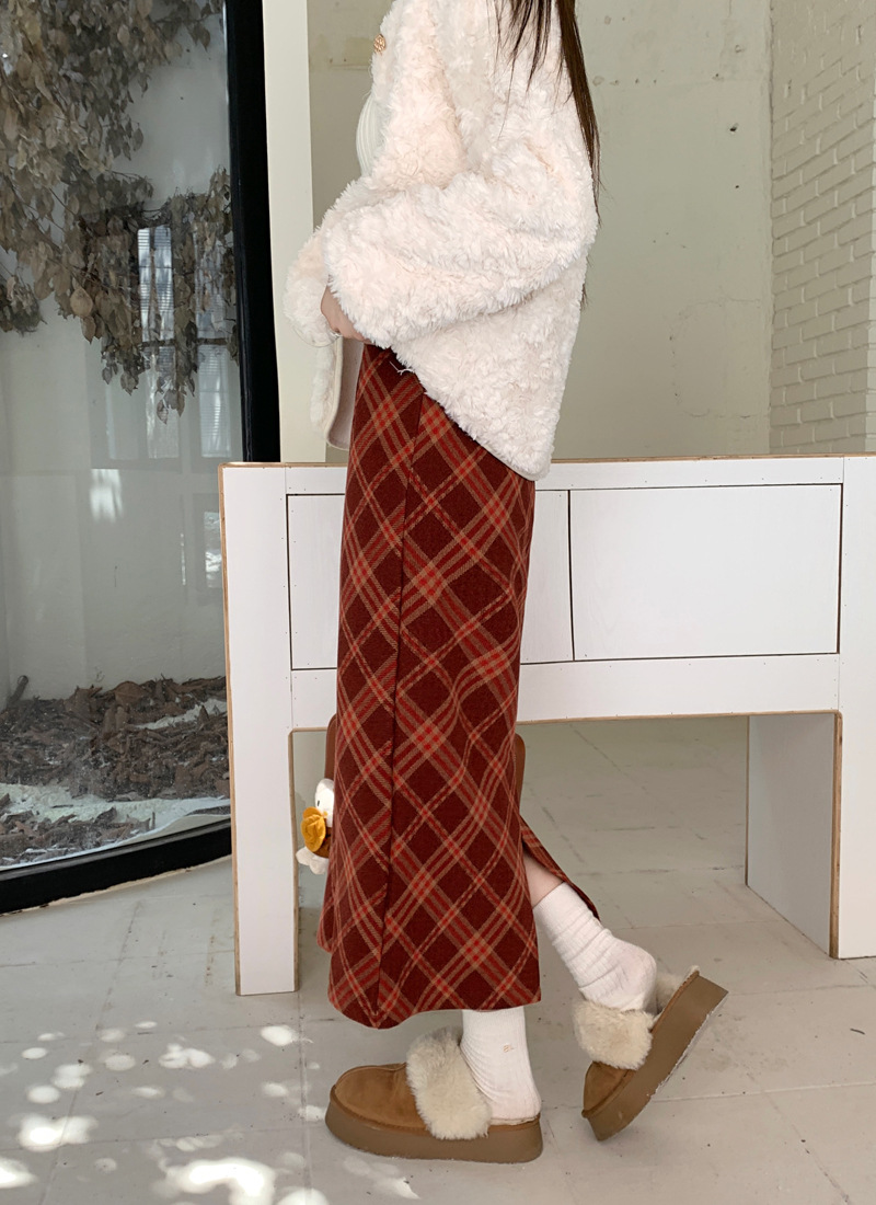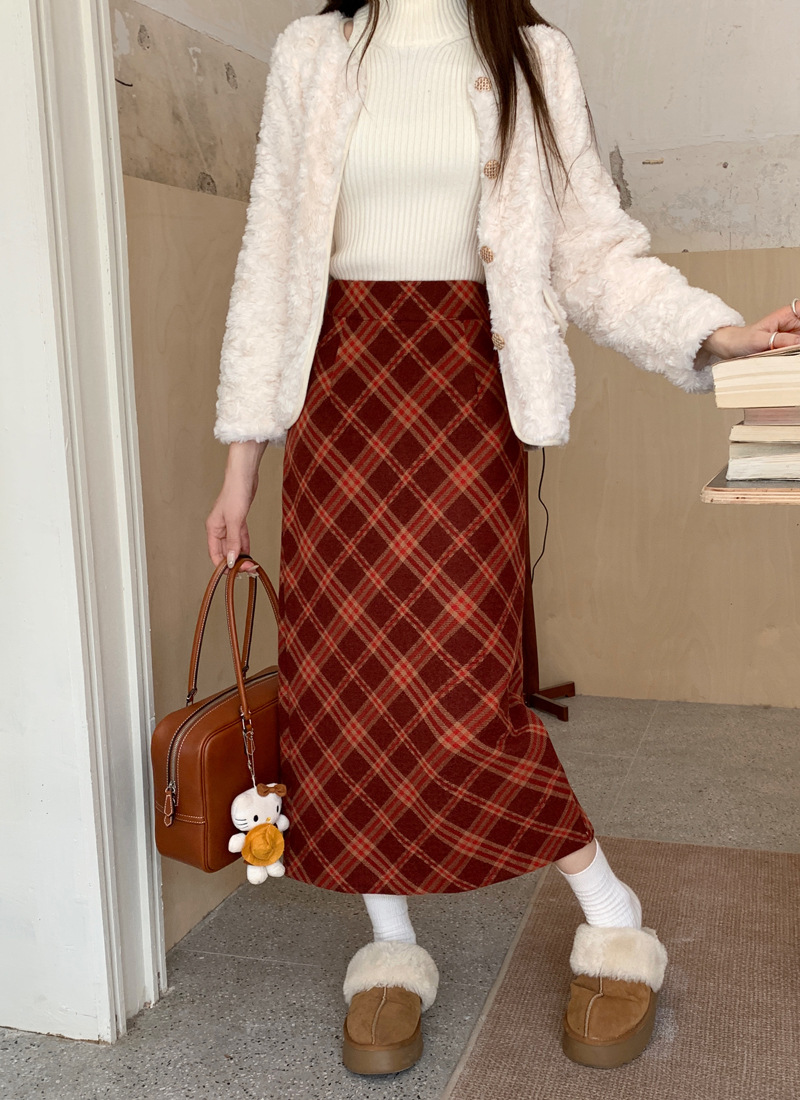JMA-894 实拍 直筒包臀毛呢裙子秋冬季a字美式复古红格子中长款半身裙