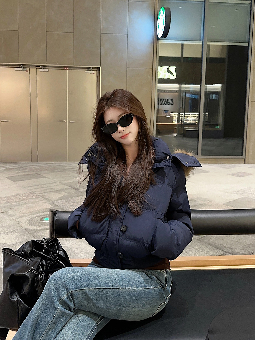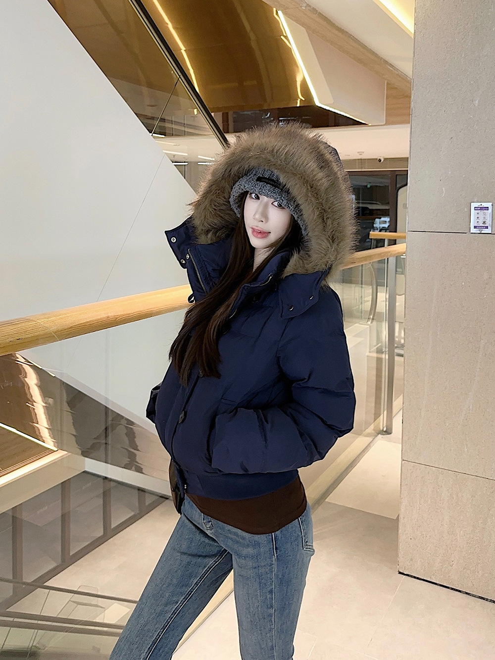 JMA-913 实拍 藏青色连帽毛领设计感棉服外套女2024冬季新款短款保暖棉衣