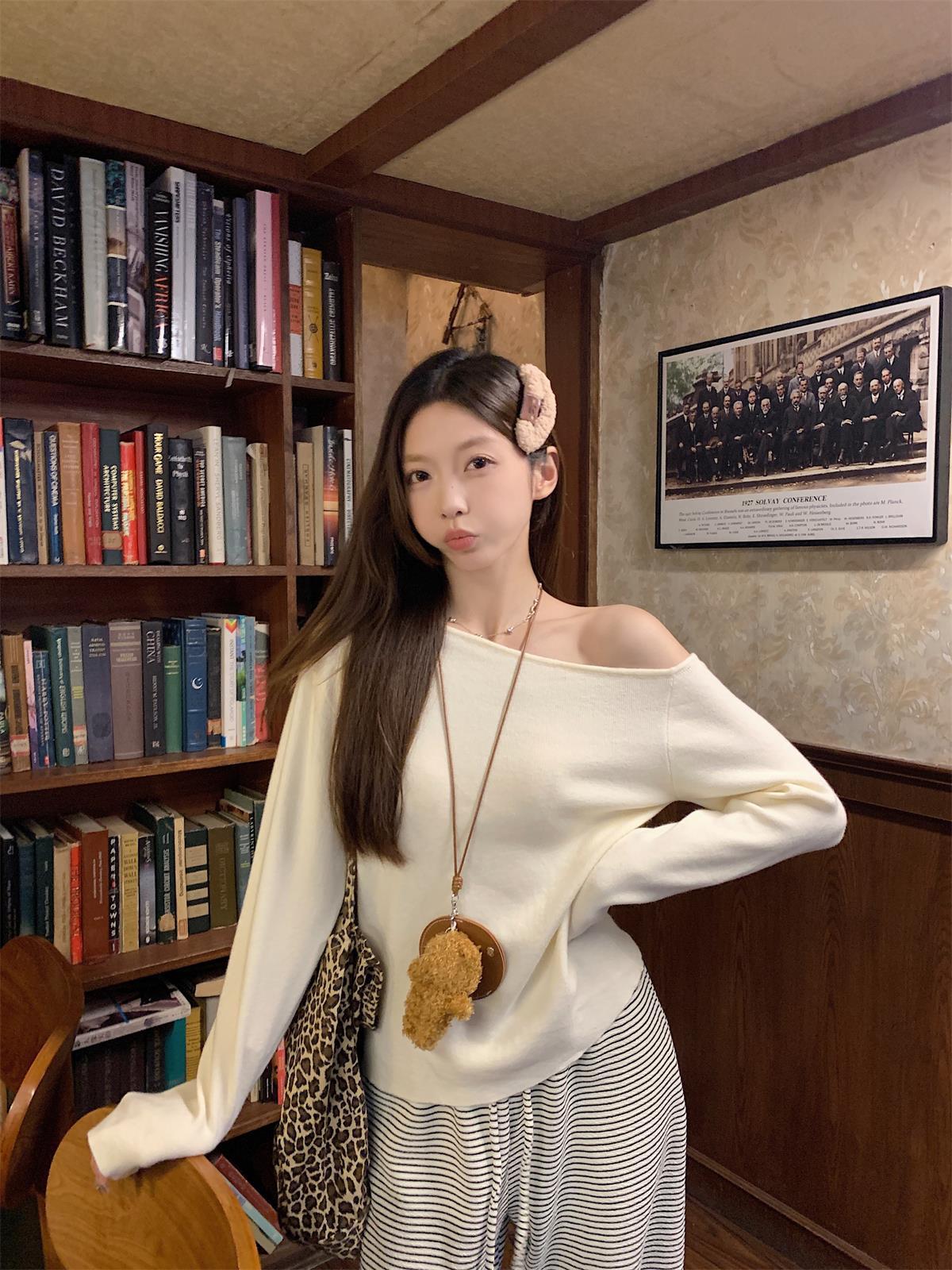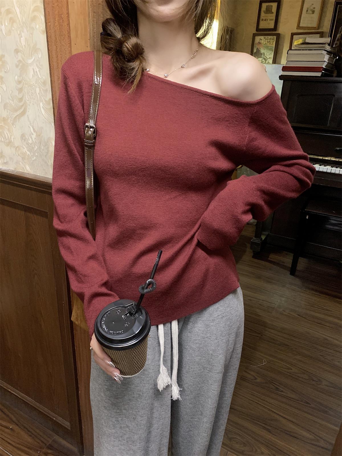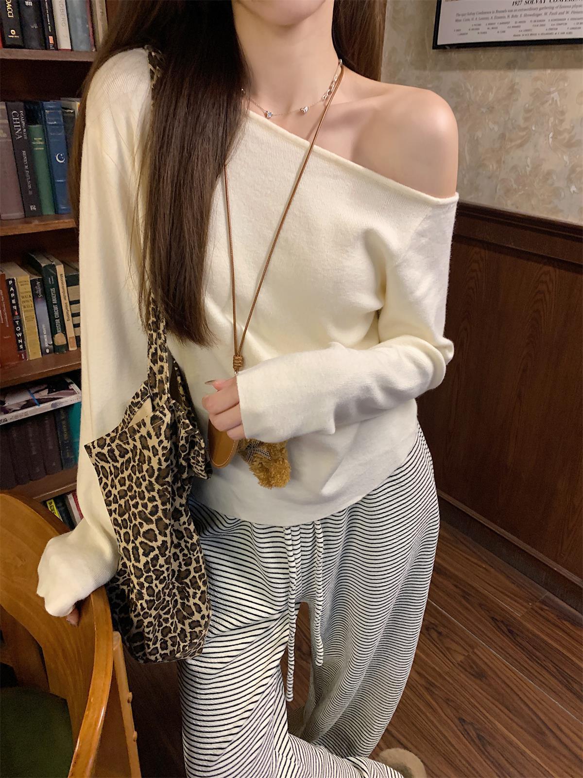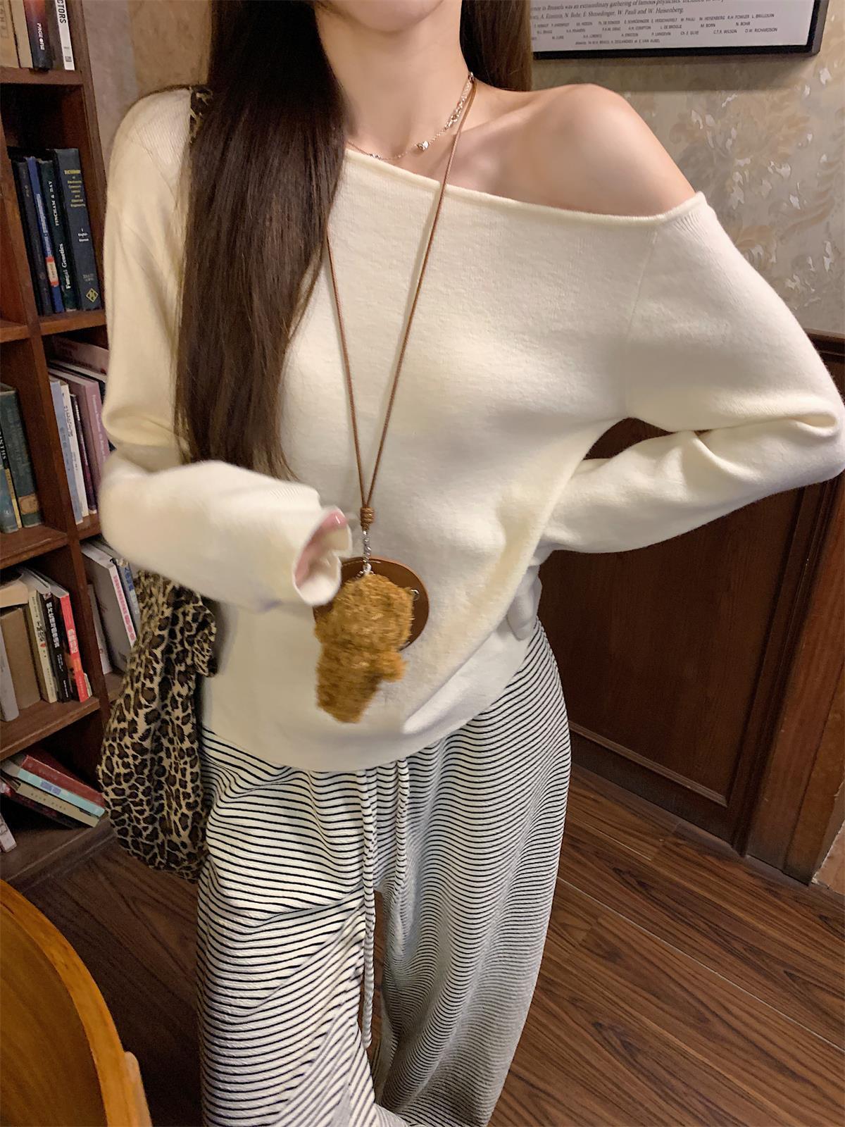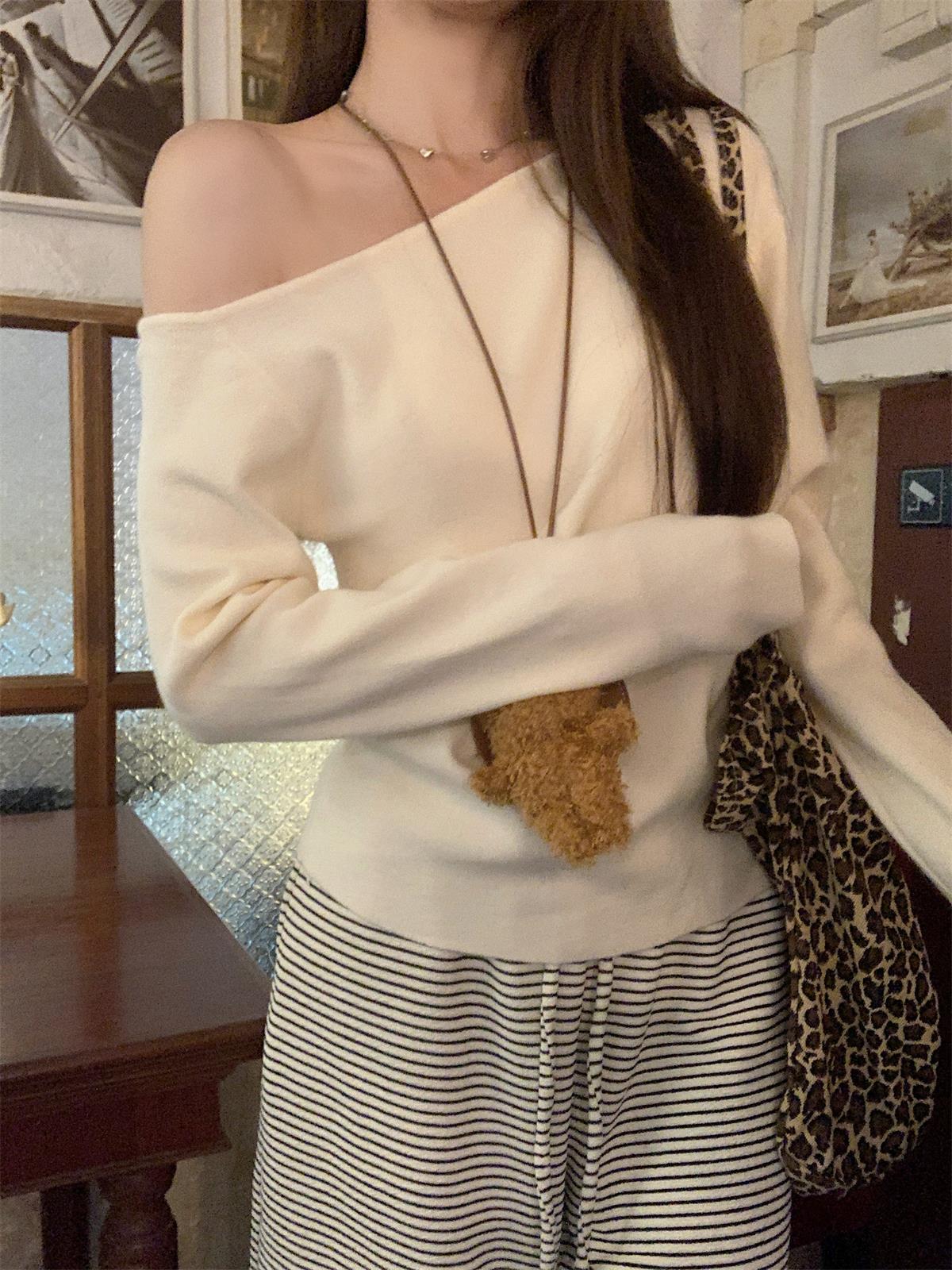 JMA-938 实拍 韩版修身斜领露肩百搭安迪绒针织衫打底长袖簿毛衣
