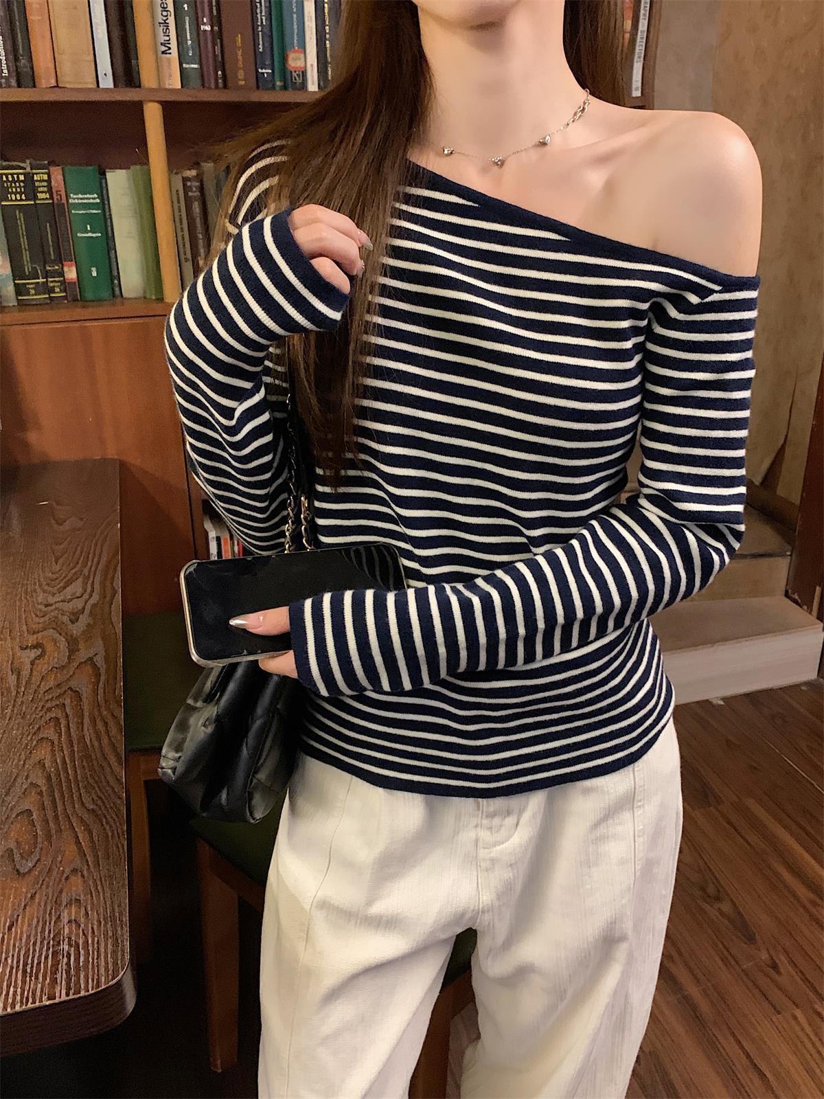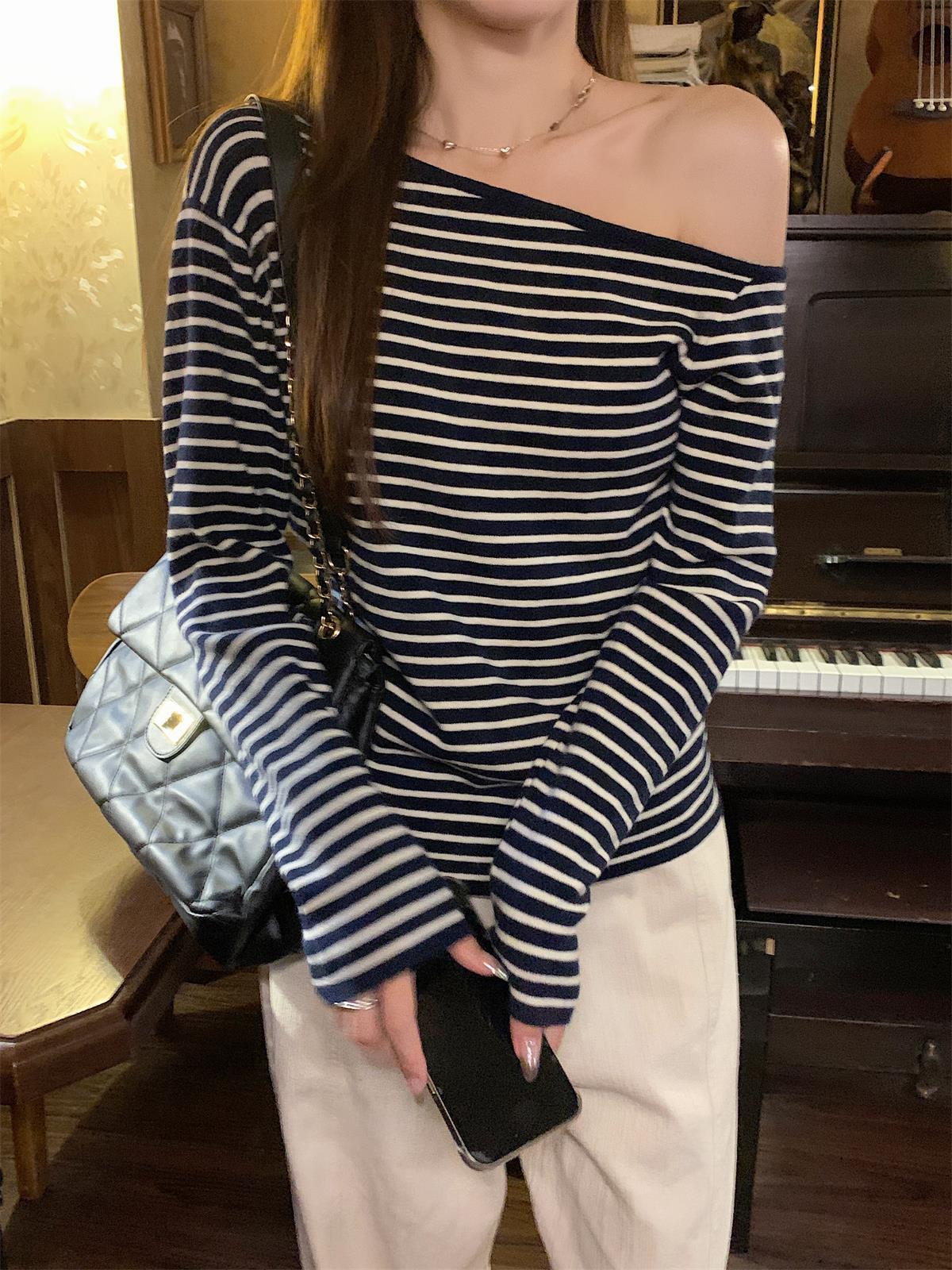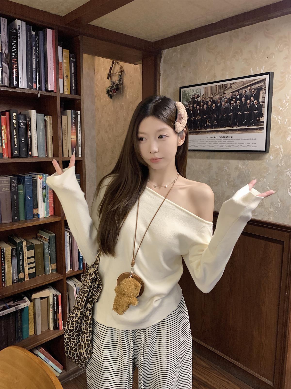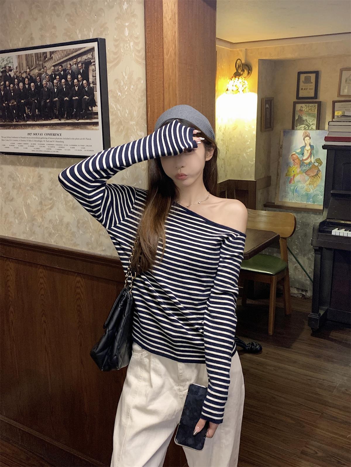JMA-938 实拍 韩版修身斜领露肩百搭安迪绒针织衫打底长袖簿毛衣