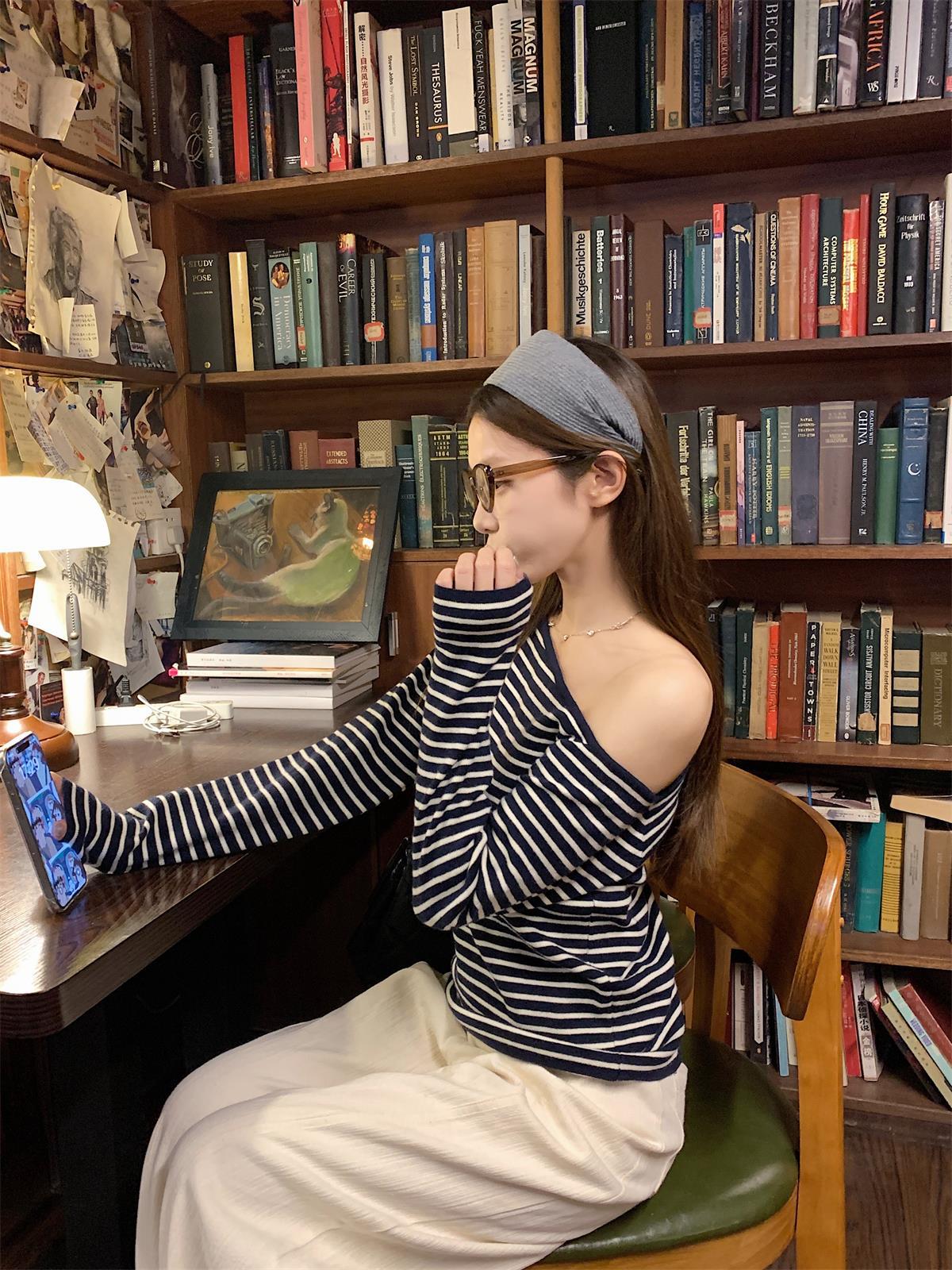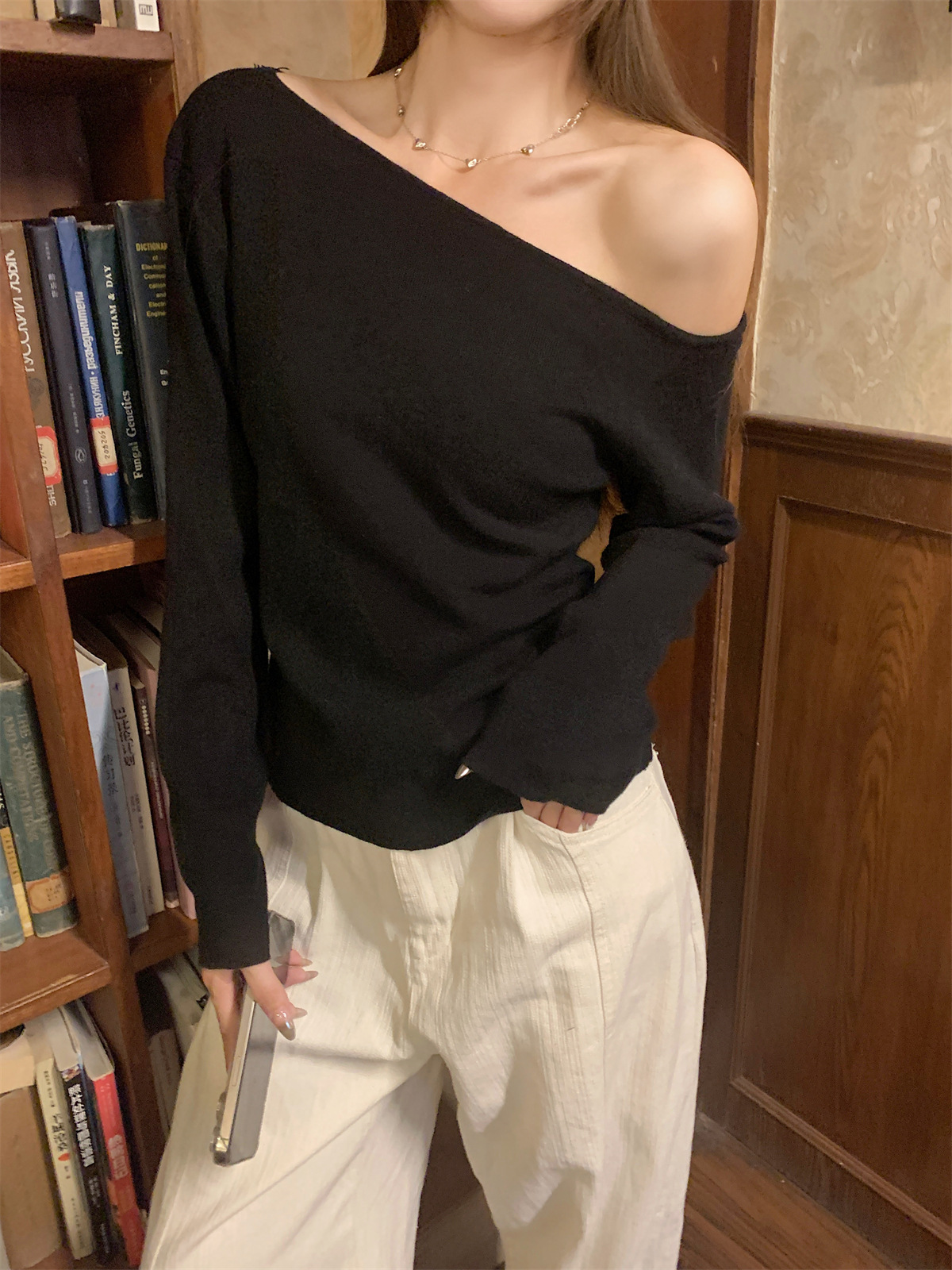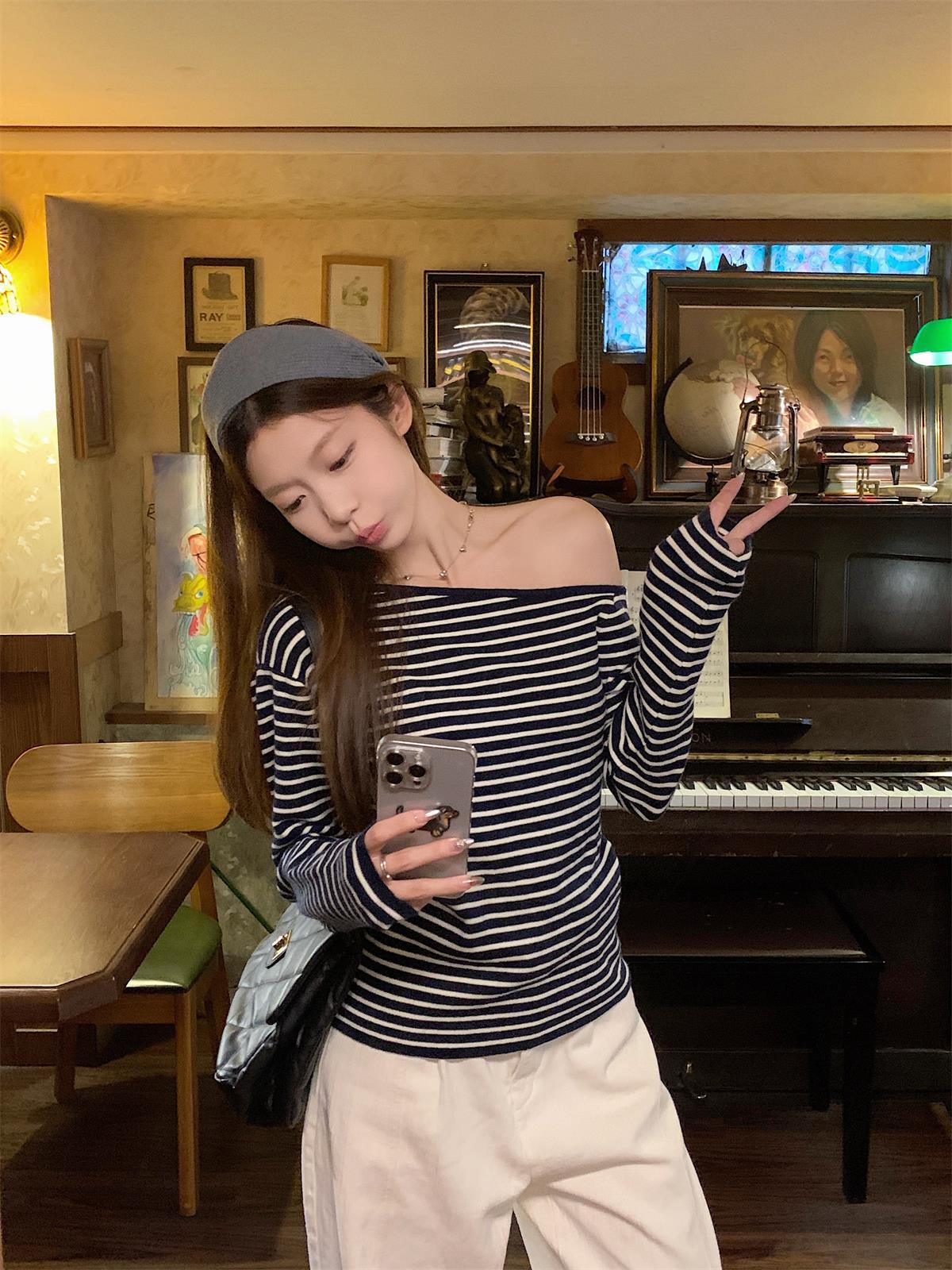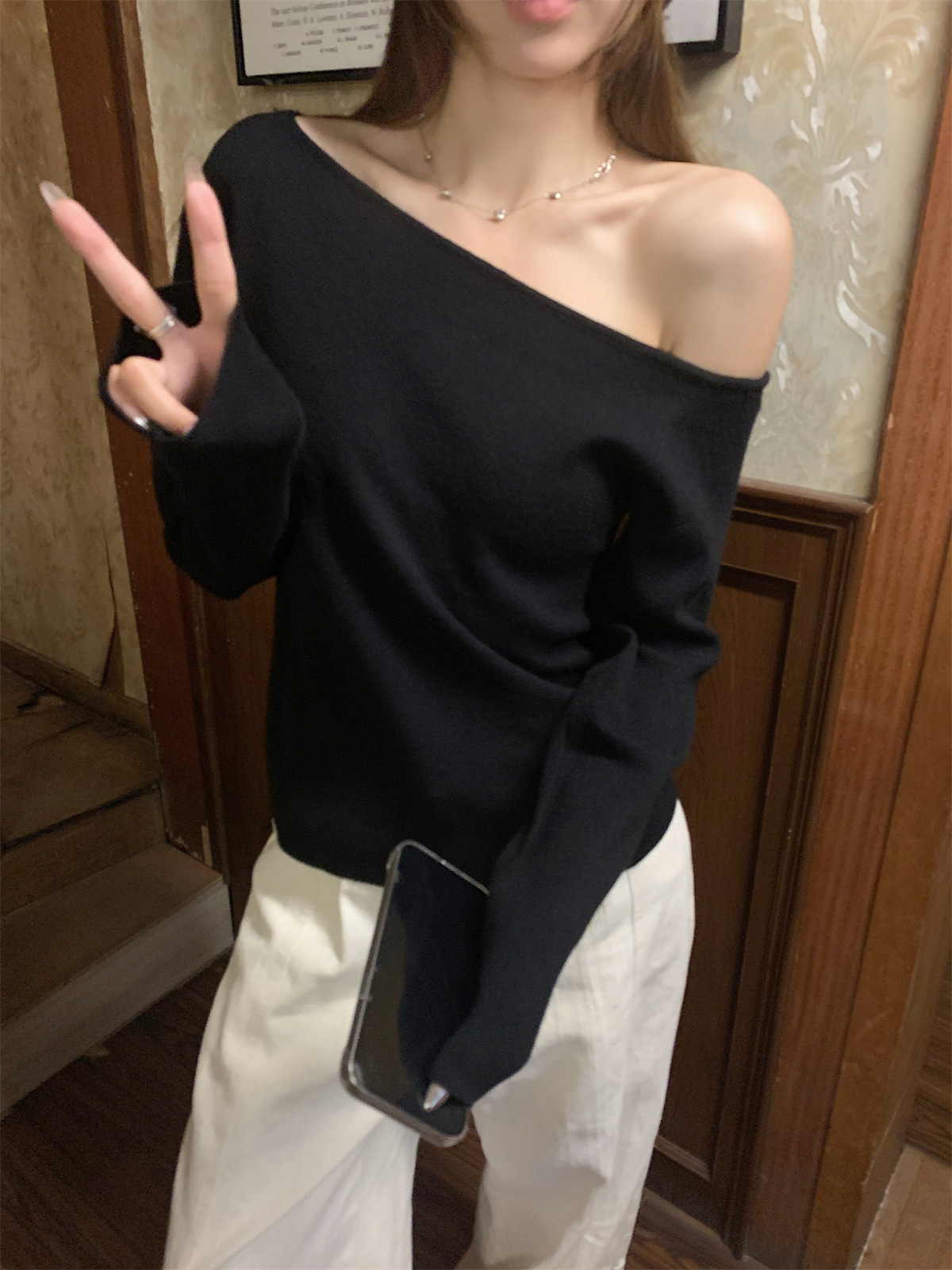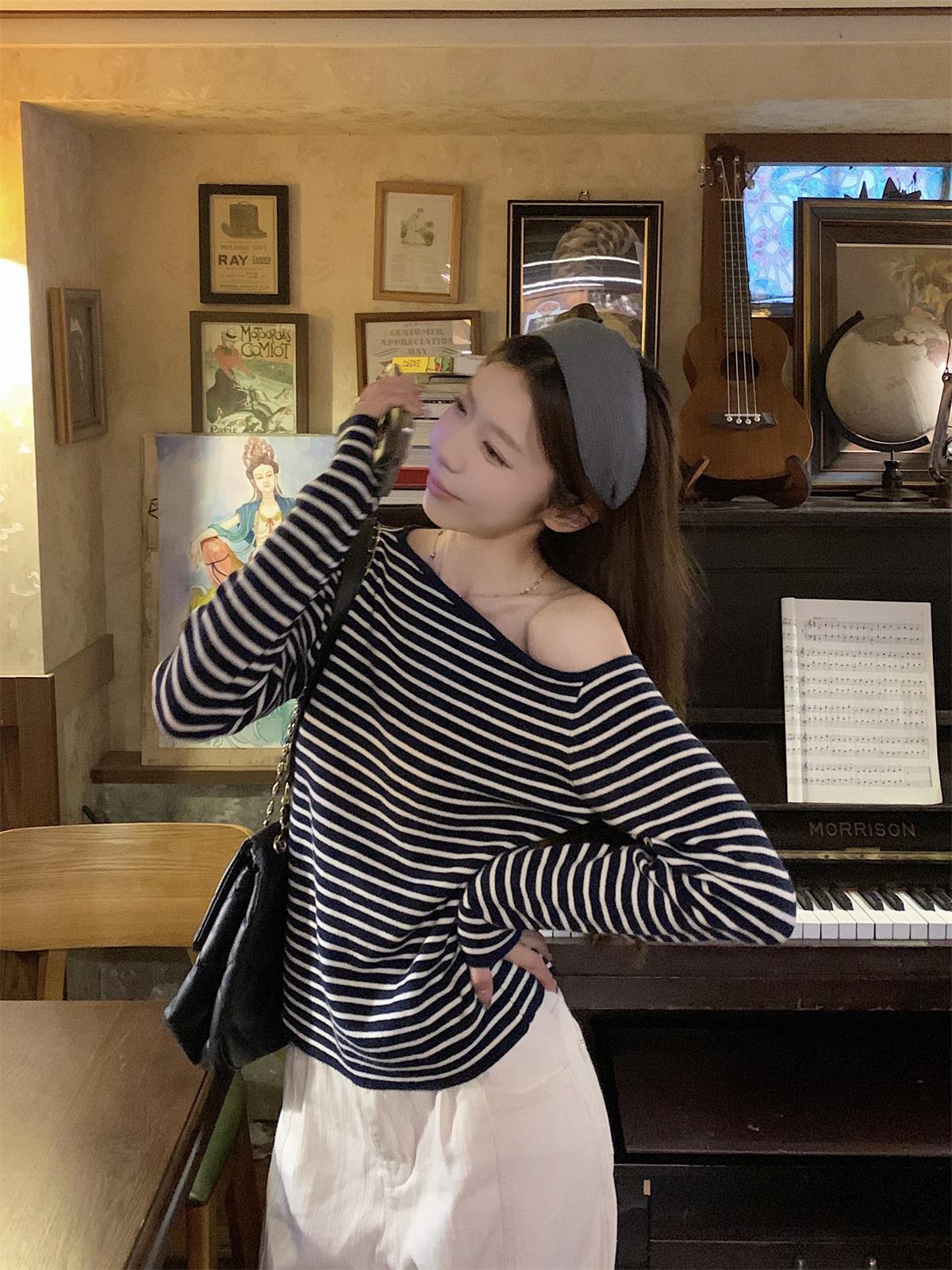 JMA-938 实拍 韩版修身斜领露肩百搭安迪绒针织衫打底长袖簿毛衣