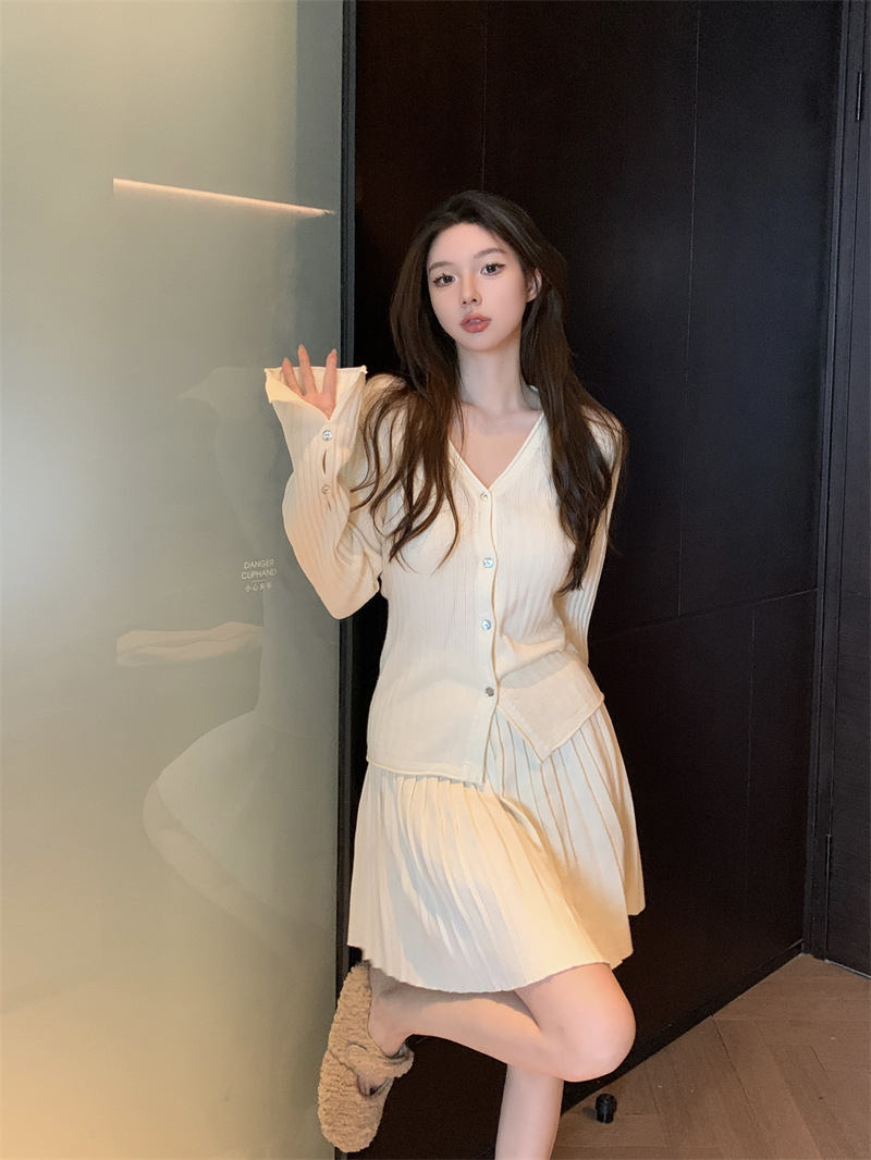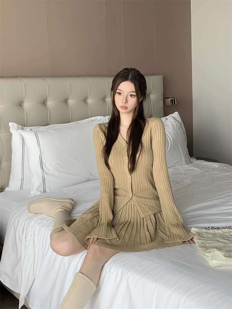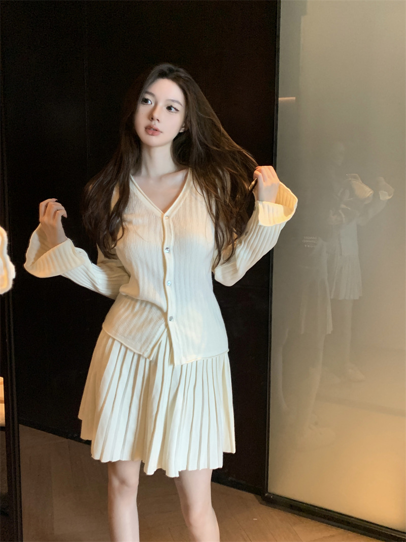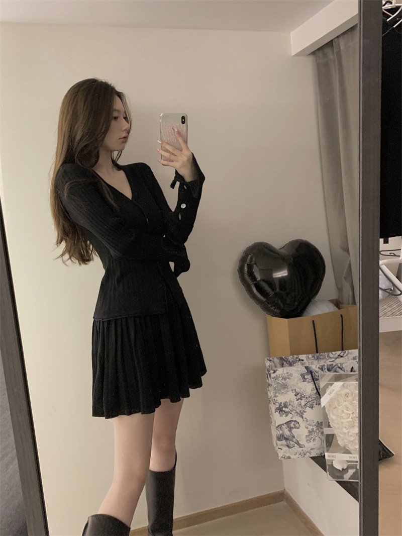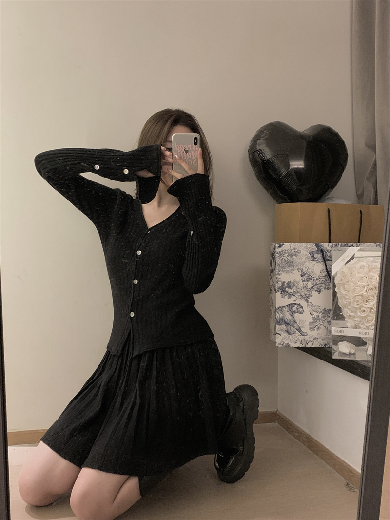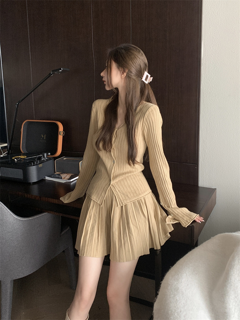 JMA-950 实拍 韩版别致绝美套装女甜辣气质针织衫收腰百褶短裙针织两件套