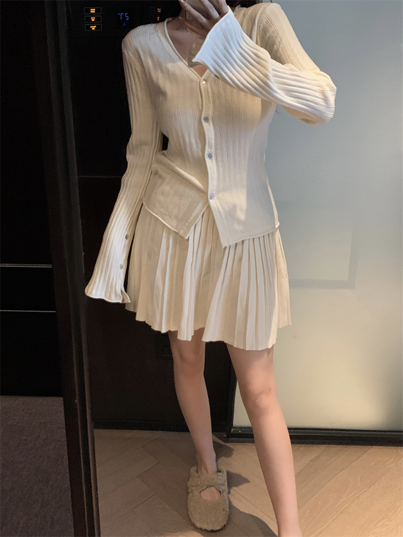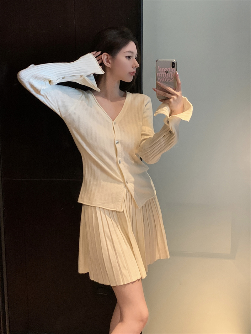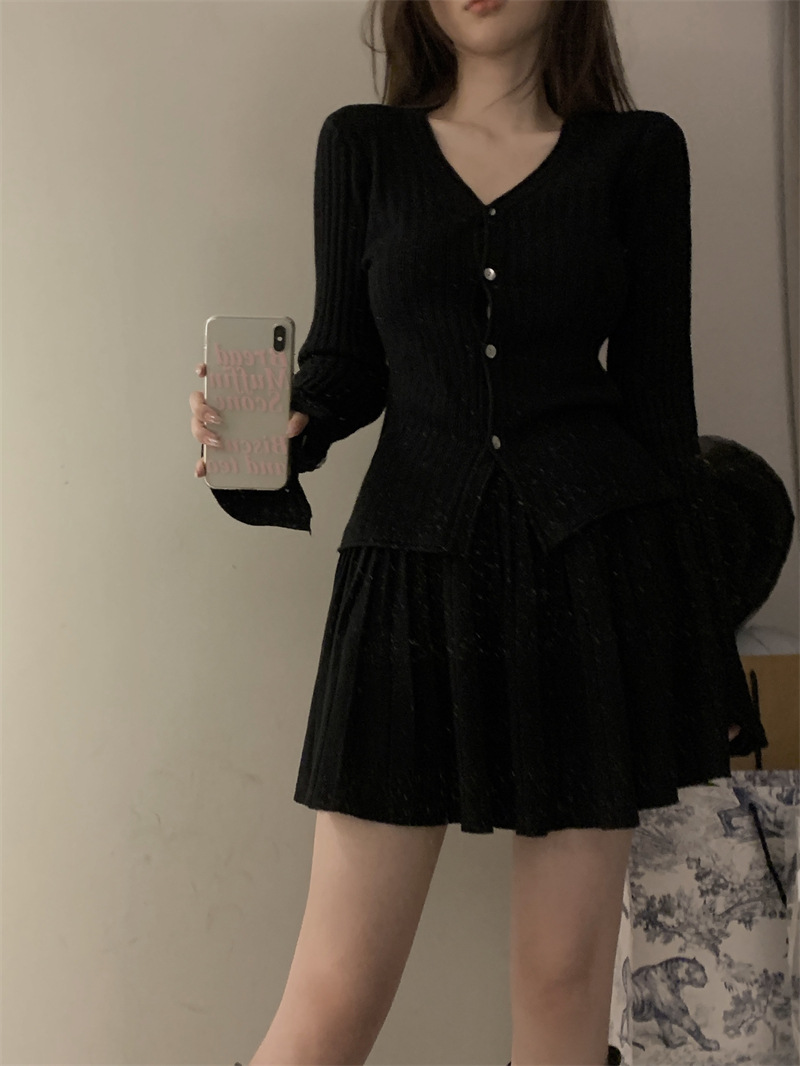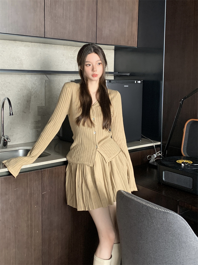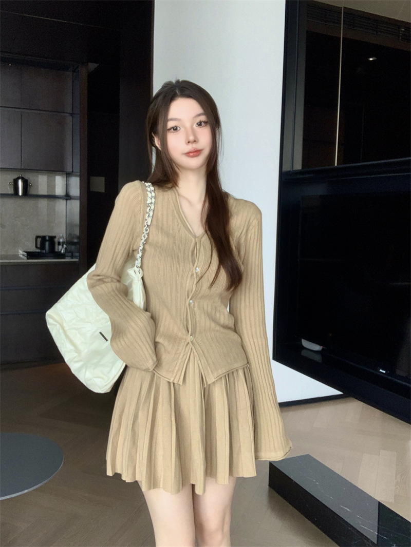 JMA-950 实拍 韩版别致绝美套装女甜辣气质针织衫收腰百褶短裙针织两件套