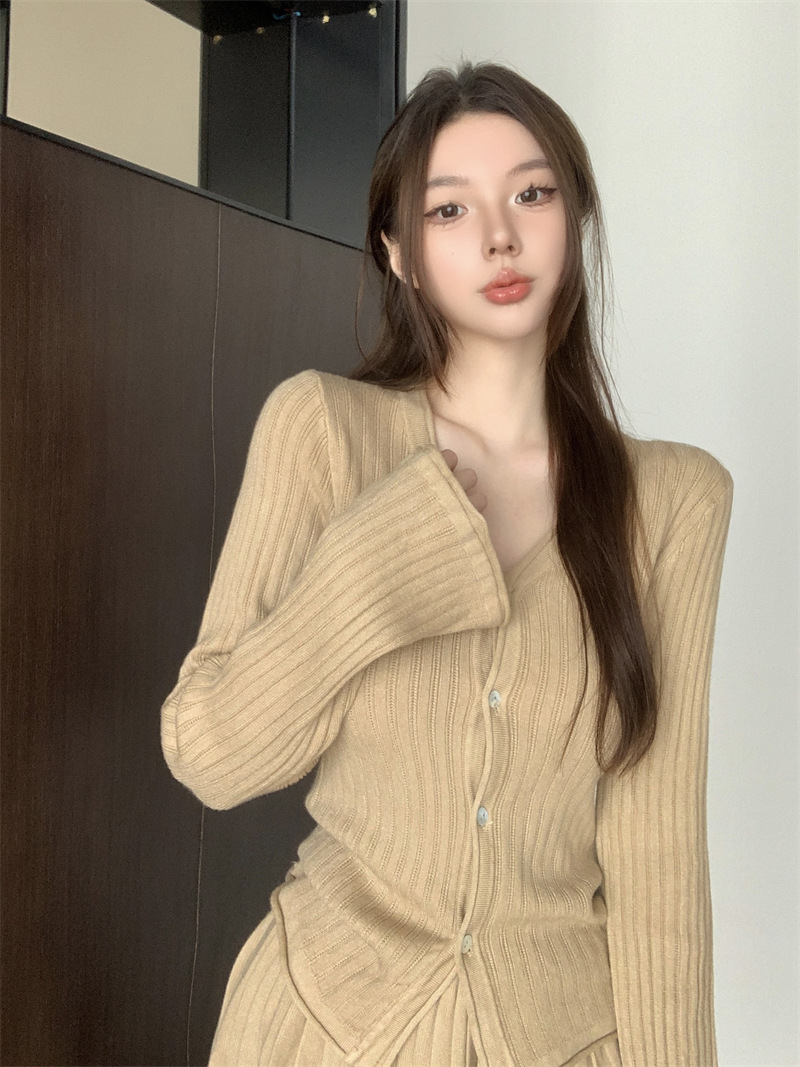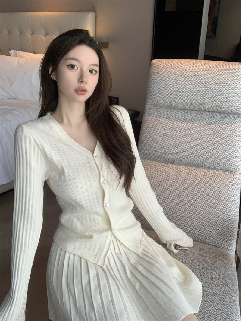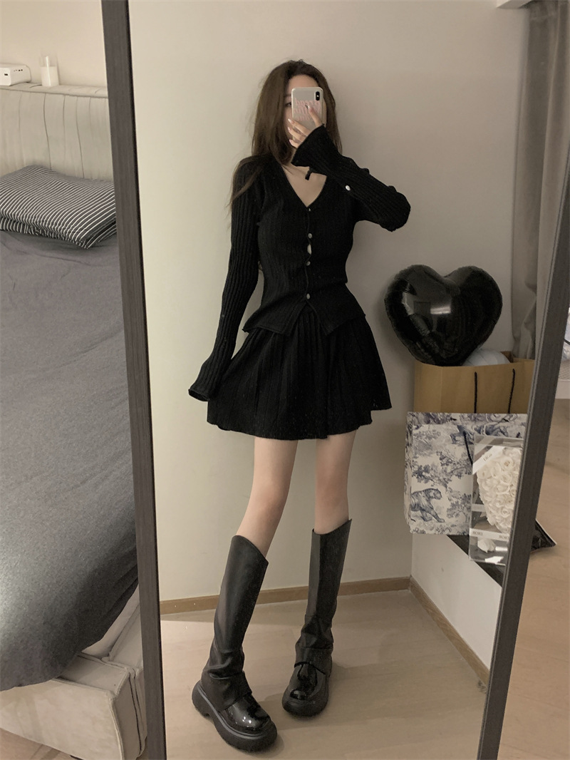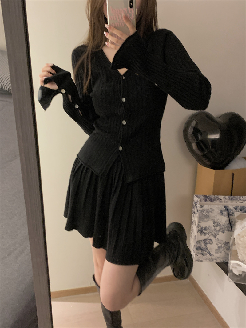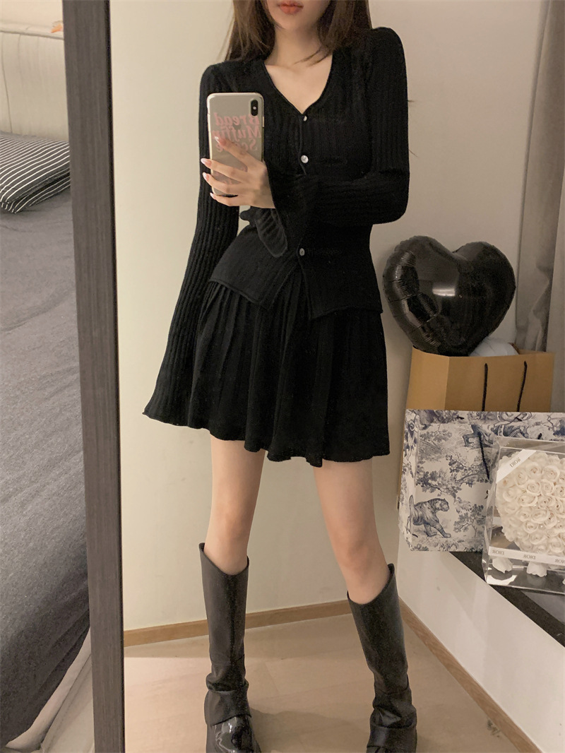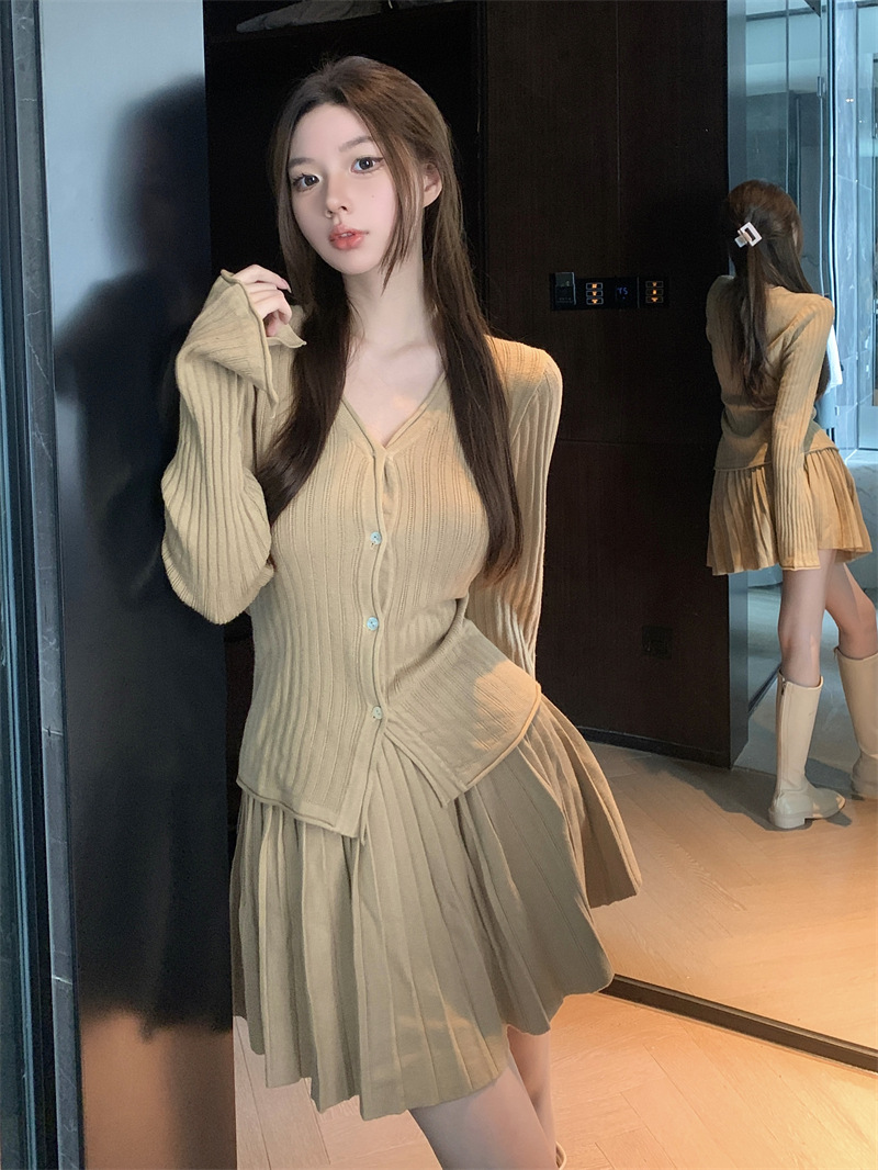 JMA-950 实拍 韩版别致绝美套装女甜辣气质针织衫收腰百褶短裙针织两件套