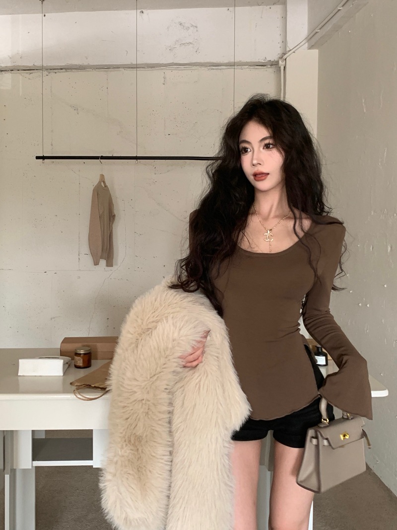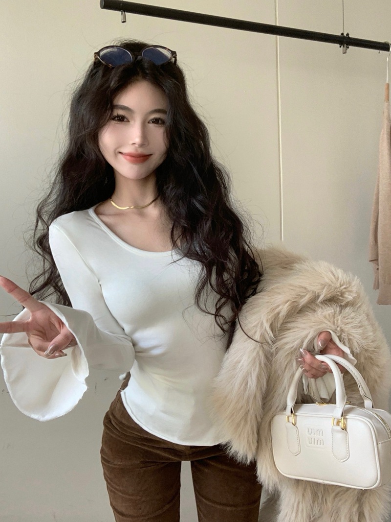 JMA-972 实拍2024秋冬喇叭袖性感加绒打底衫女设计感修身显瘦内搭垫肩上衣