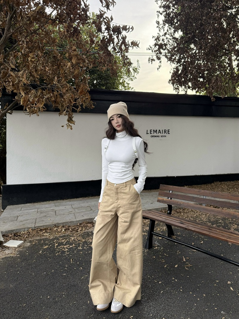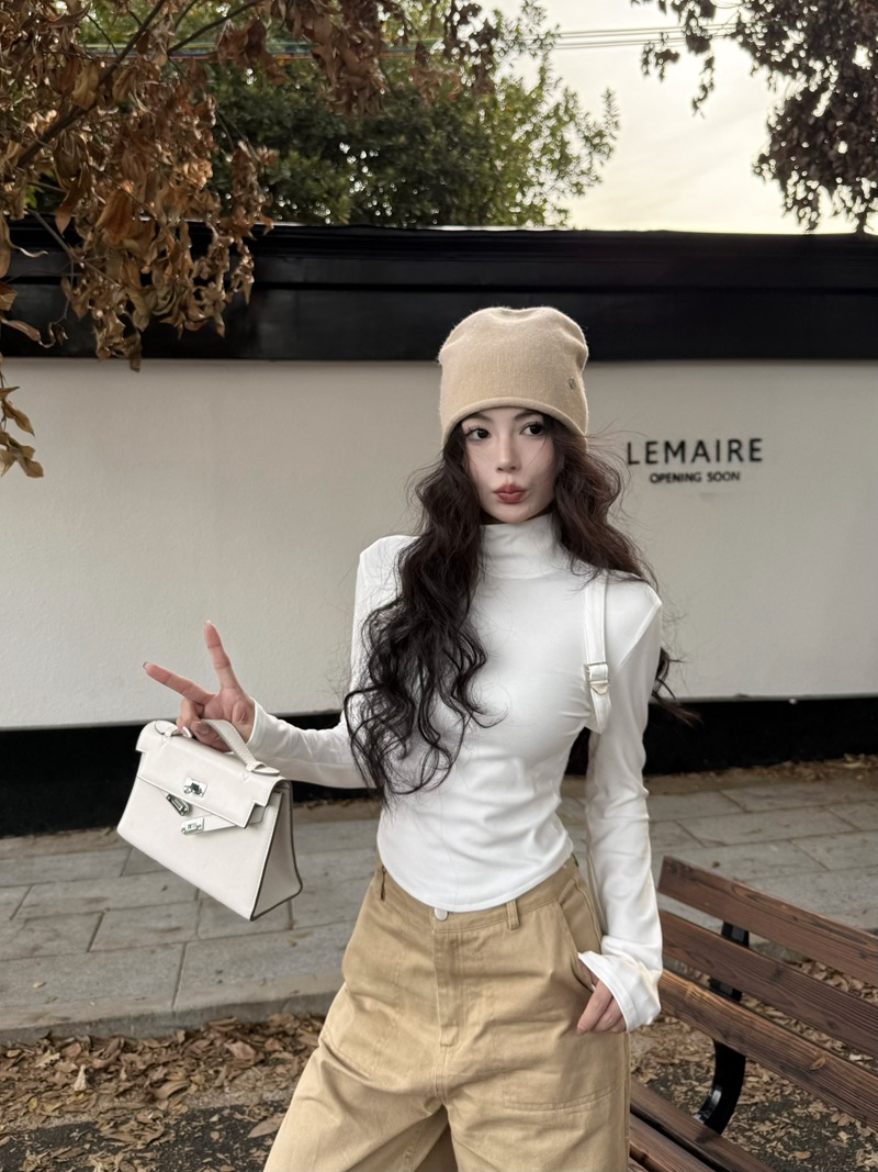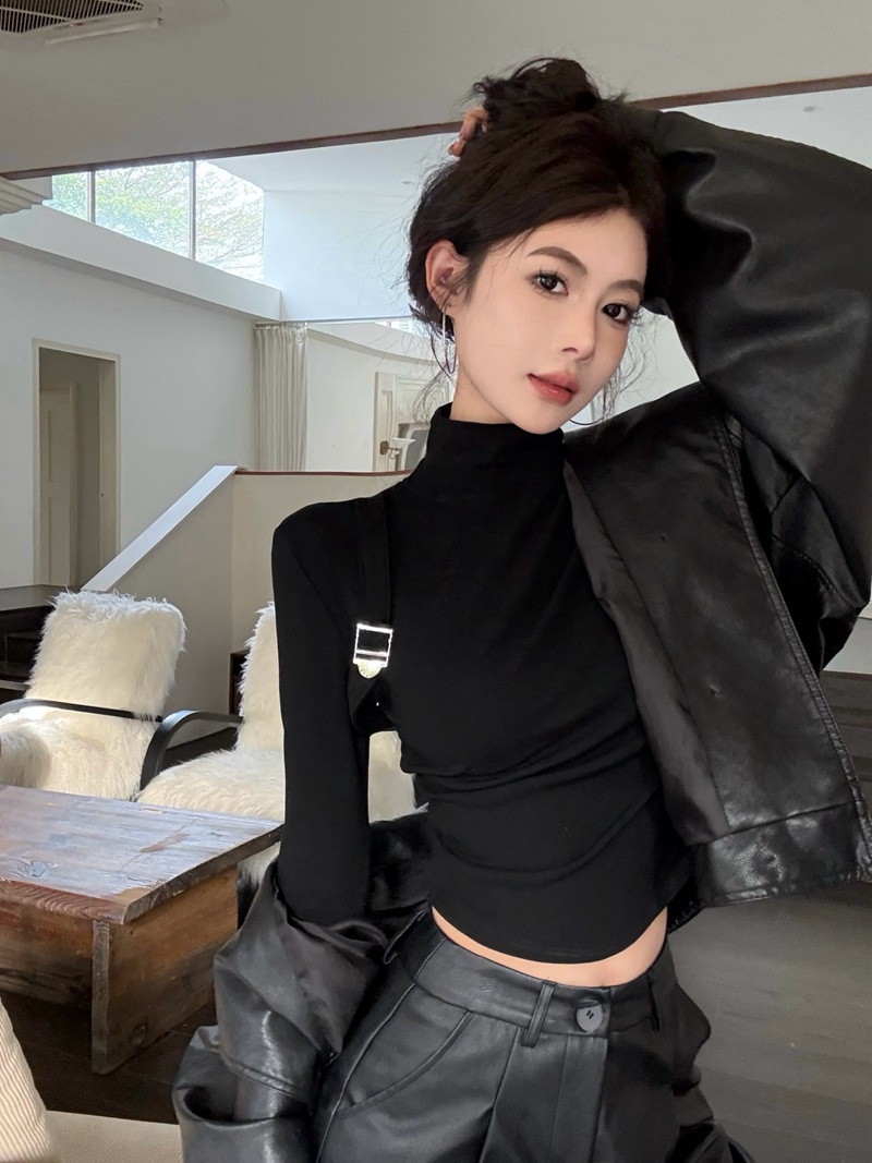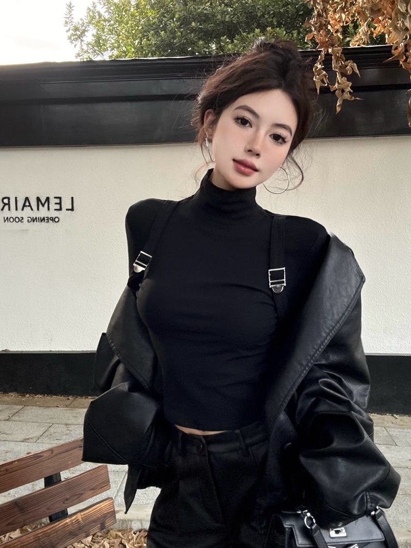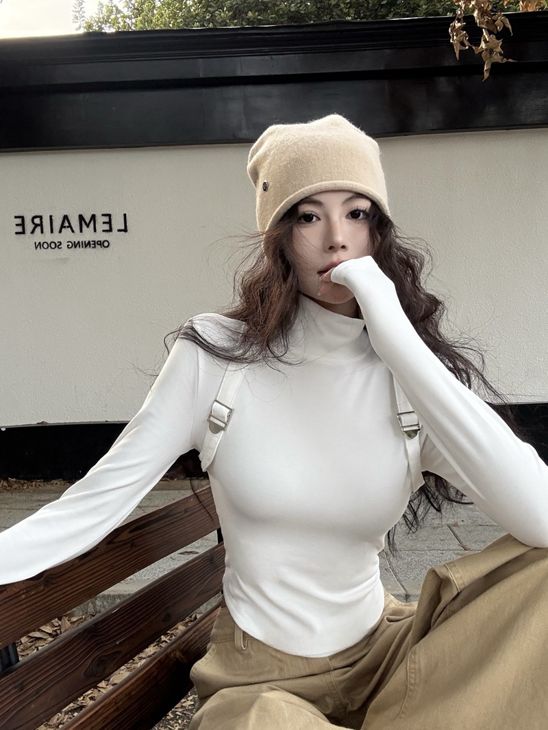 JMA-976 实拍 秋冬辣妹风设计感背带式修身显瘦高领磨毛加厚内搭打底衫