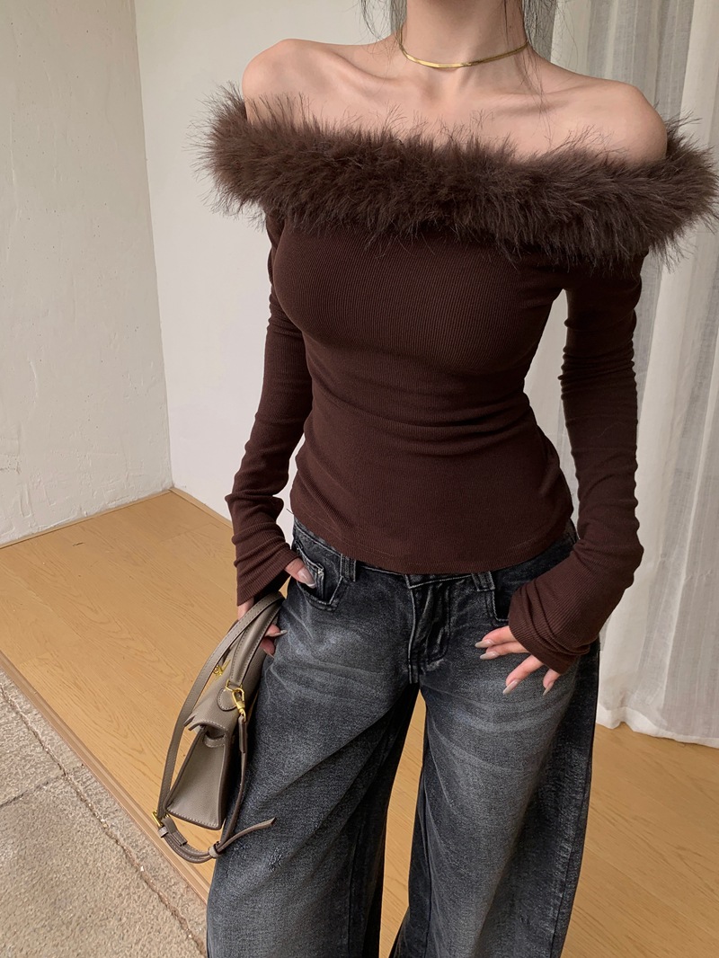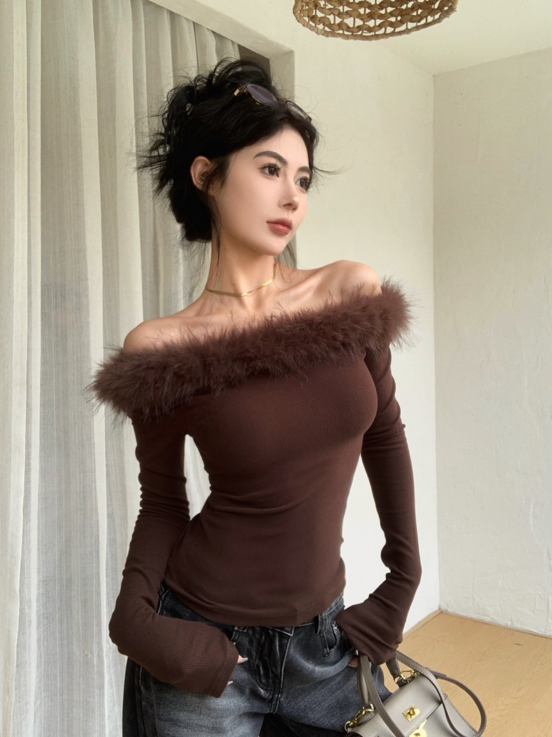 JMA-980 实拍 秋冬新款性感辣妹风毛领一字肩上衣女显瘦露肩内搭打底衫潮