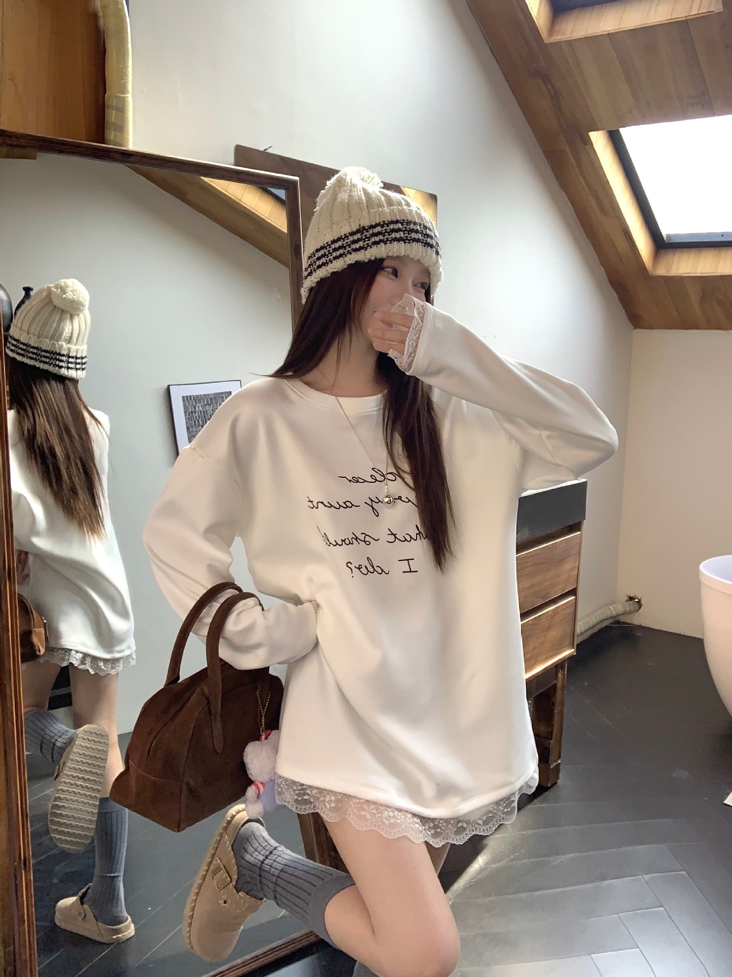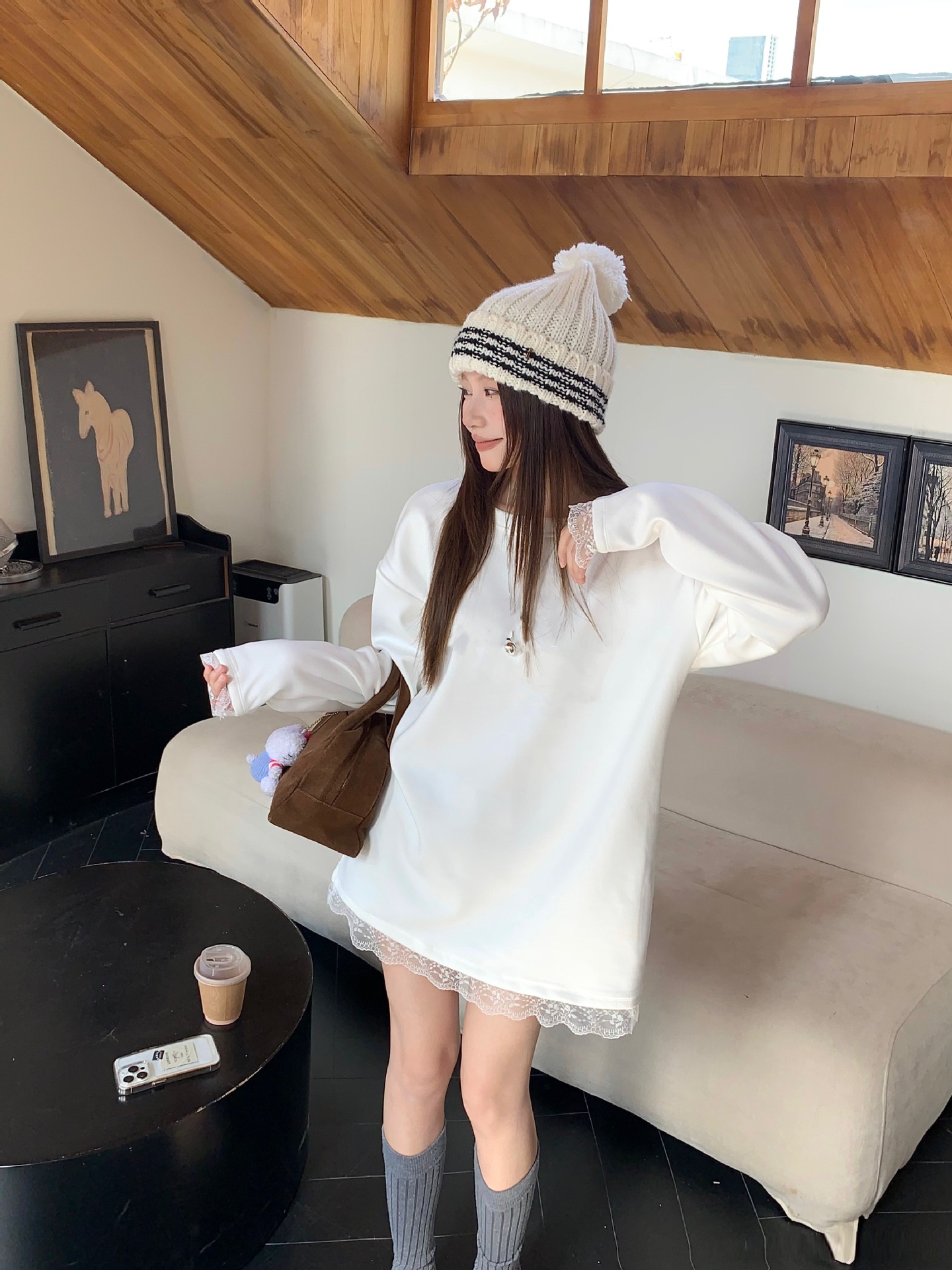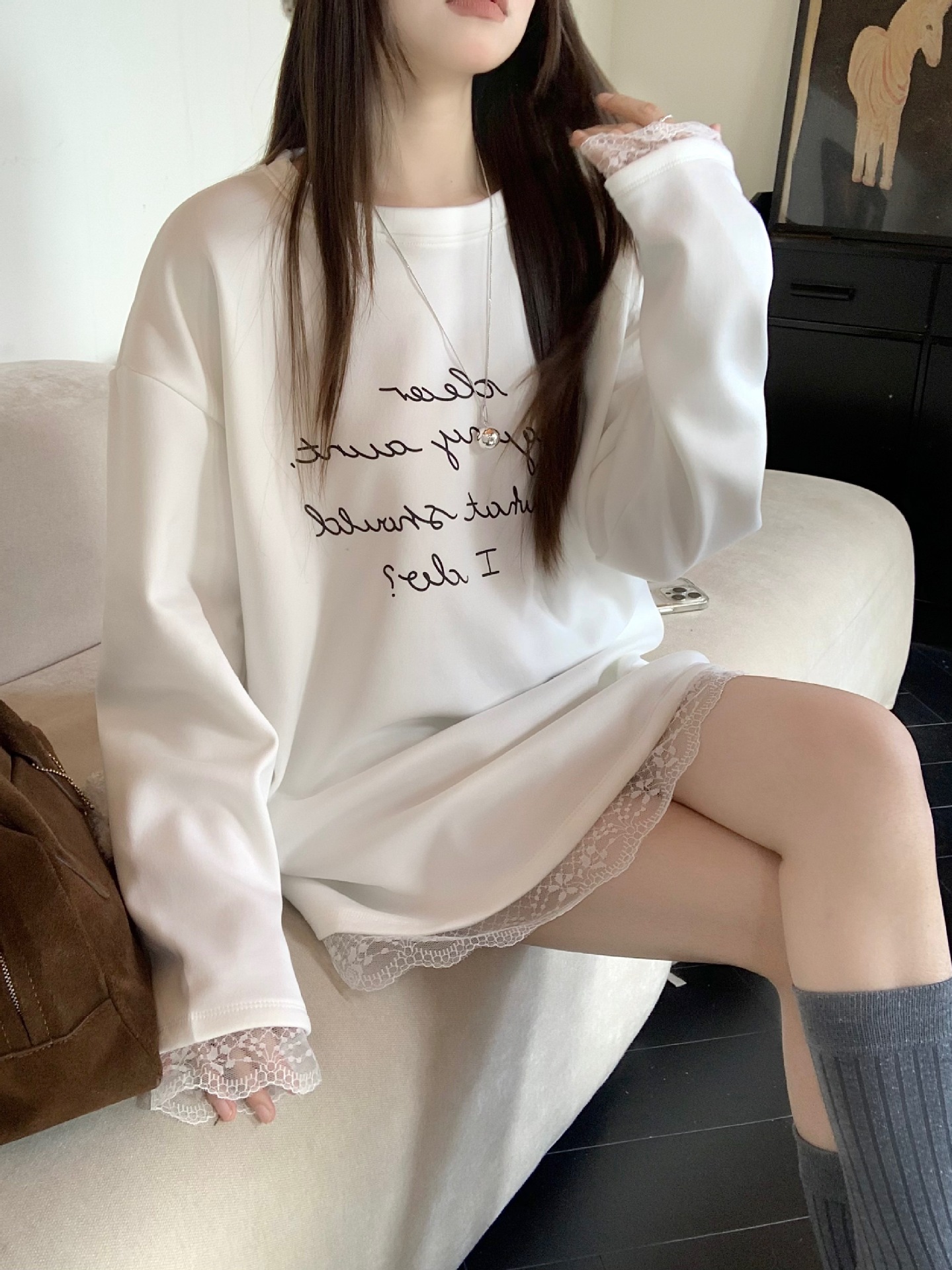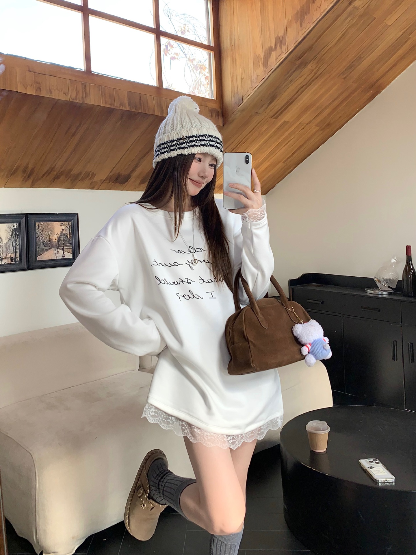 JMA-982 实拍 秋冬韩版纯色蕾丝拼接圆领中长款加绒加厚长袖磨毛T恤女上衣