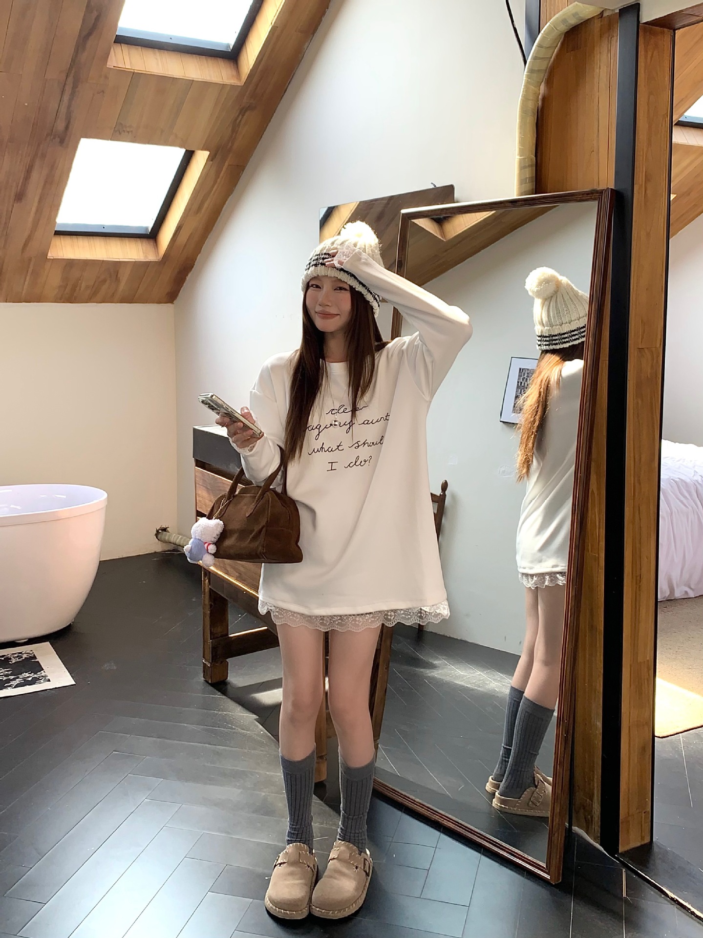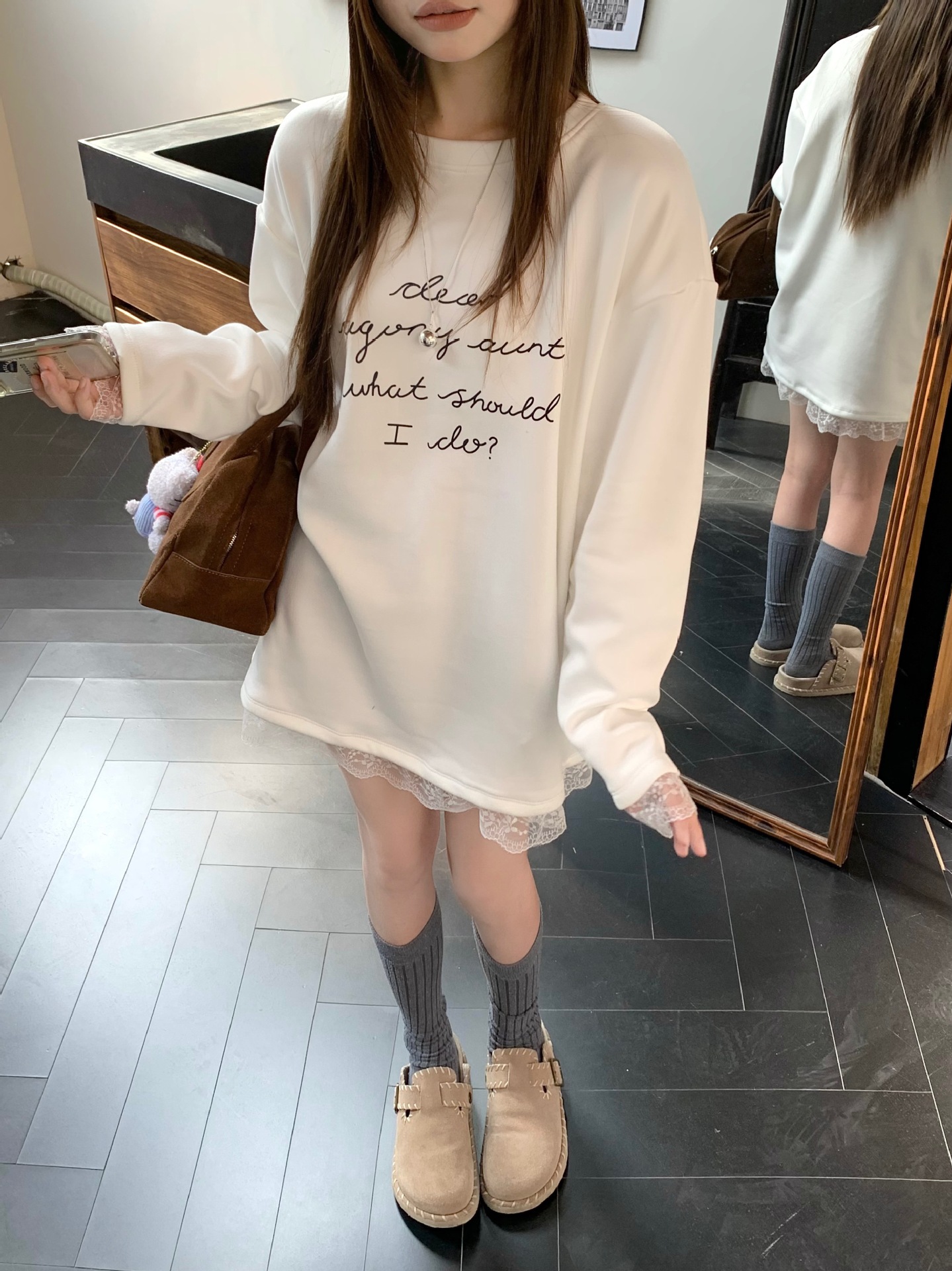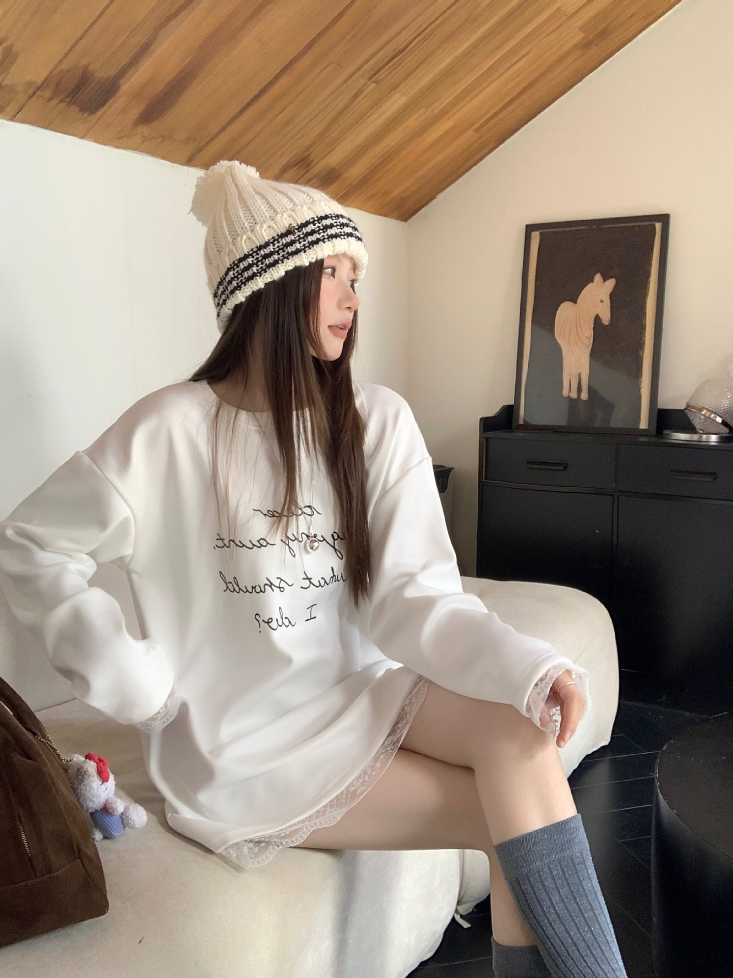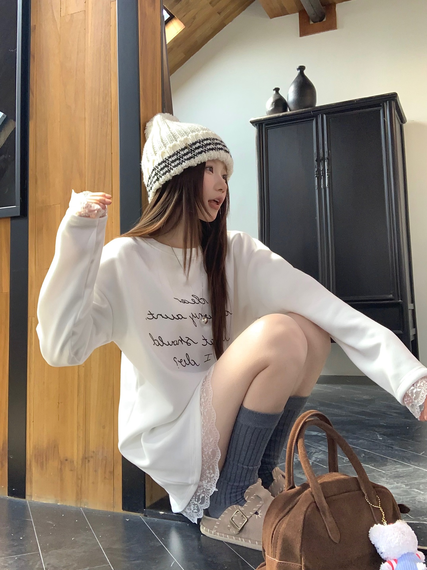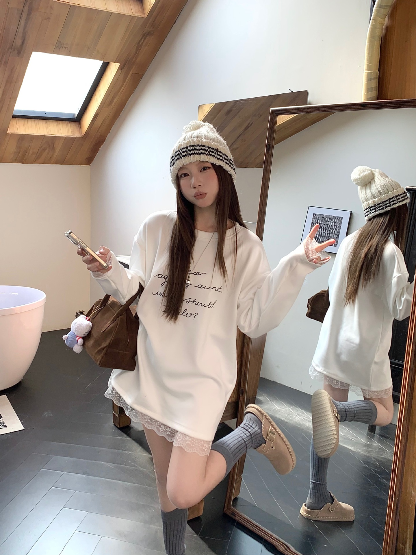 JMA-982 实拍 秋冬韩版纯色蕾丝拼接圆领中长款加绒加厚长袖磨毛T恤女上衣