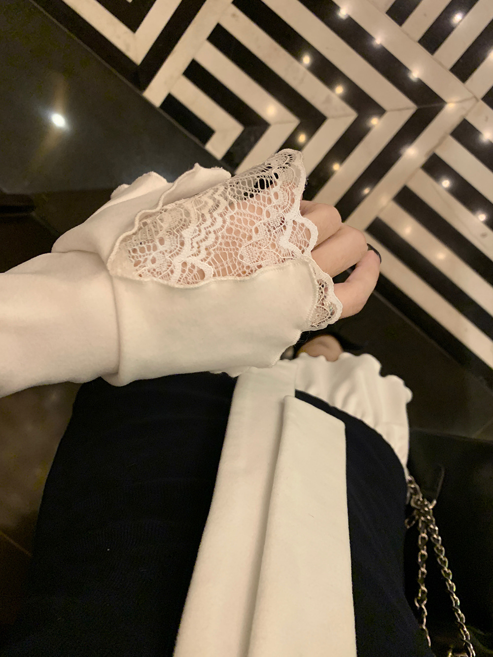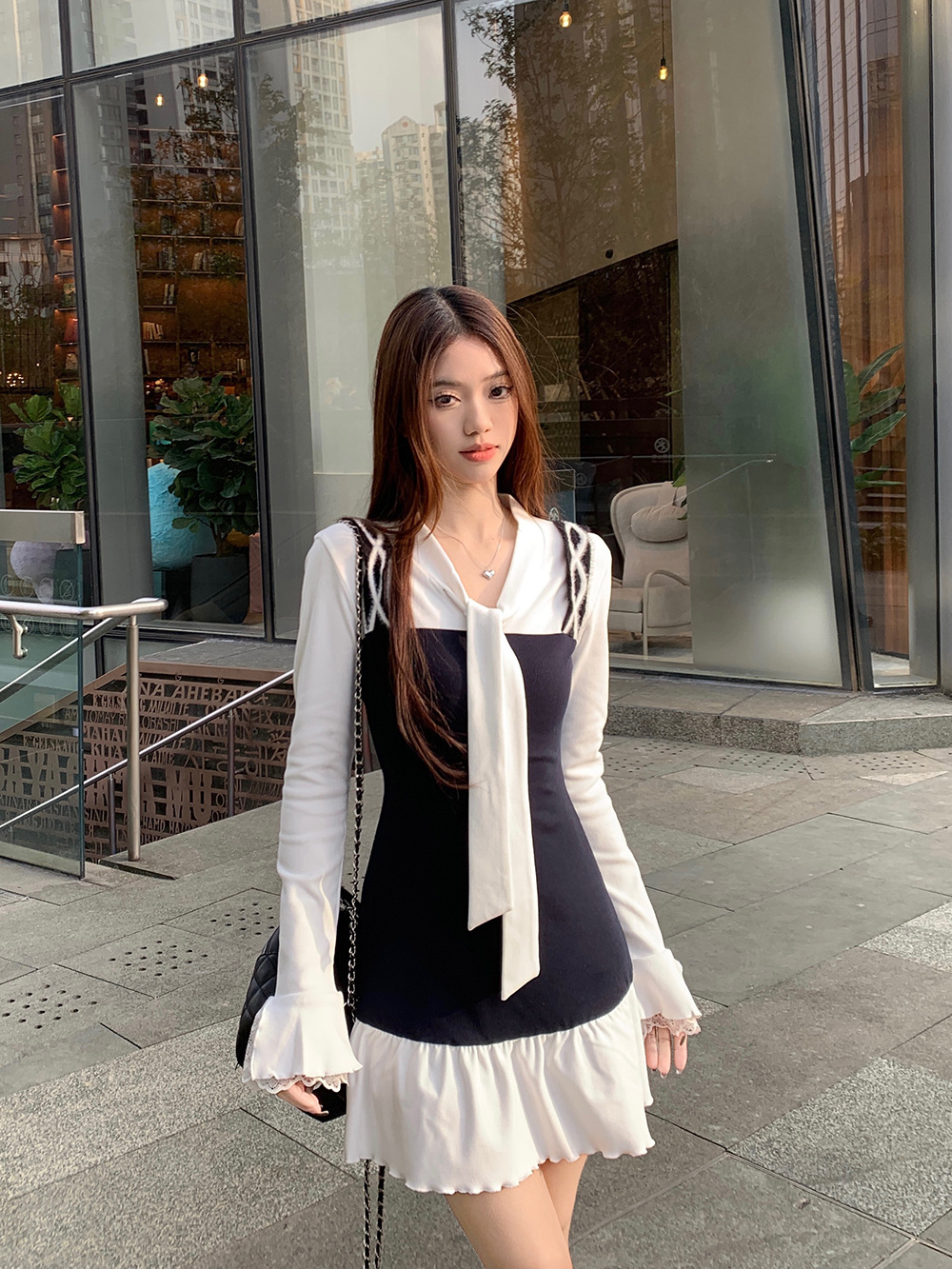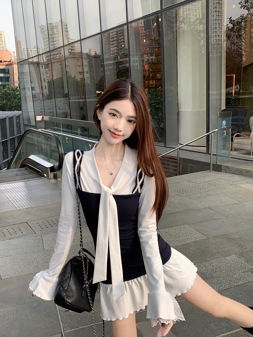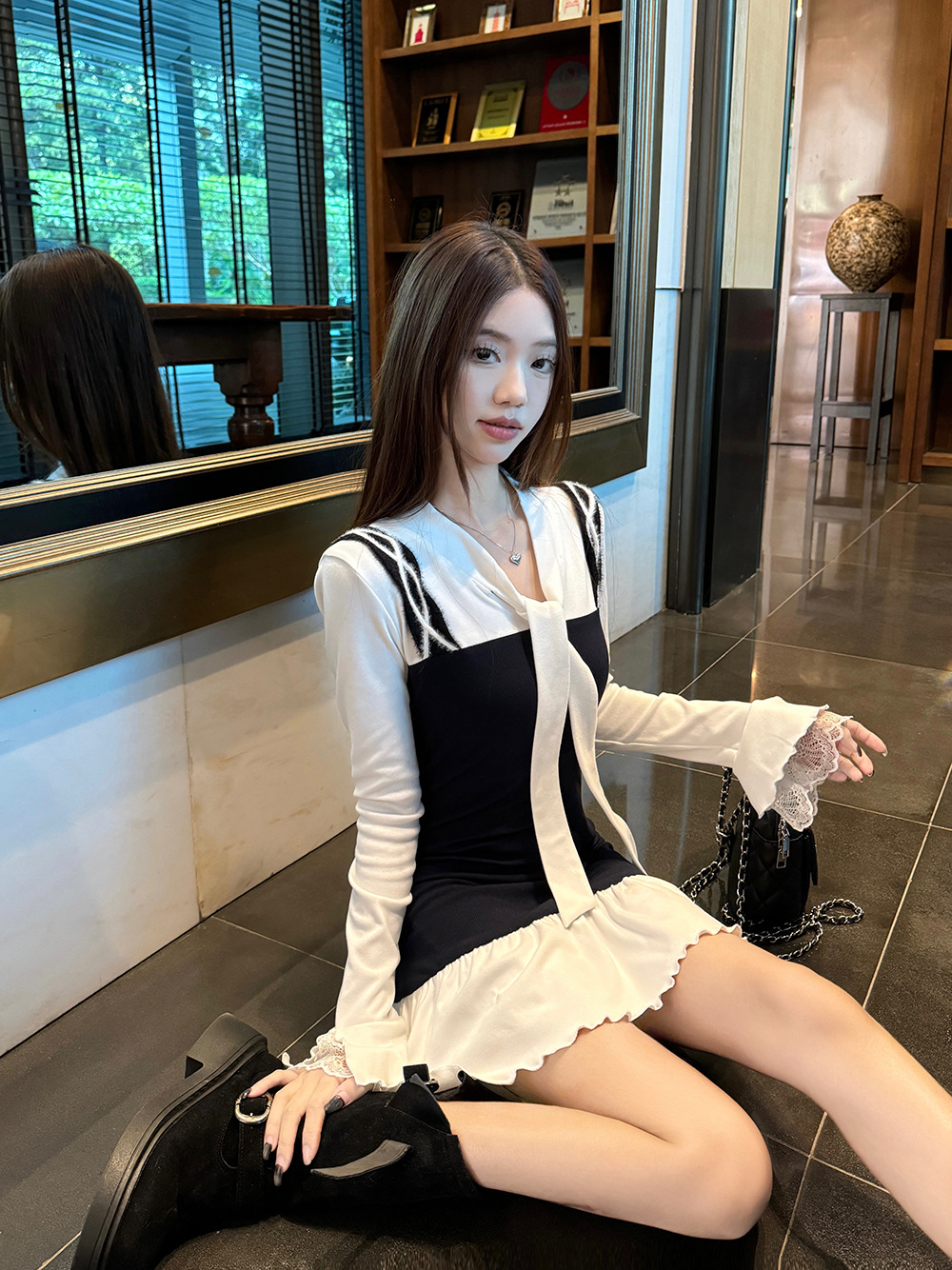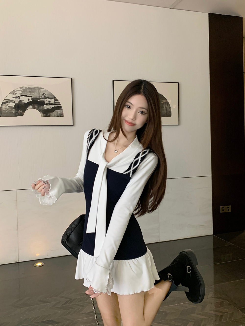 • 將圖片載入圖庫檢視器 JMA-986 实拍 秋冬韩版半纸风霜假两件拼接绑带纯欲长袖女打底设计感