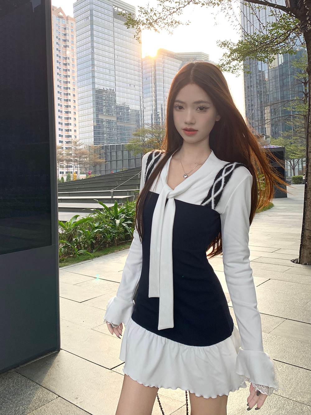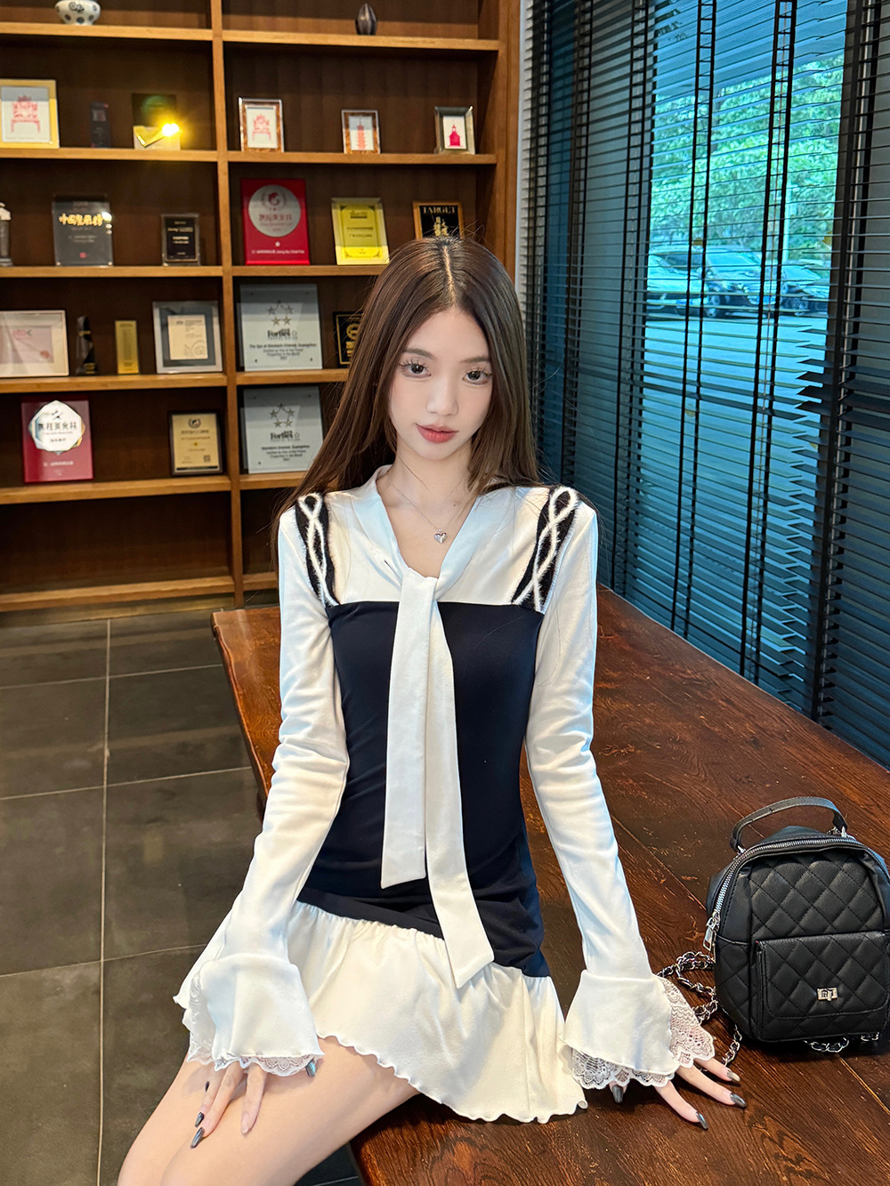 JMA-986 实拍 秋冬韩版半纸风霜假两件拼接绑带纯欲长袖女打底设计感