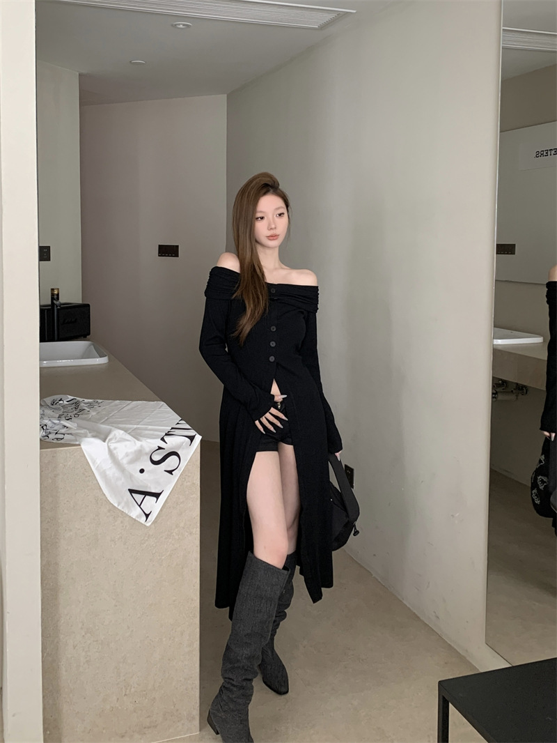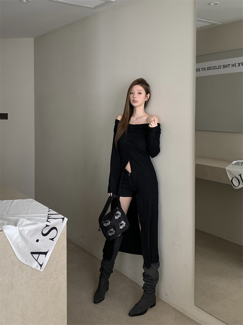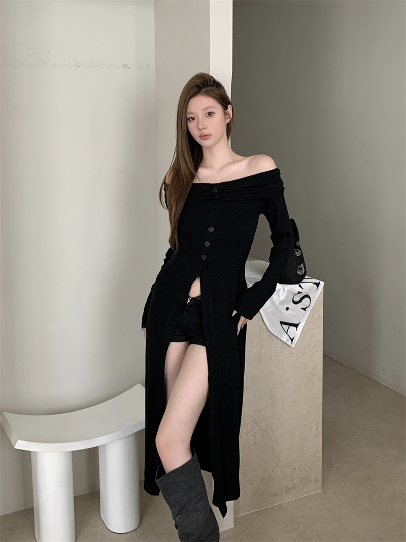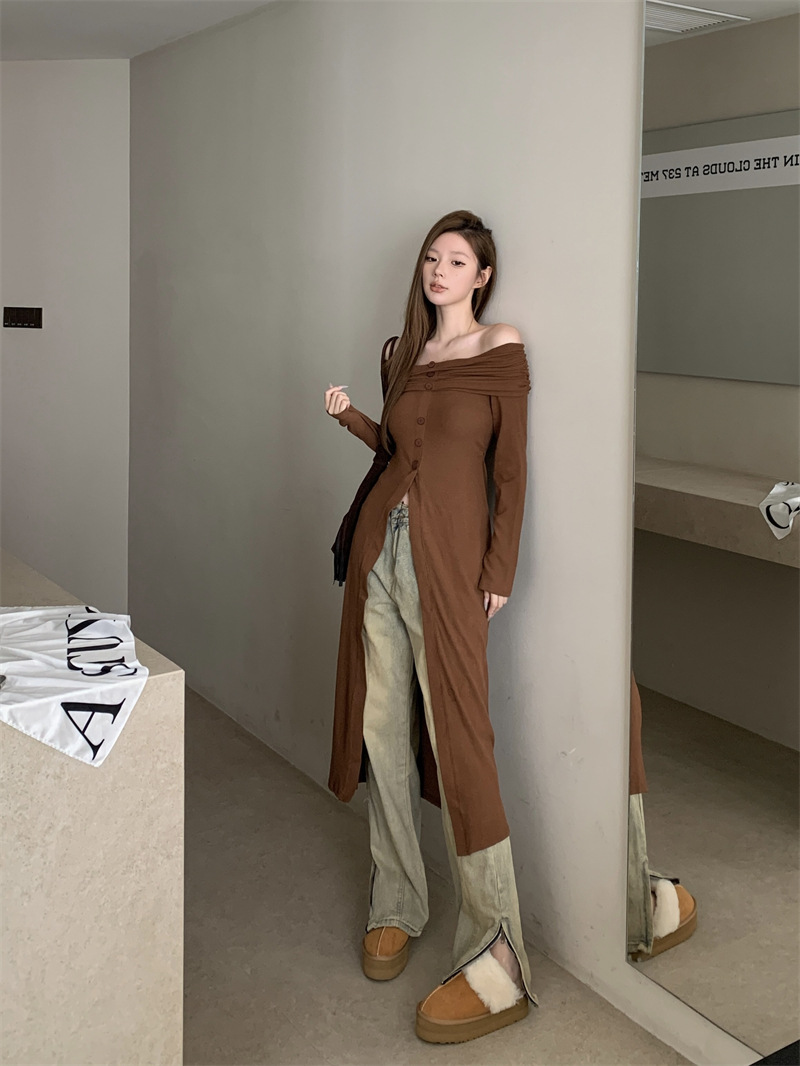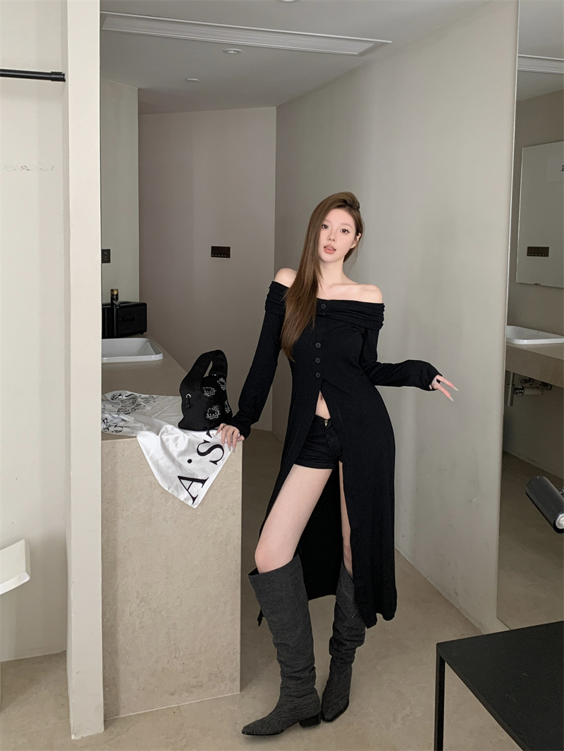 JMA-989 实拍 春季美拉德ins风一字领开叉长款长袖上衣气质设计感辣妹上衣