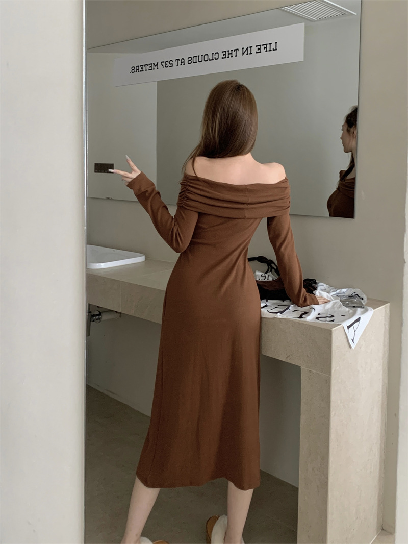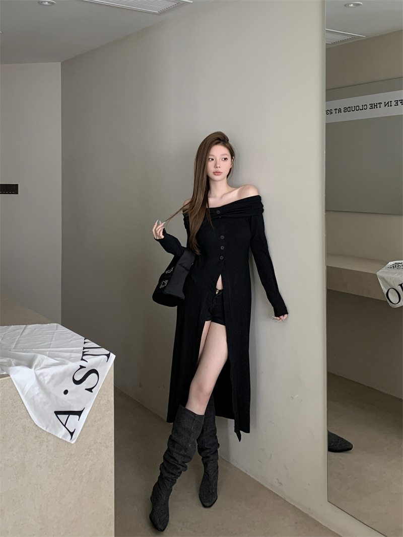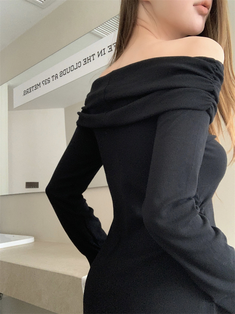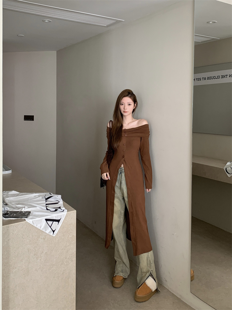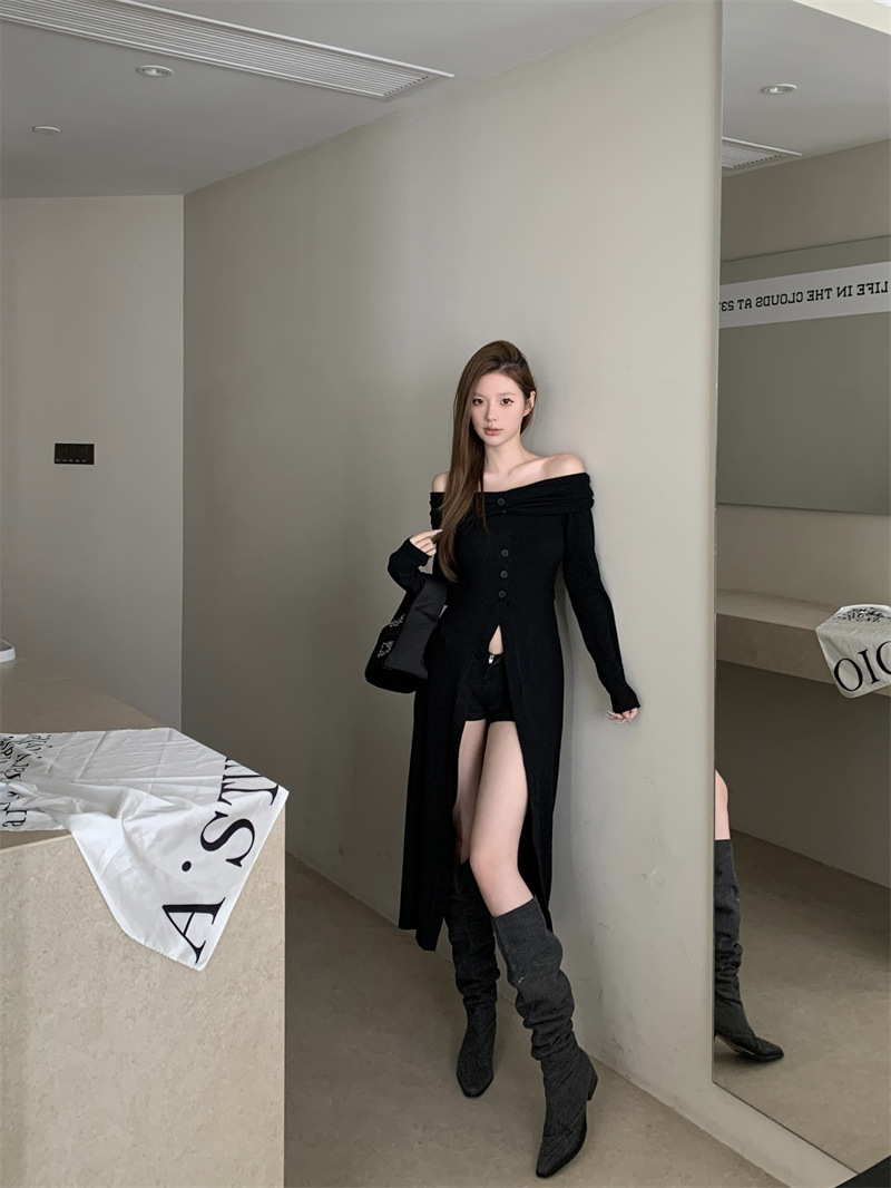 JMA-989 实拍 春季美拉德ins风一字领开叉长款长袖上衣气质设计感辣妹上衣