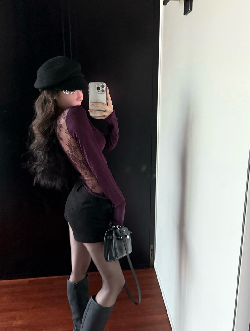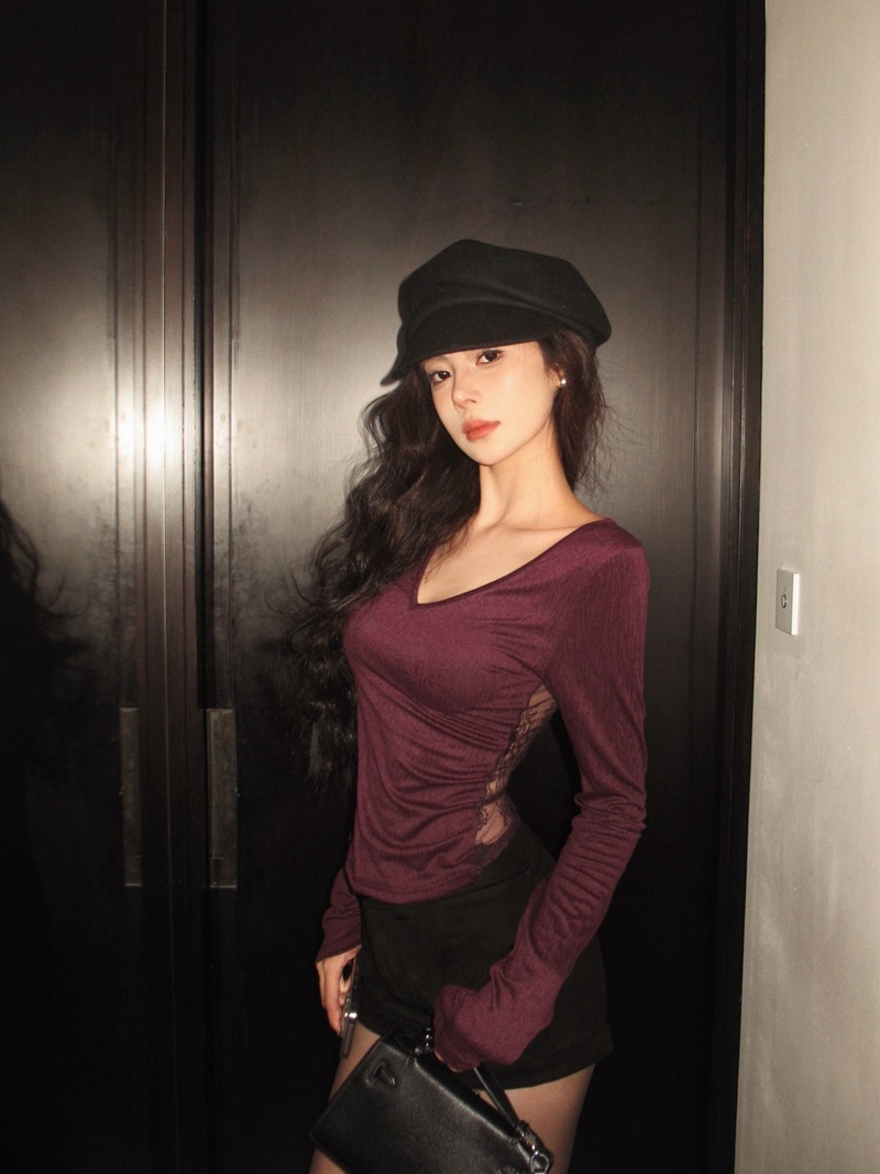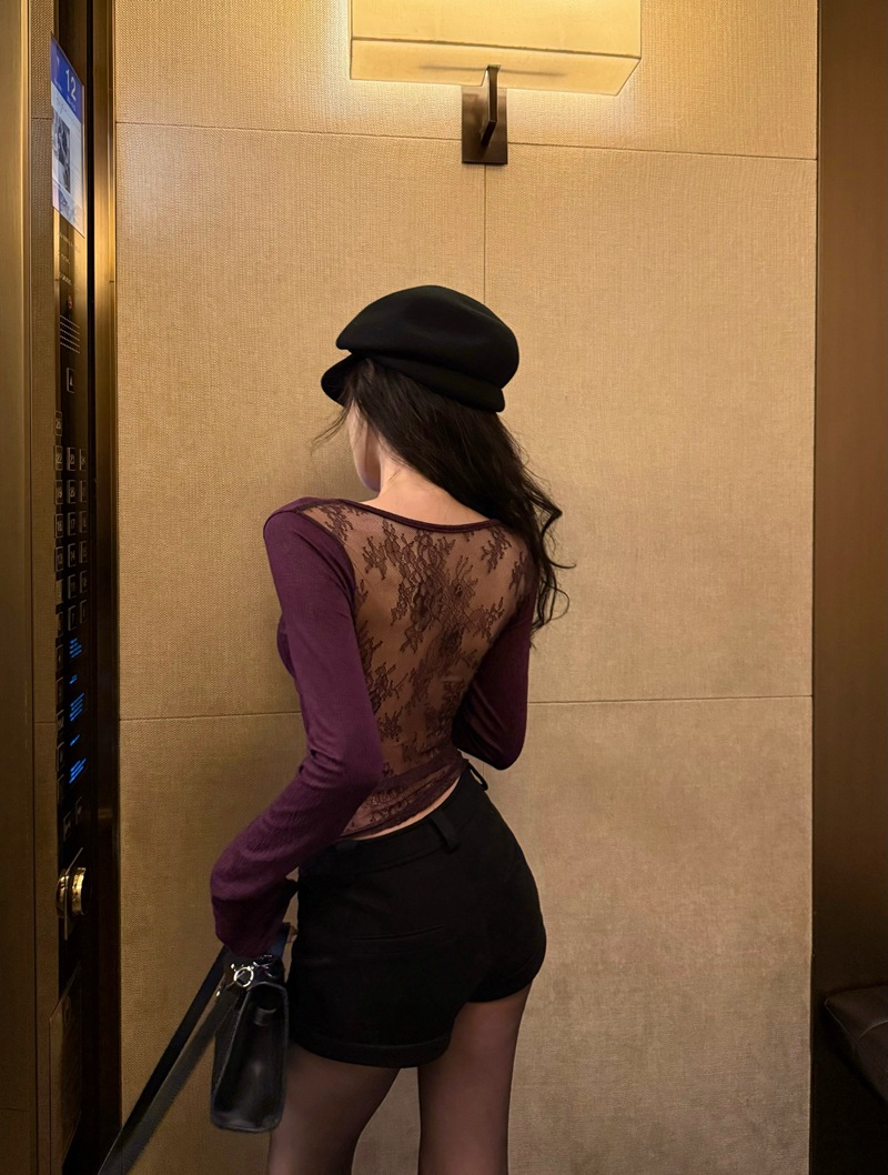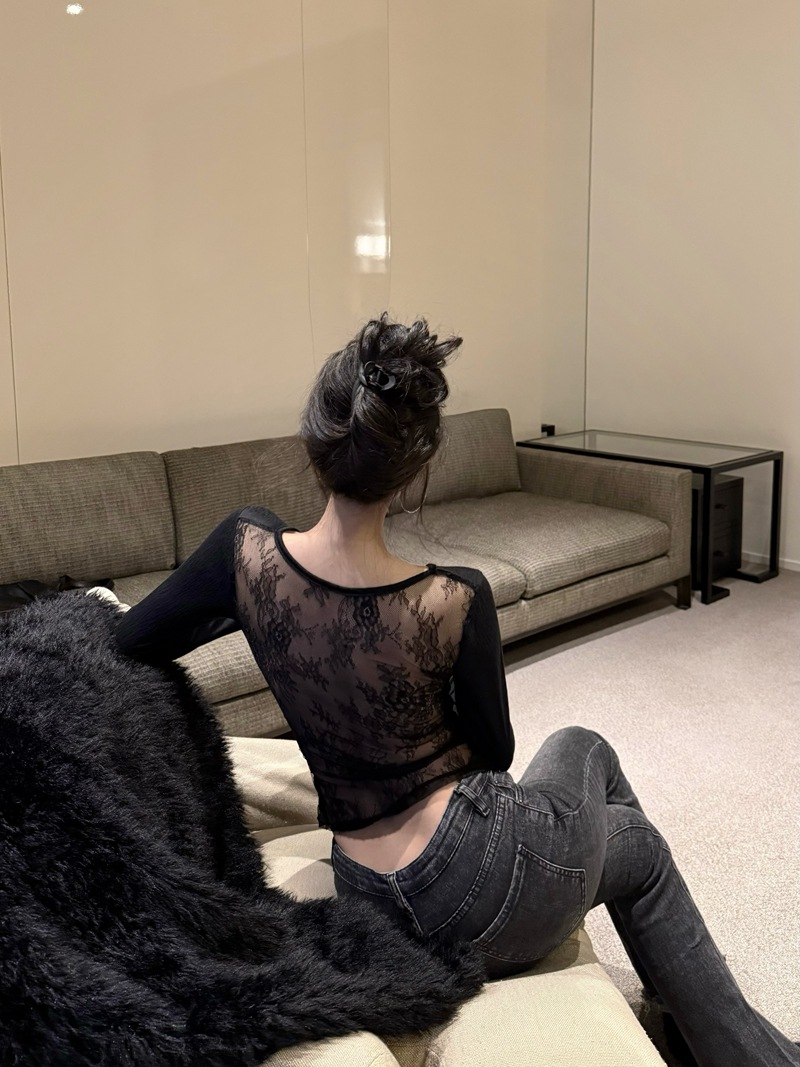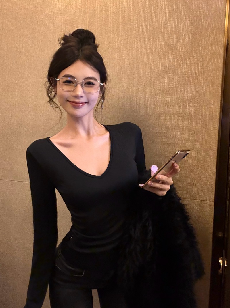 JMA-982 实拍 秋冬性感辣妹风后背蕾丝拼接V领长袖T恤女内搭显瘦打底衫潮