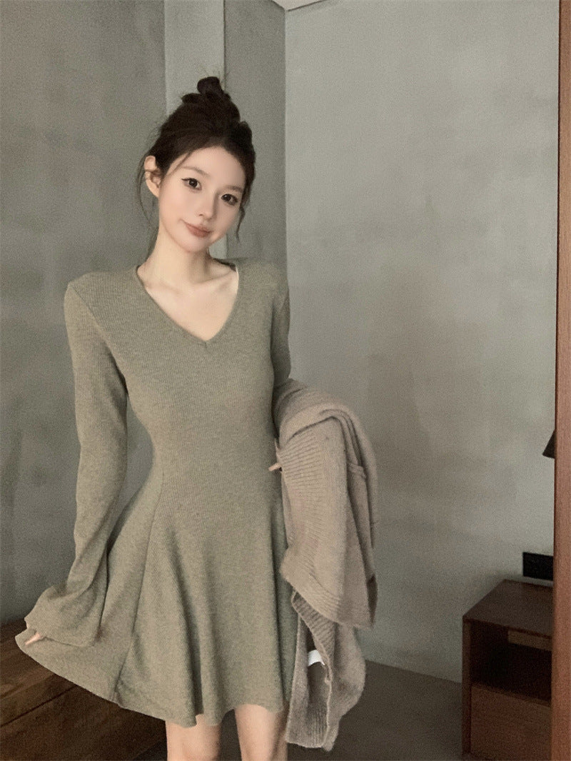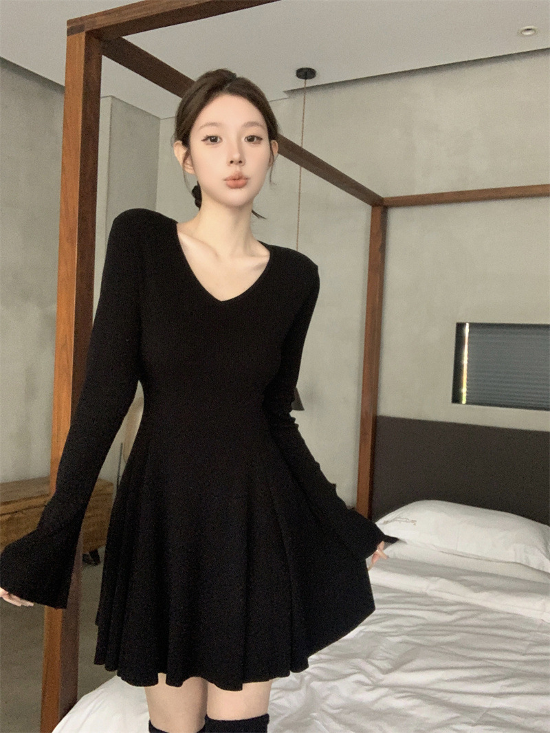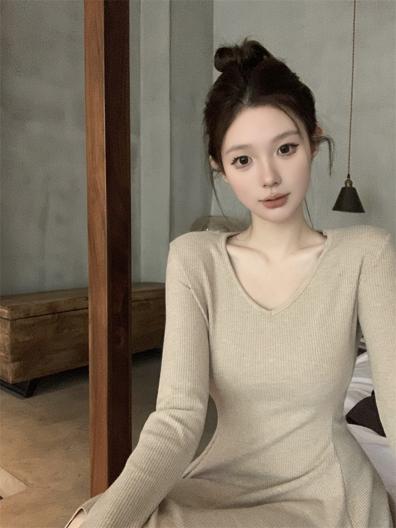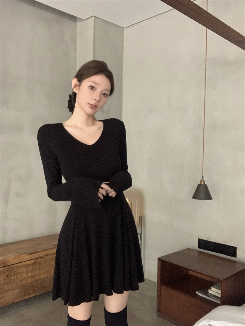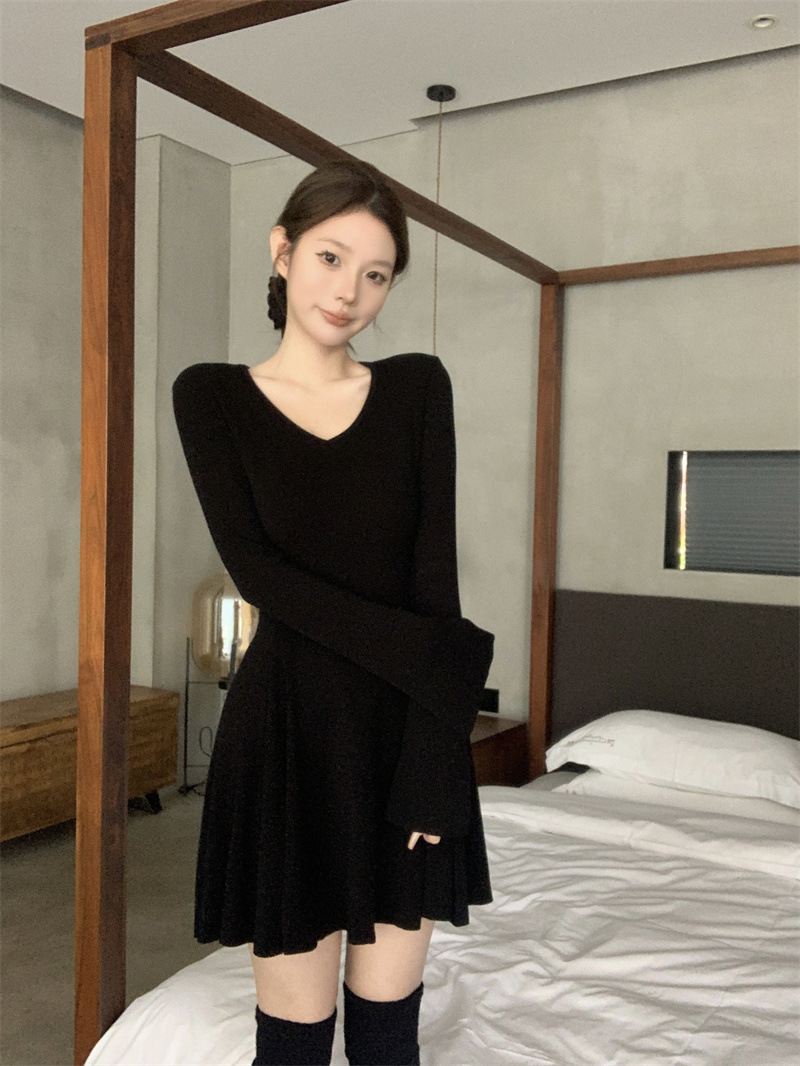 JMA-986 实拍 秋冬纯欲辣妹气质收腰v领性感收腰打底长袖连衣裙短裙子