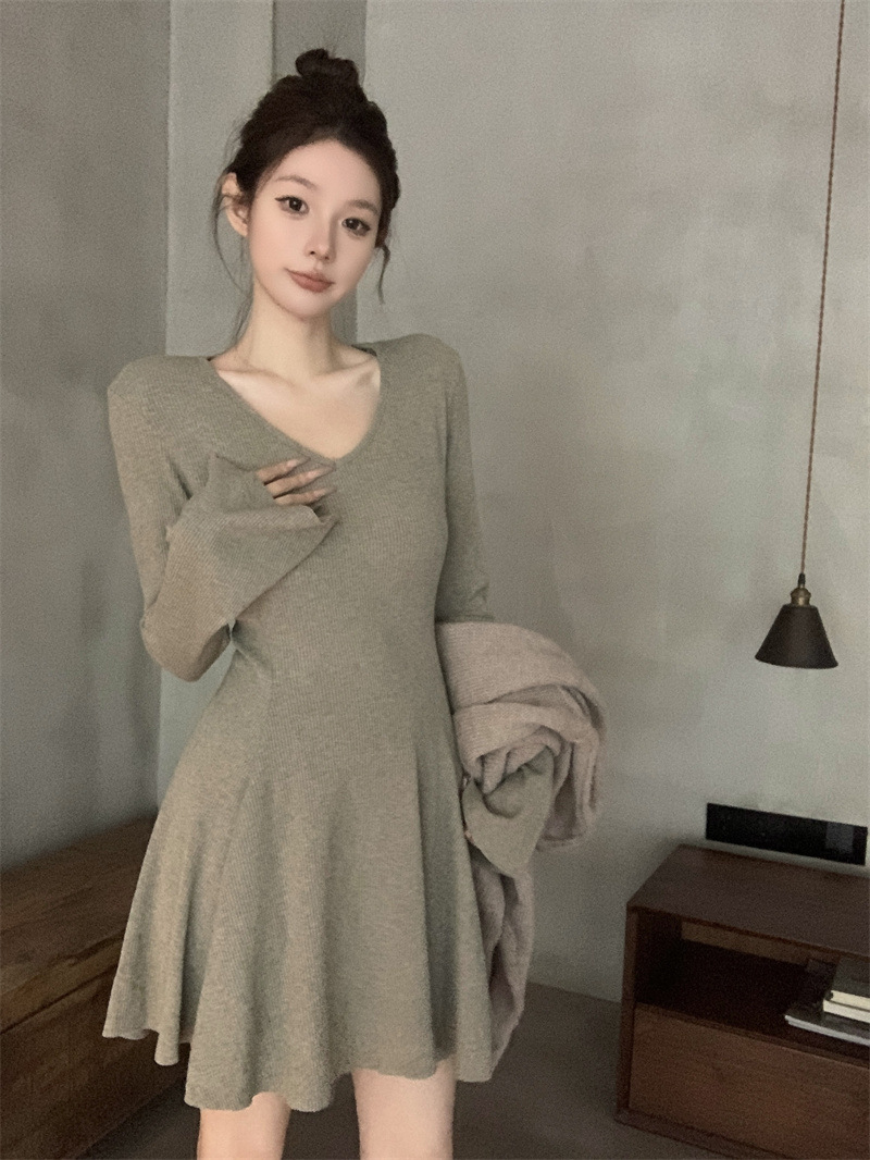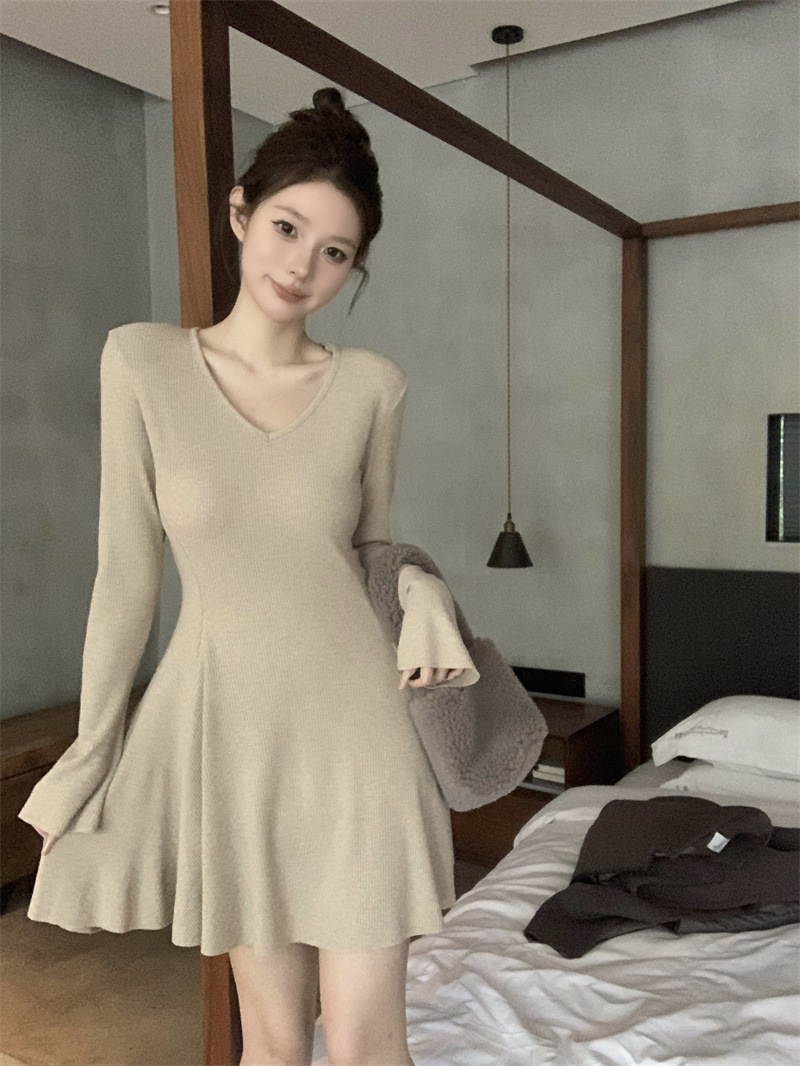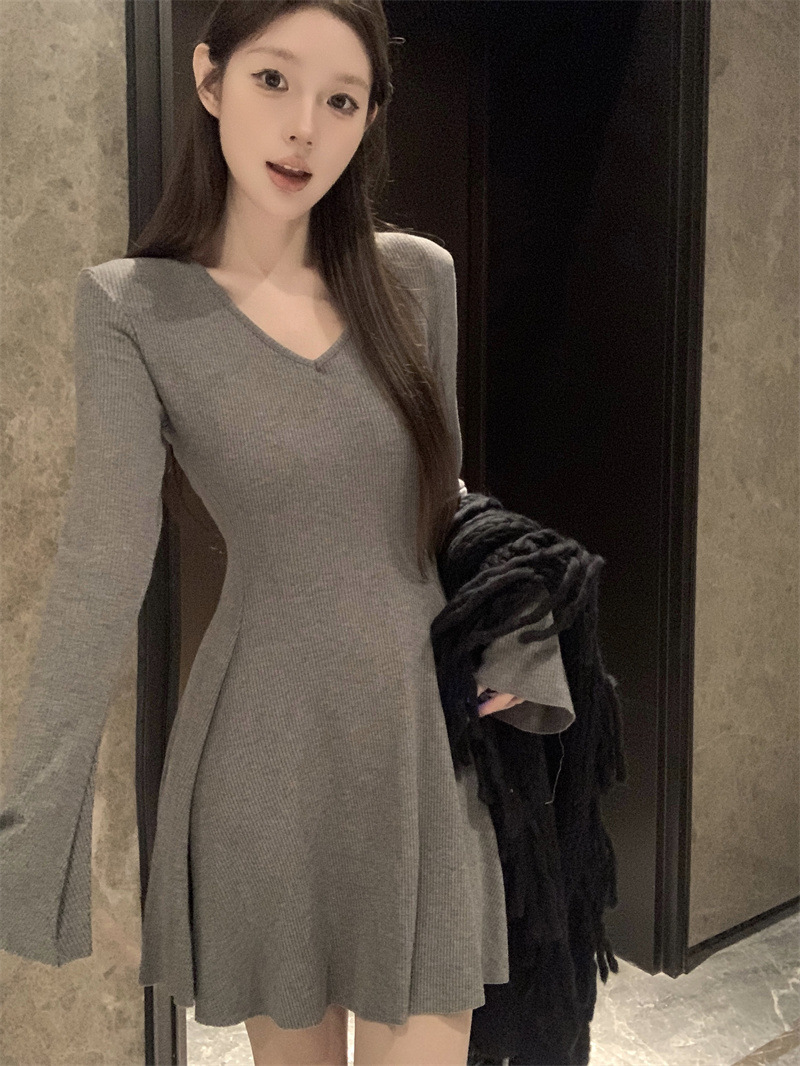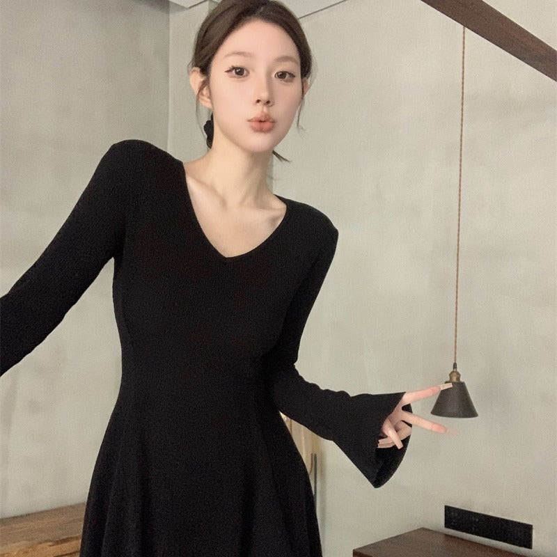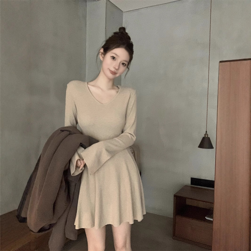 JMA-986 实拍 秋冬纯欲辣妹气质收腰v领性感收腰打底长袖连衣裙短裙子