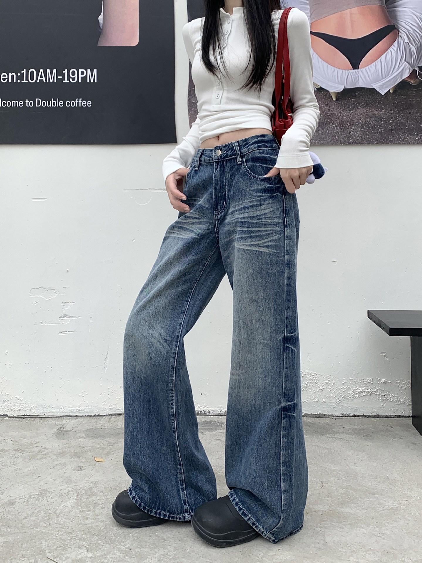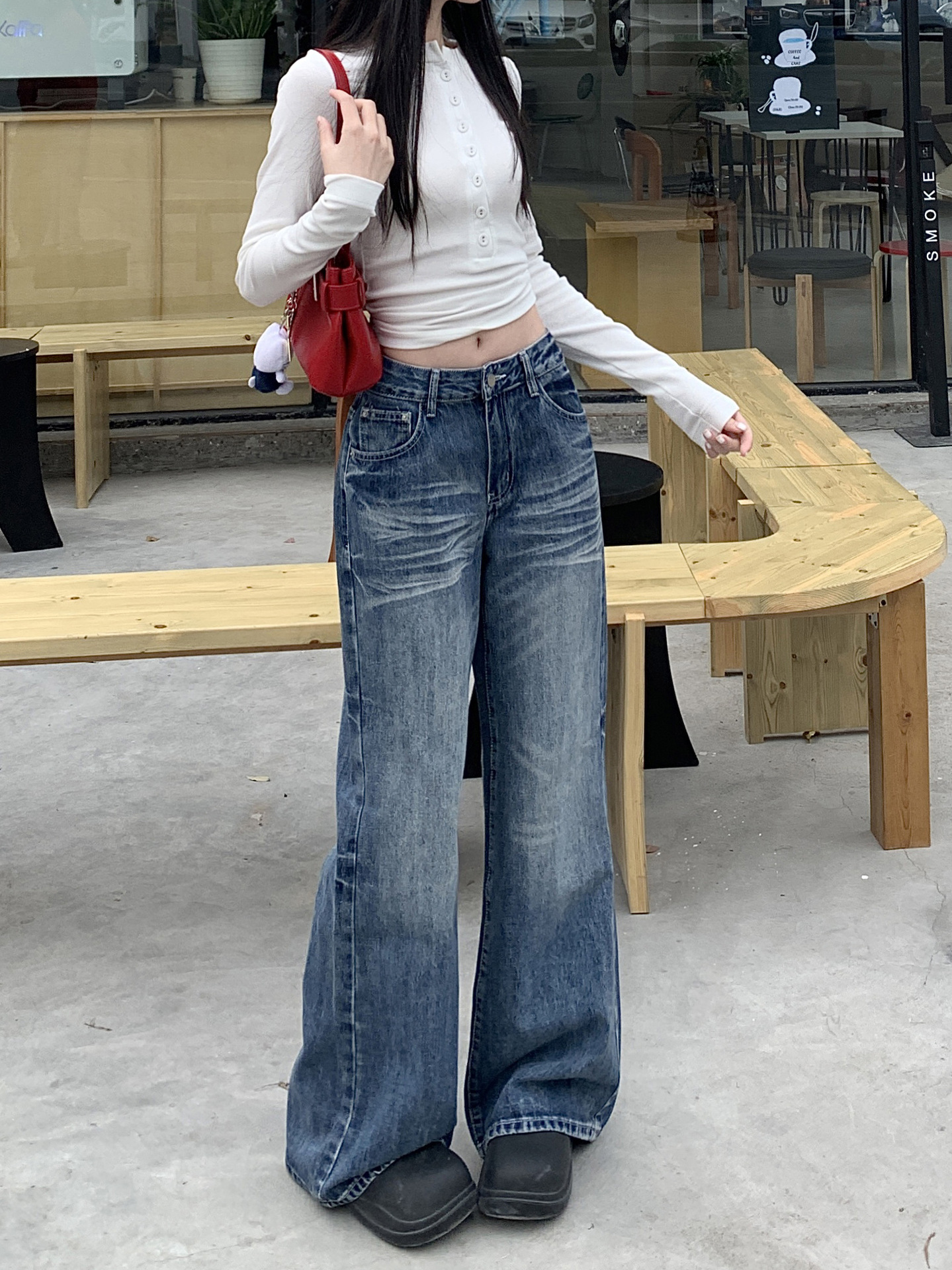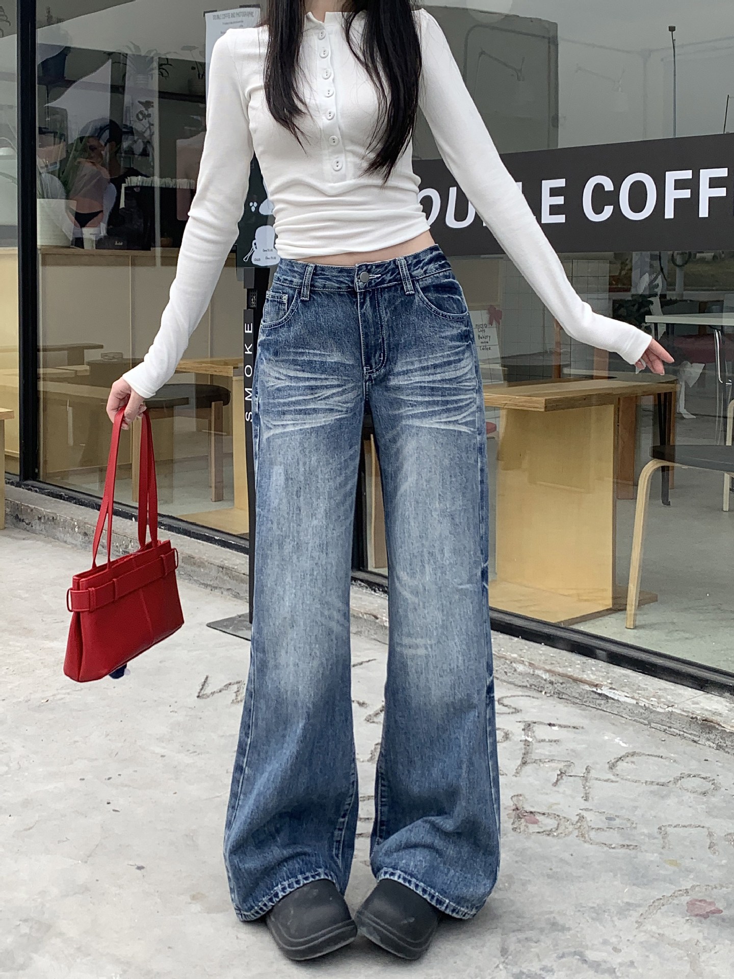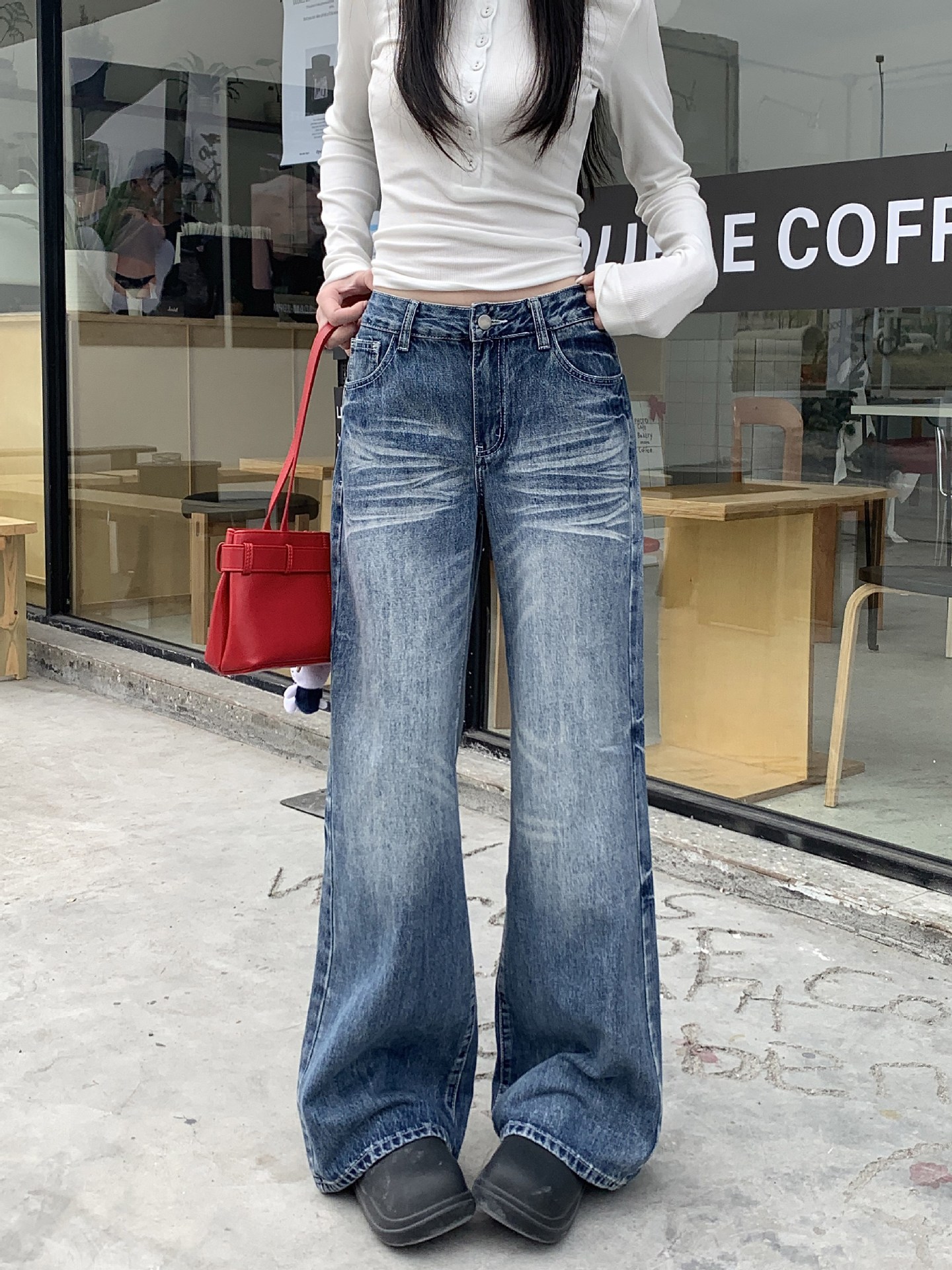 JMA-1008 复古中腰设计感微喇叭牛仔裤女春季新款宽松阔腿显瘦直筒拖地裤子