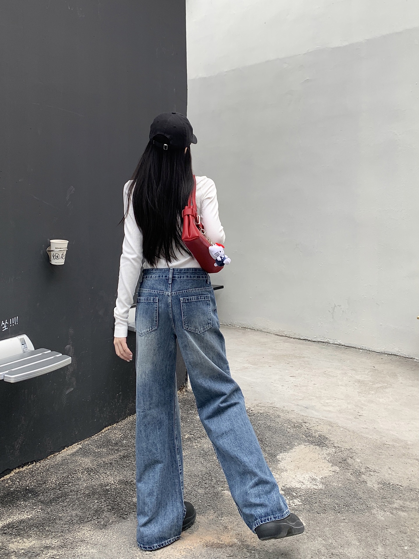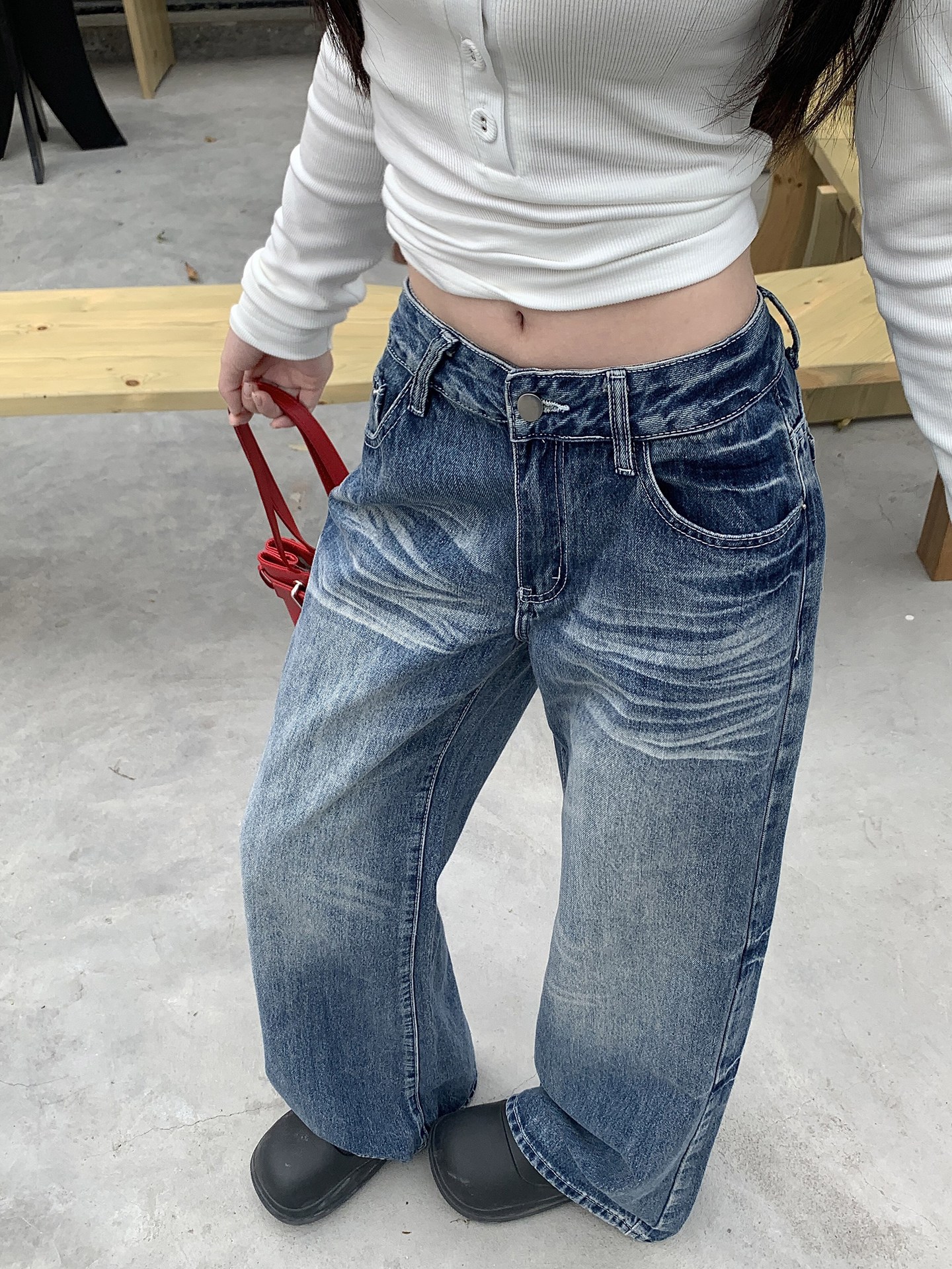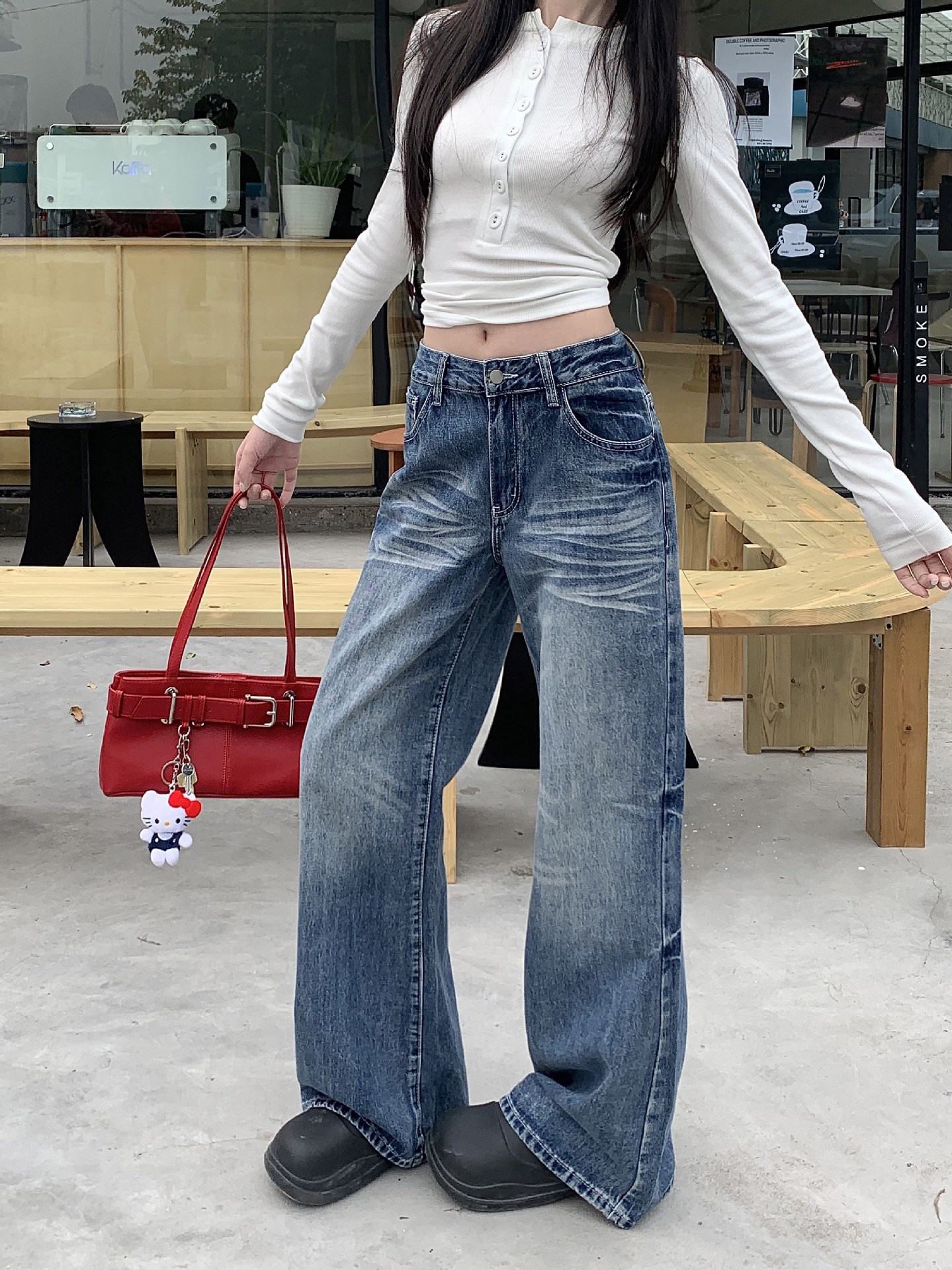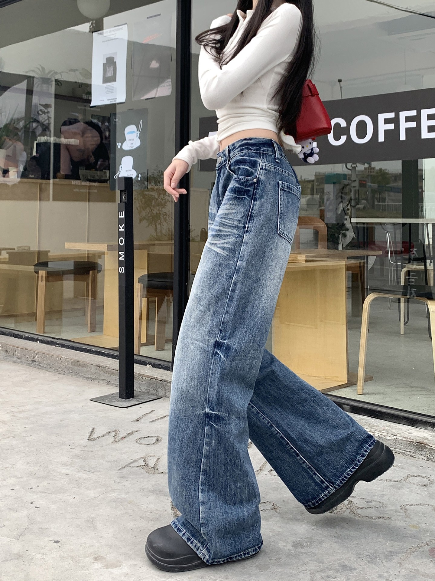 JMA-1008 复古中腰设计感微喇叭牛仔裤女春季新款宽松阔腿显瘦直筒拖地裤子