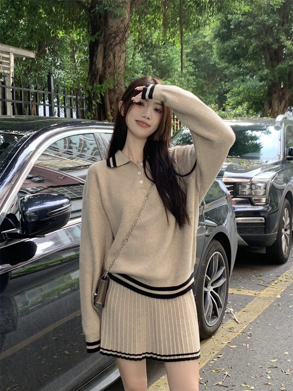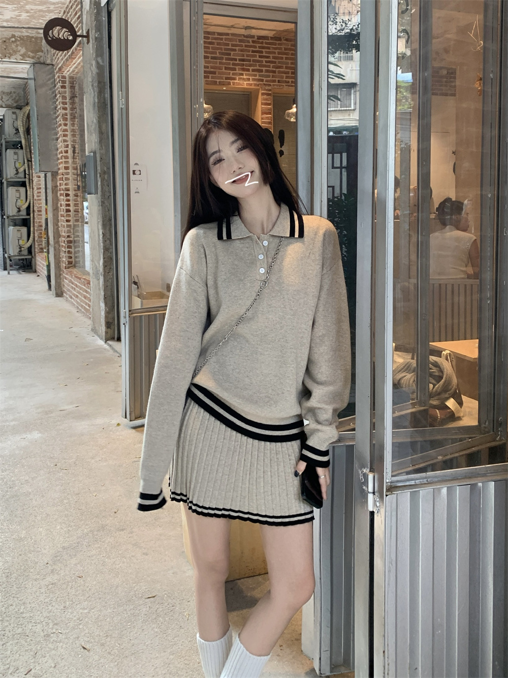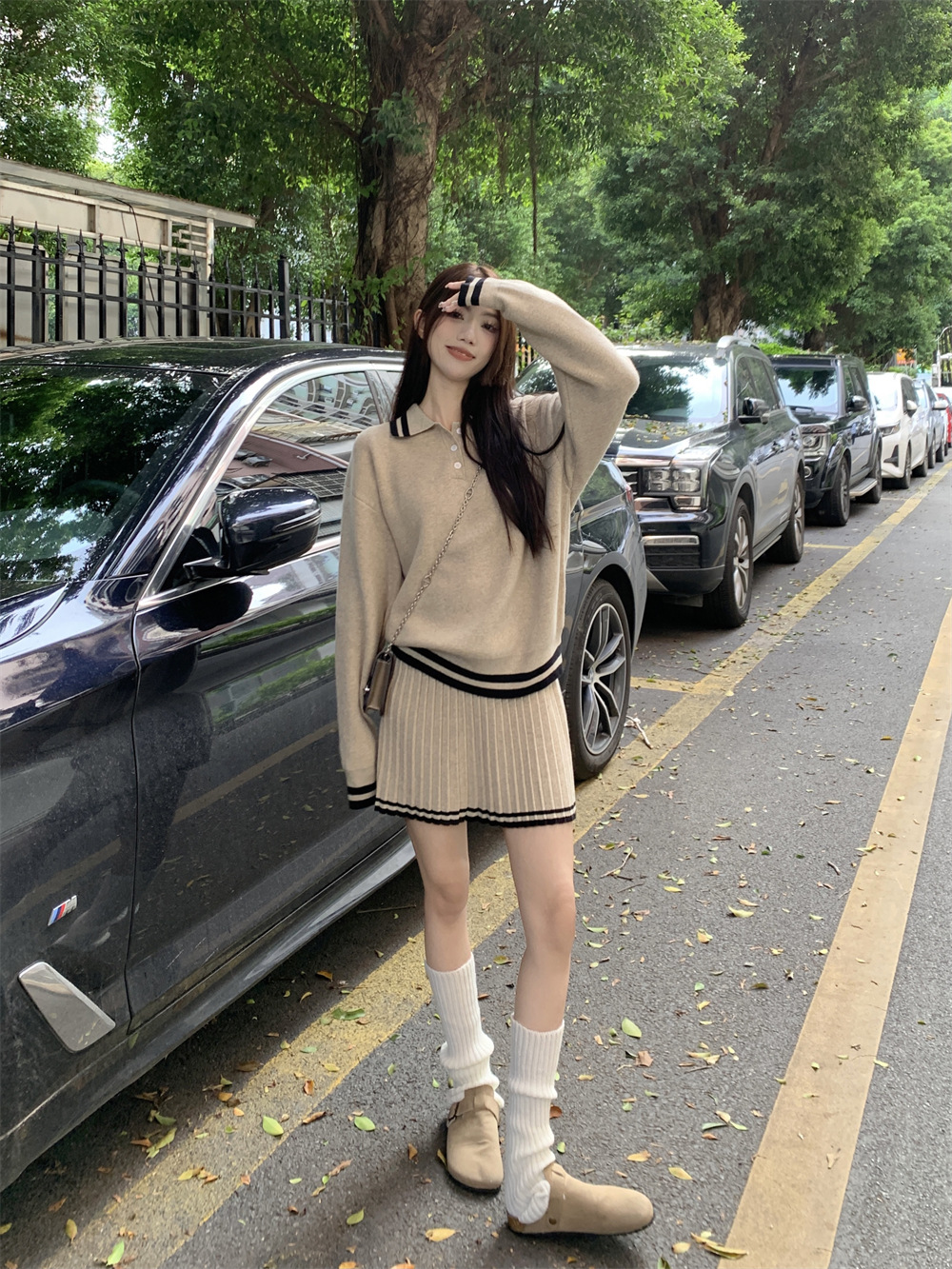 JMA-1011 美拉德穿搭秋季韩版POLO领宽松显瘦针织毛衣+高腰显瘦百褶半身裙