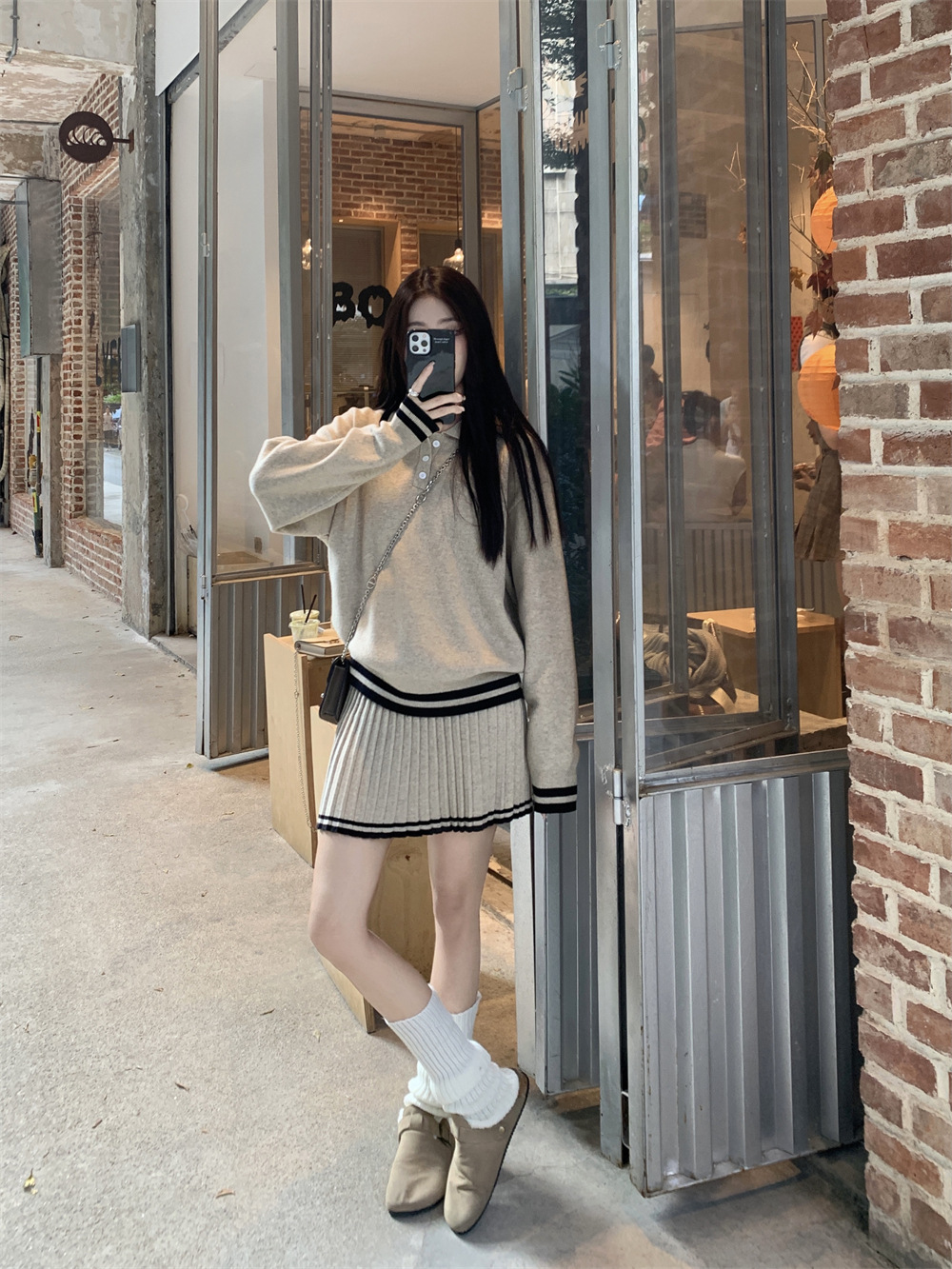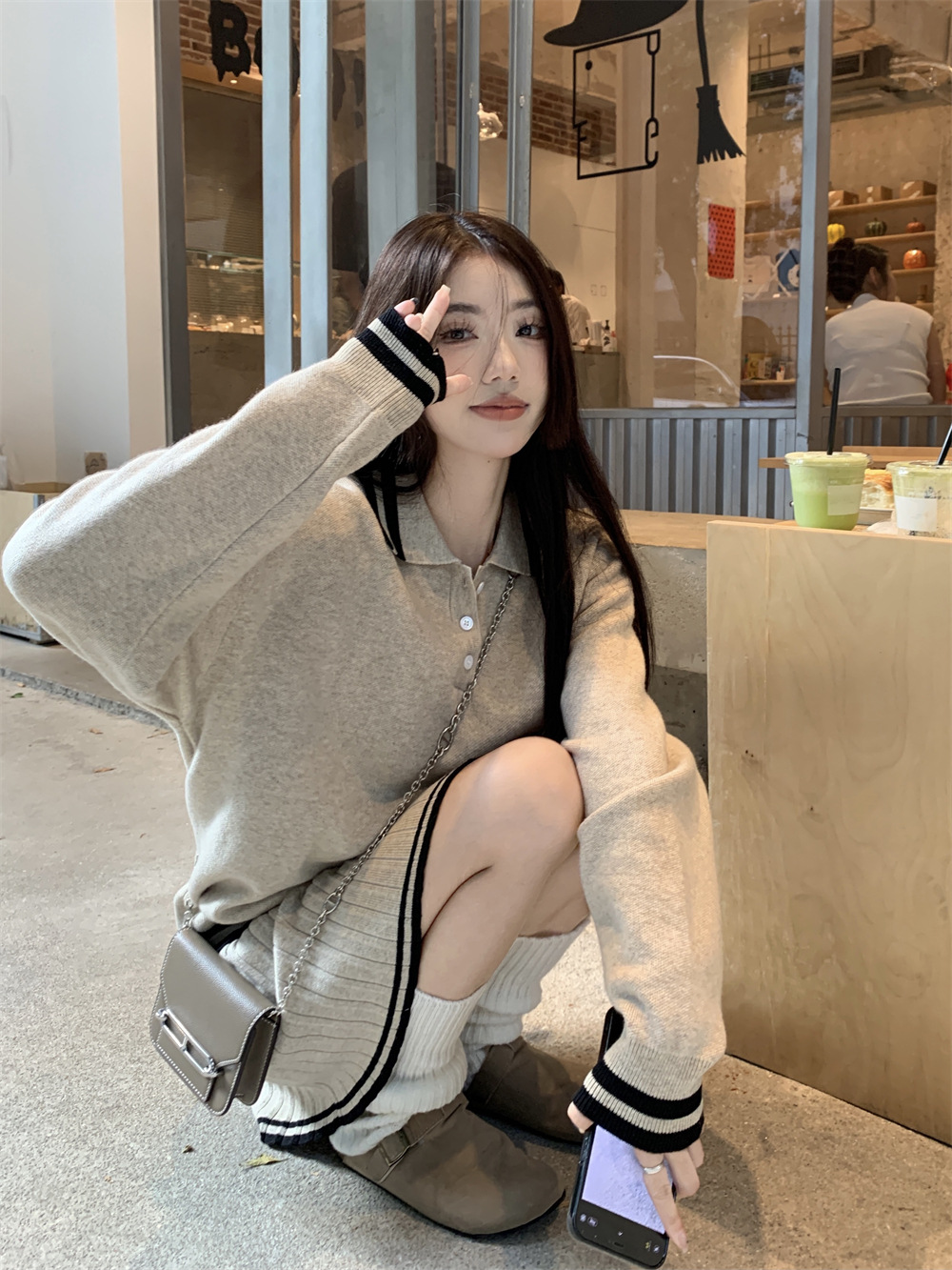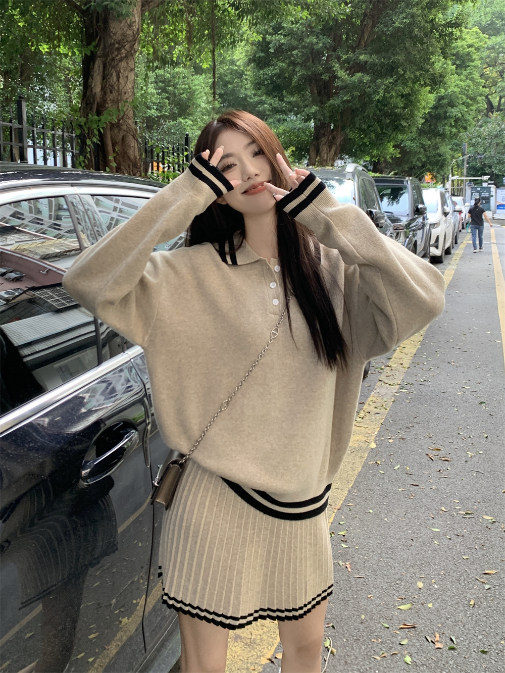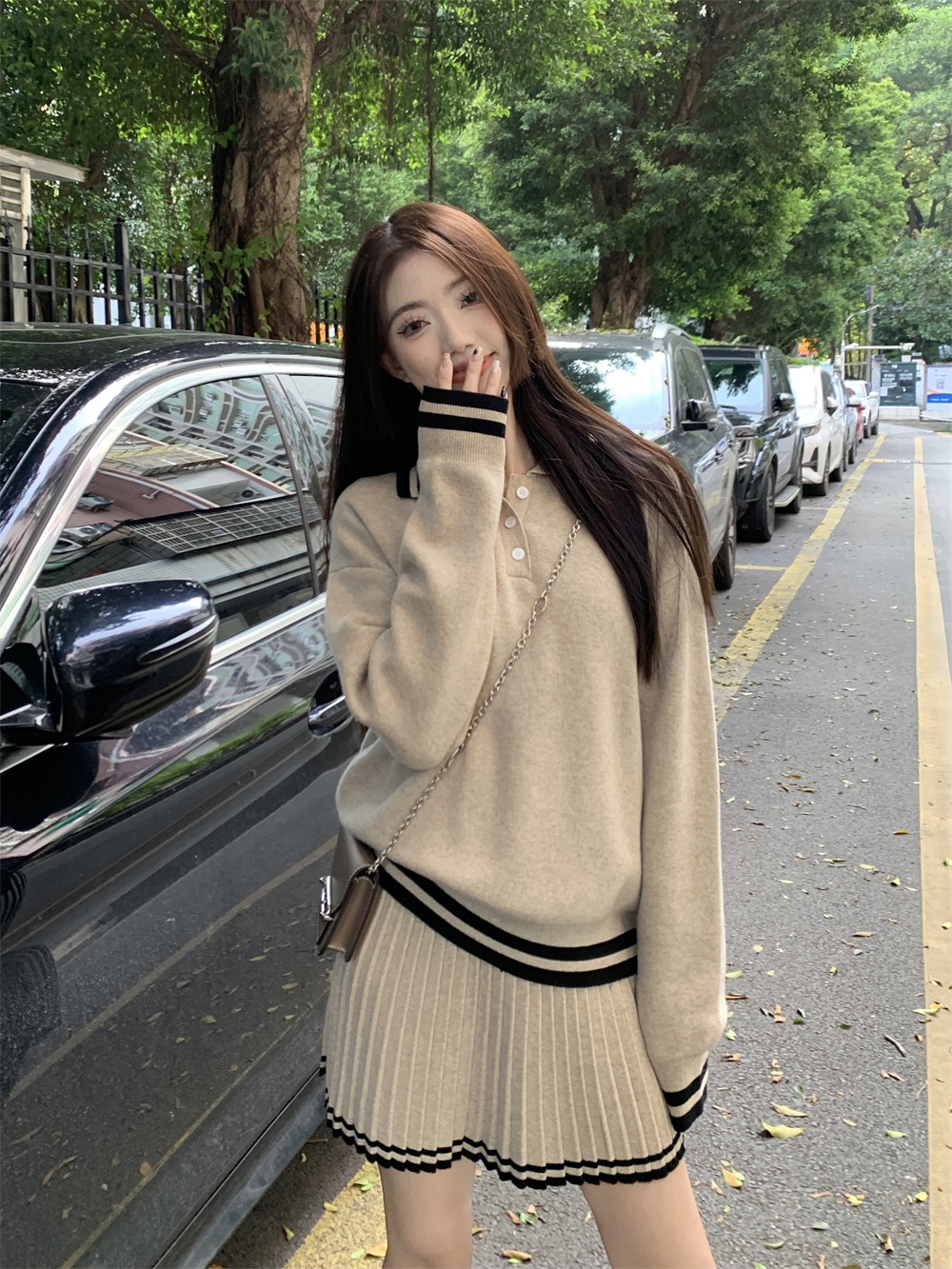 JMA-1011 美拉德穿搭秋季韩版POLO领宽松显瘦针织毛衣+高腰显瘦百褶半身裙