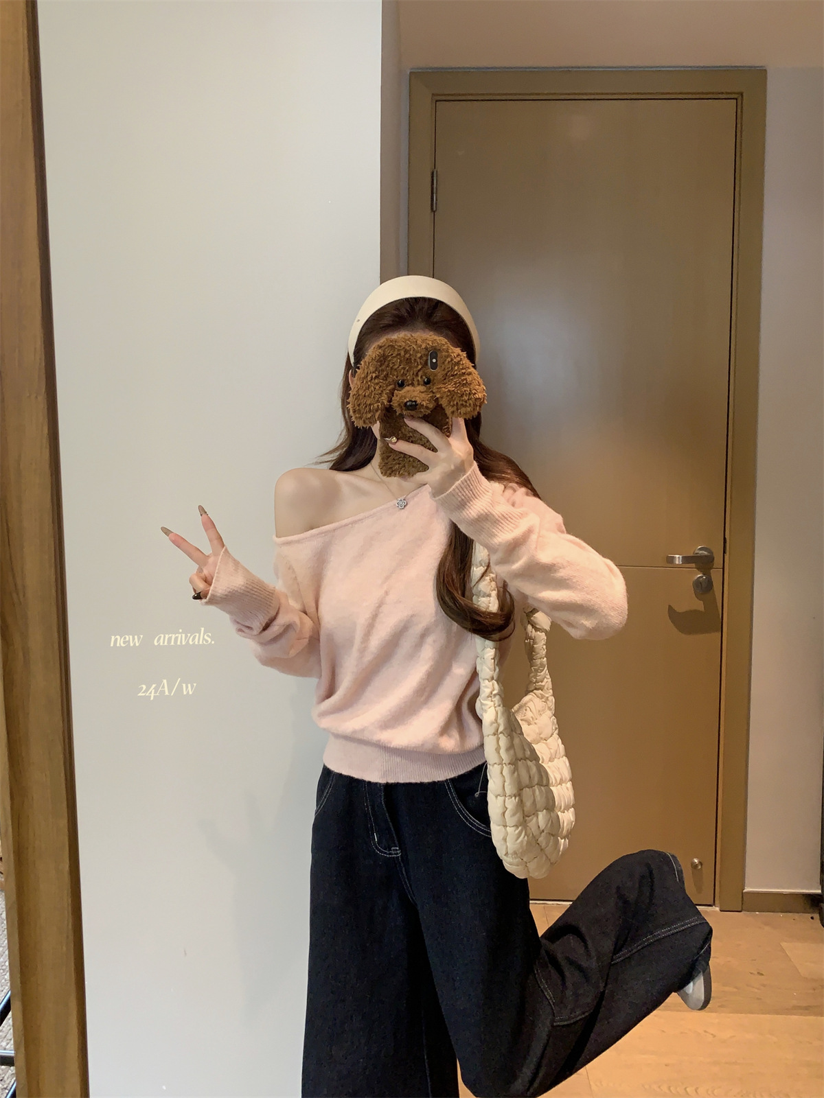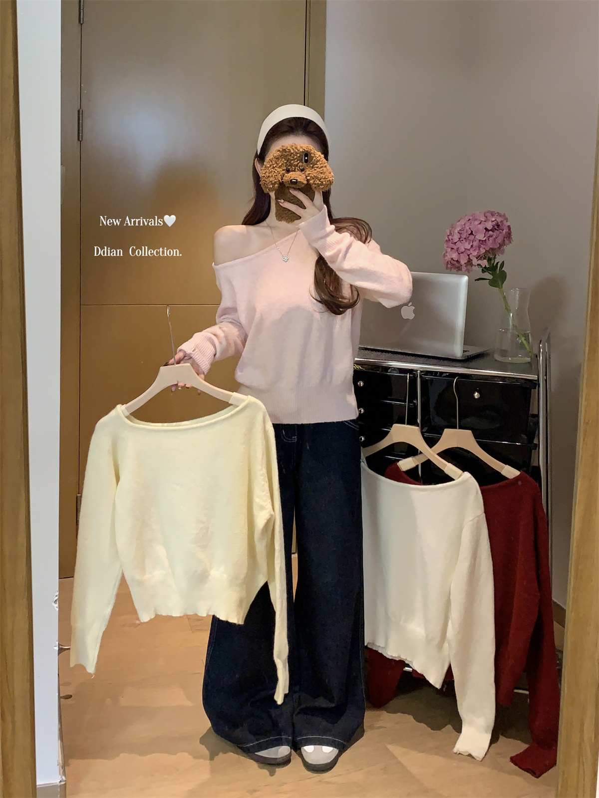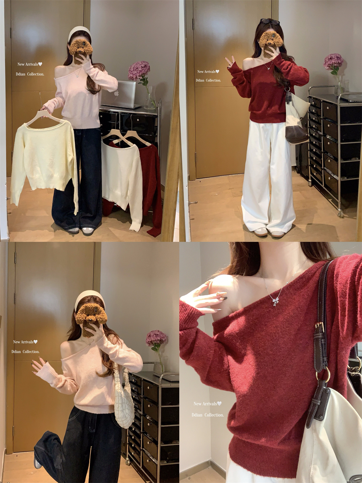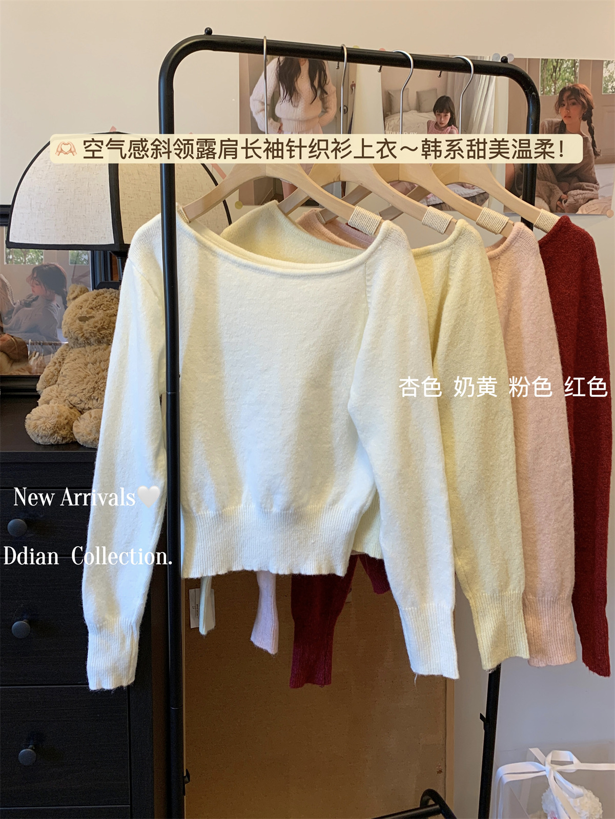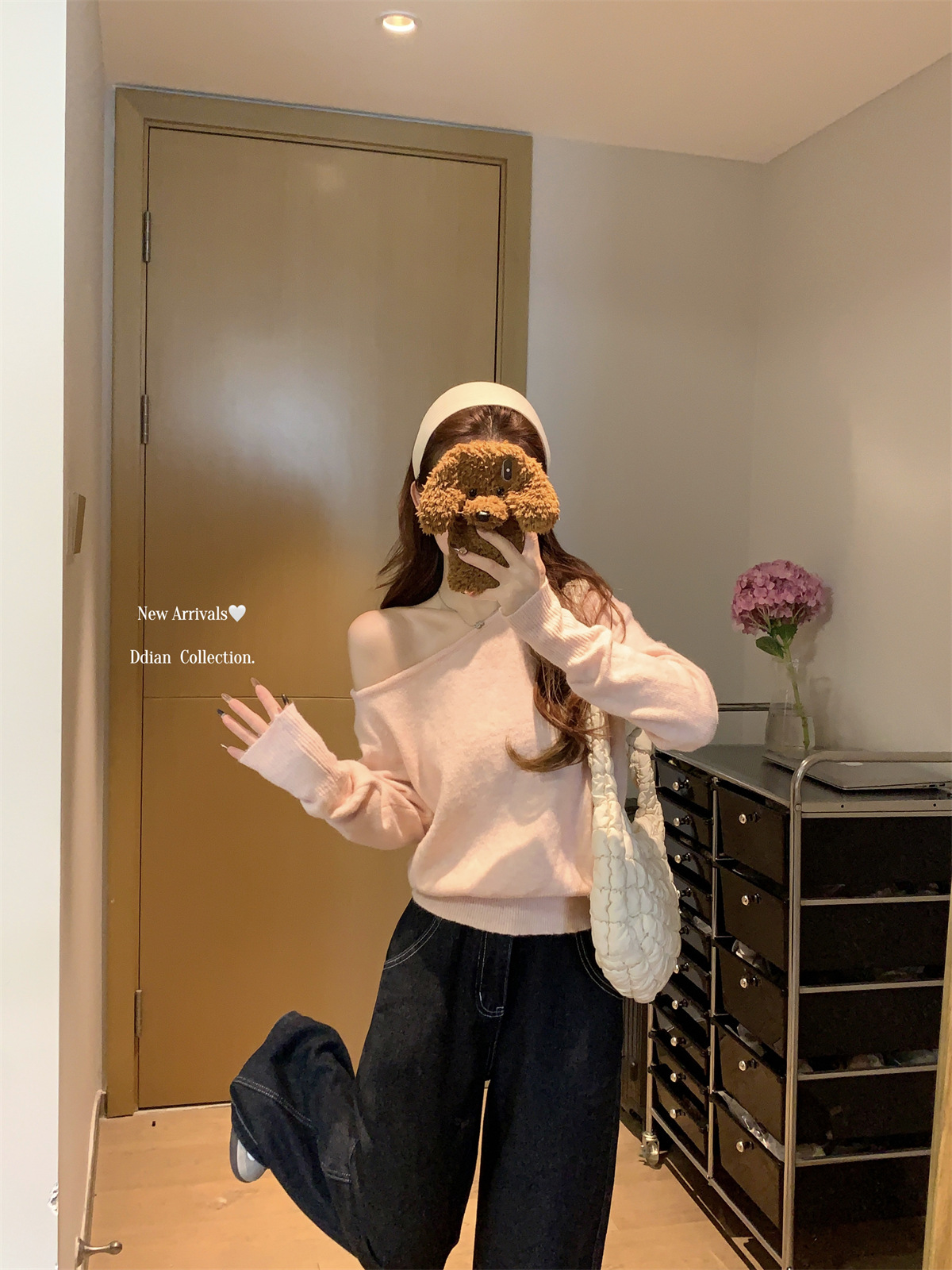 JMA-1019 实拍 秋冬韩版气质斜肩甜美百搭6羊毛针织长袖打底上衣毛衣